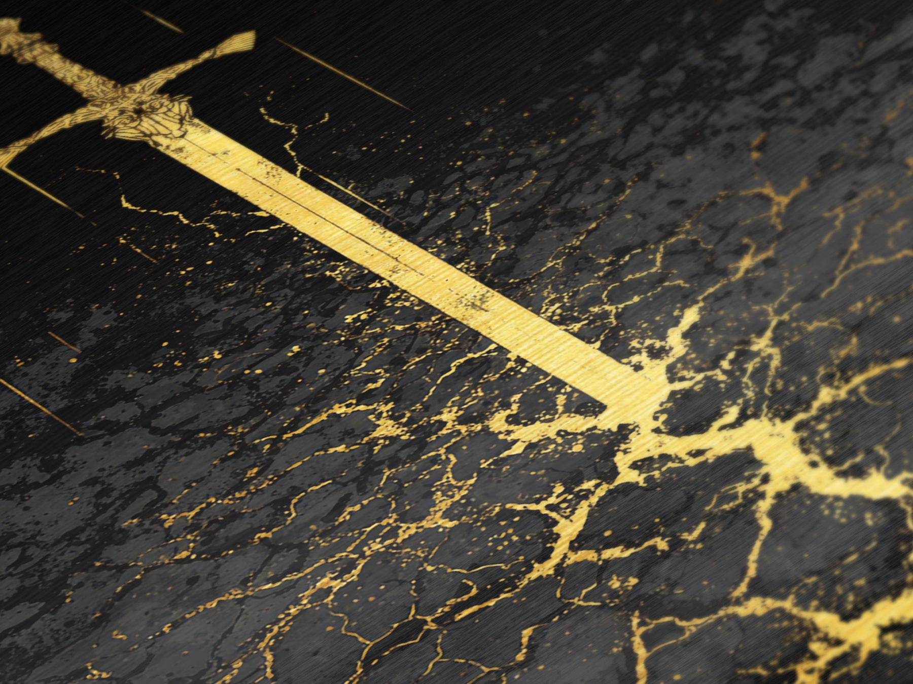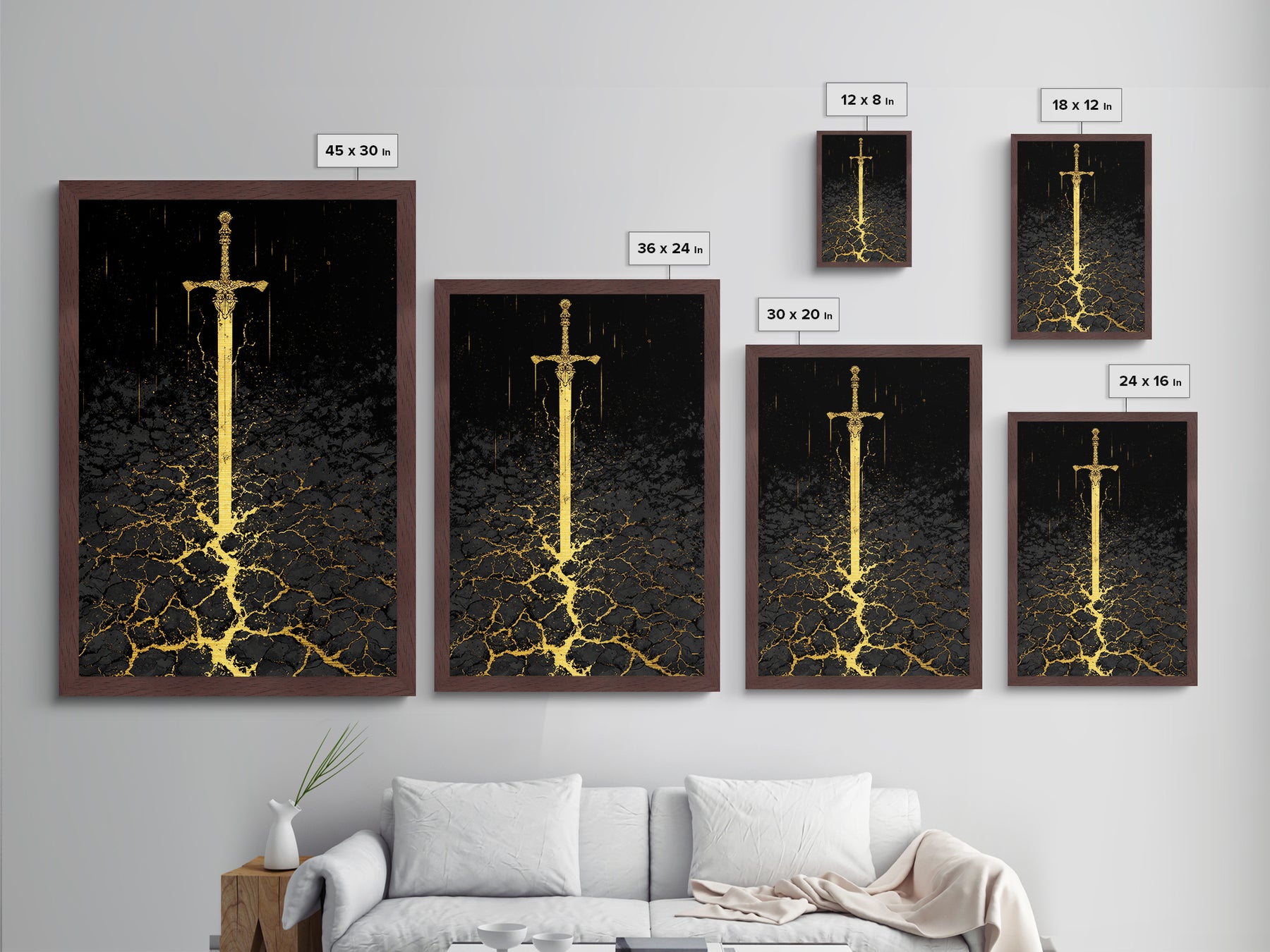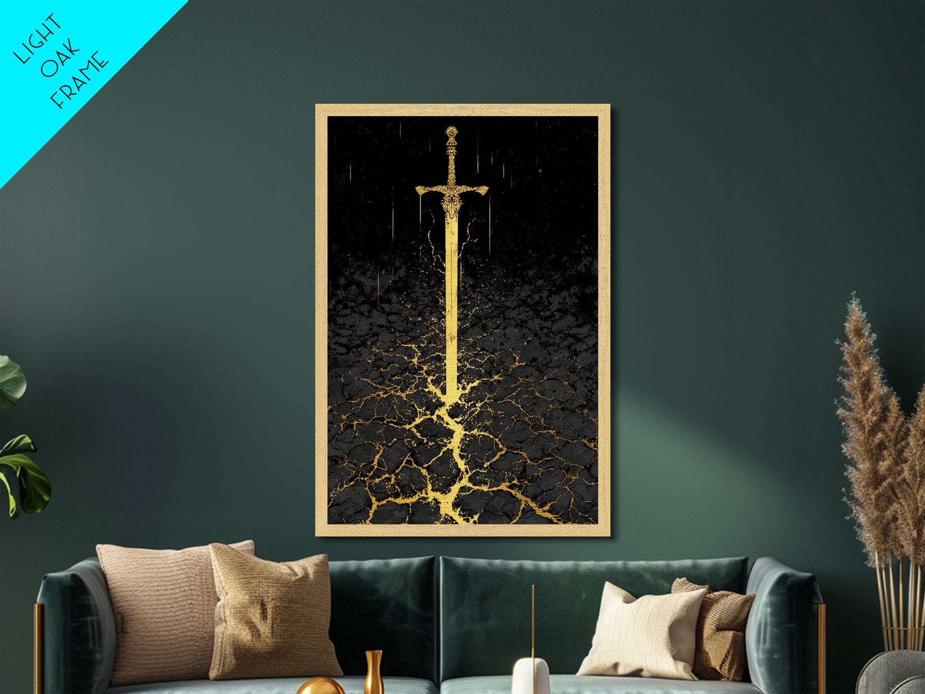 Norse Warrior Sword Metallic Gold Art Metal Art | Viking Mythology Weapon Wall Decor Dad Gift | Office Art with Natural Wood Frame