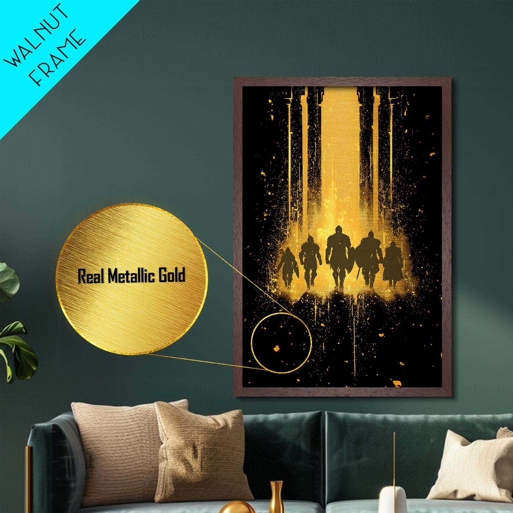 Norse Warriors Metallic Gold Art, Viking Metal Art Wall Decor with Epic Battle Silhouettes, Man Cave Gift framed in real wood