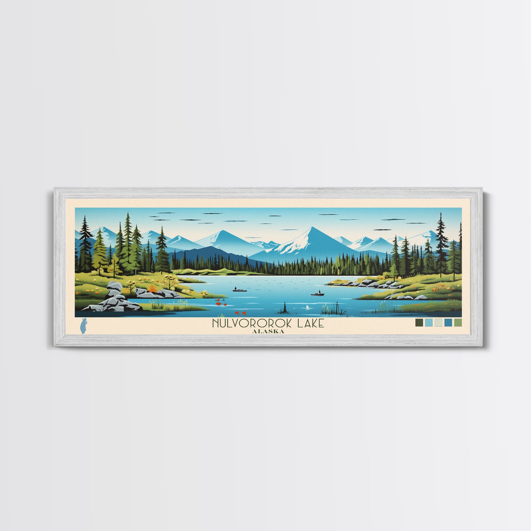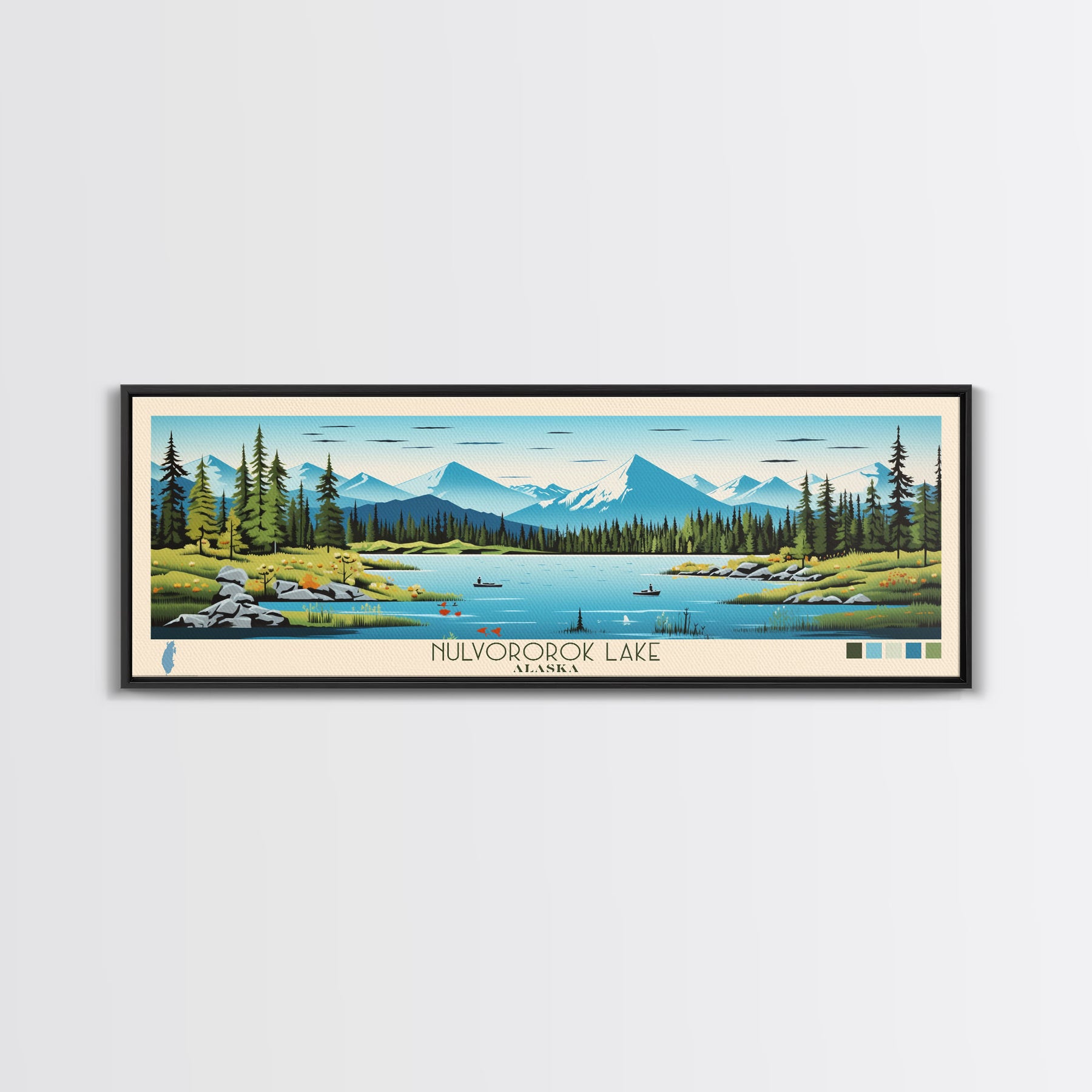 Nulvororok Lake, Alaska Framed Canvas Print, Panoramic Wall Art, Midcentury Modern, Pop Art, Home Decor, Travel Poster, Living Room Art