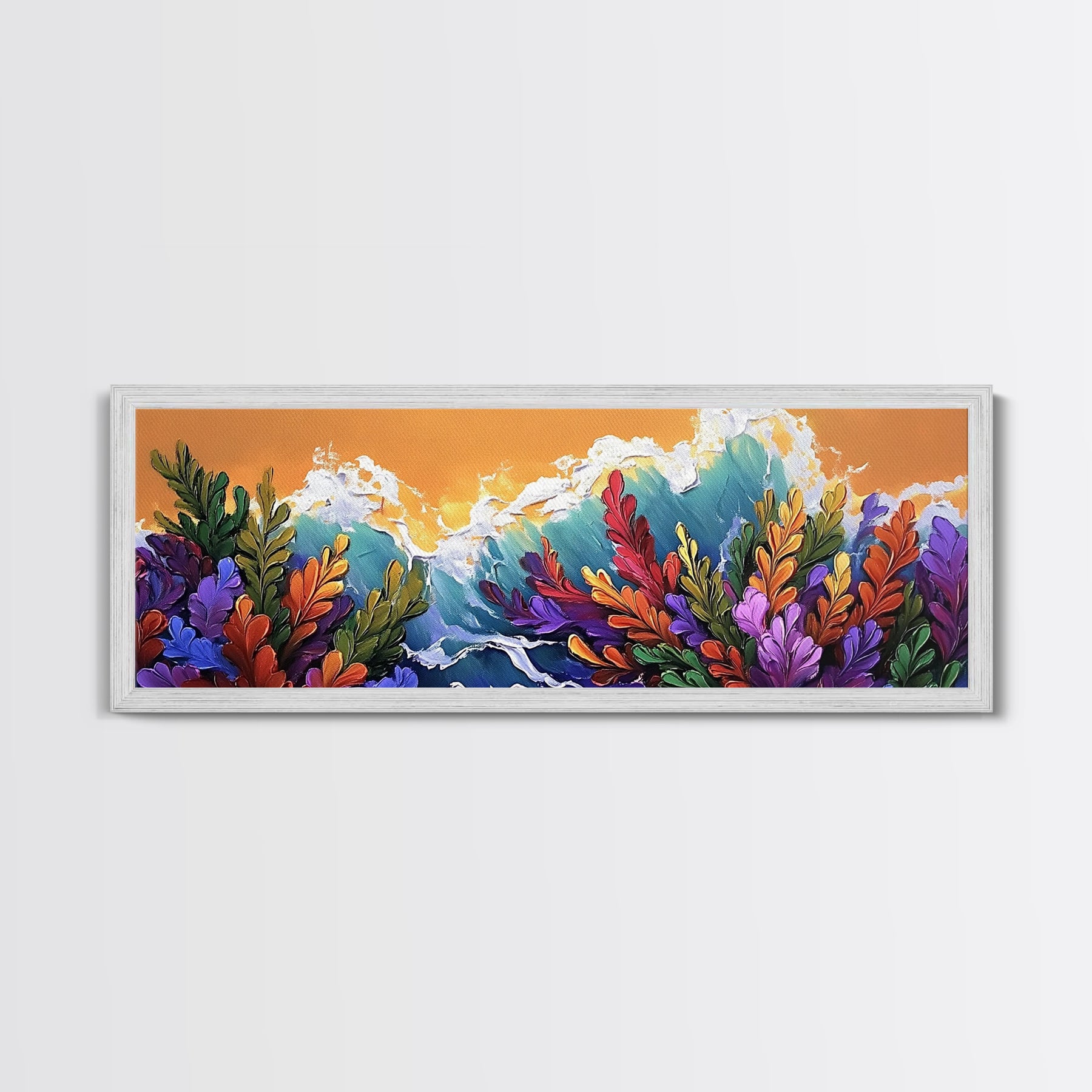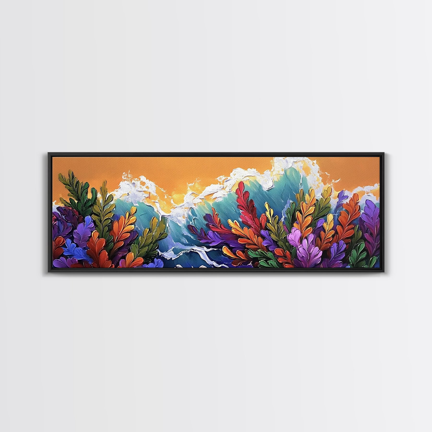 Ocean Blooms, Sunset Waves, Colorful Florals, Seaside Garden, Framed Canvas Print tropical living room wall art, coastal print
