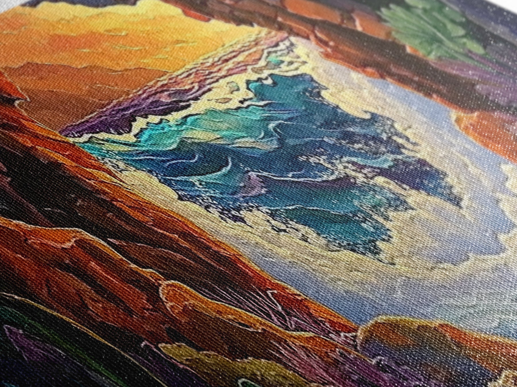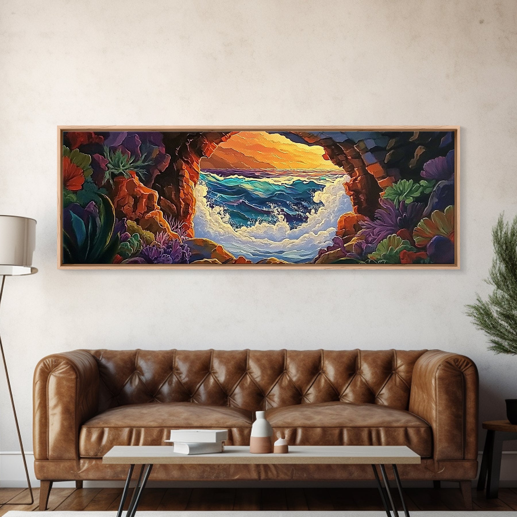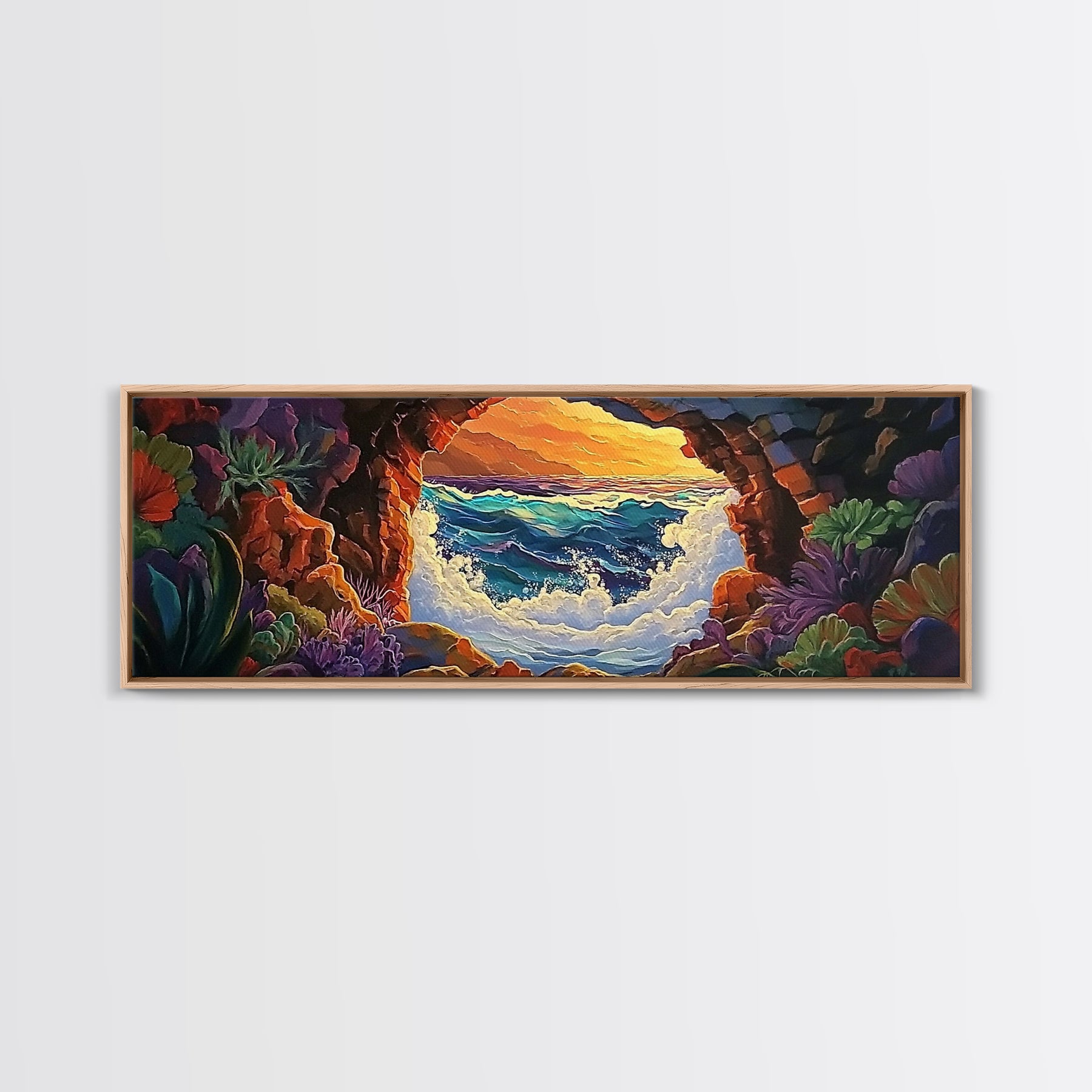 Ocean Cave View, Sunset Waves, Coastal Decor, Tropical Art, Framed Canvas Print, Beach House Wall Art, Vibrant Seascape, Boho Style