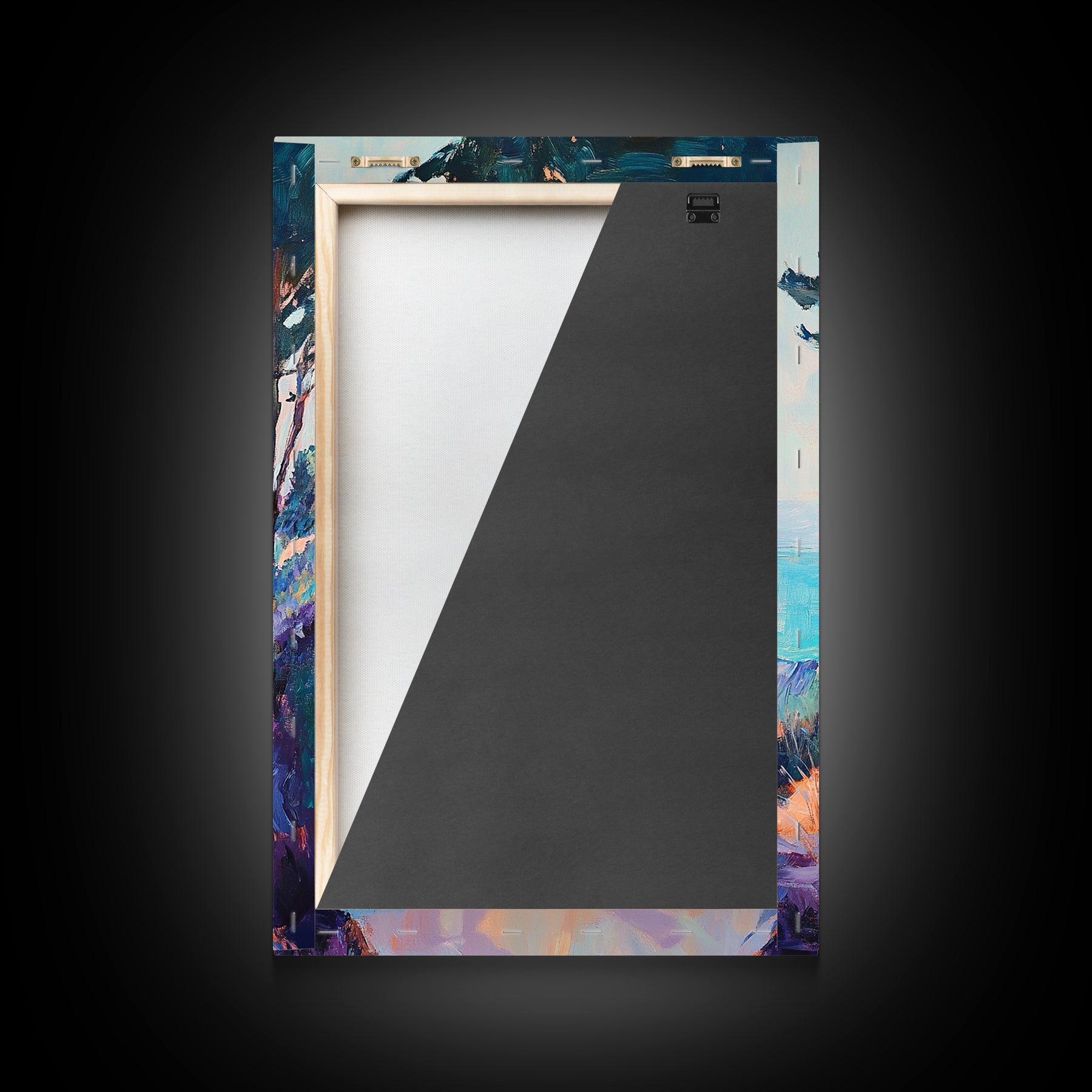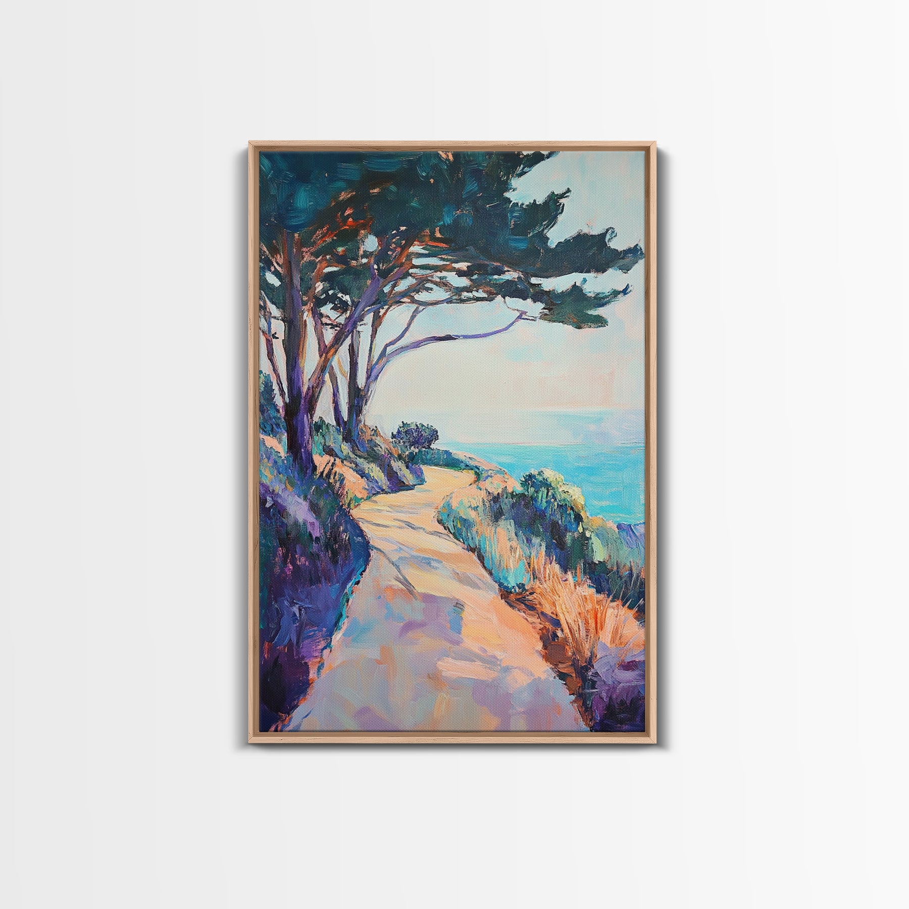Ocean Cliff Path, coastal landscape art, pine tree art, rustic wall art, blue and green wall art, framed canvas, above bed wall art
