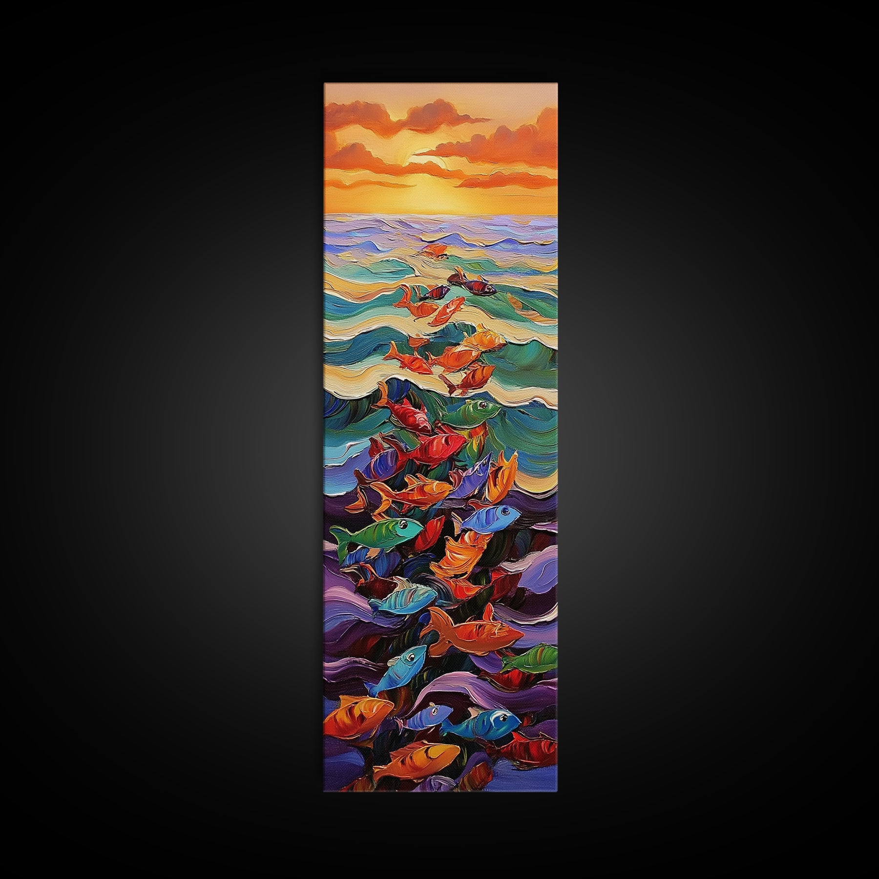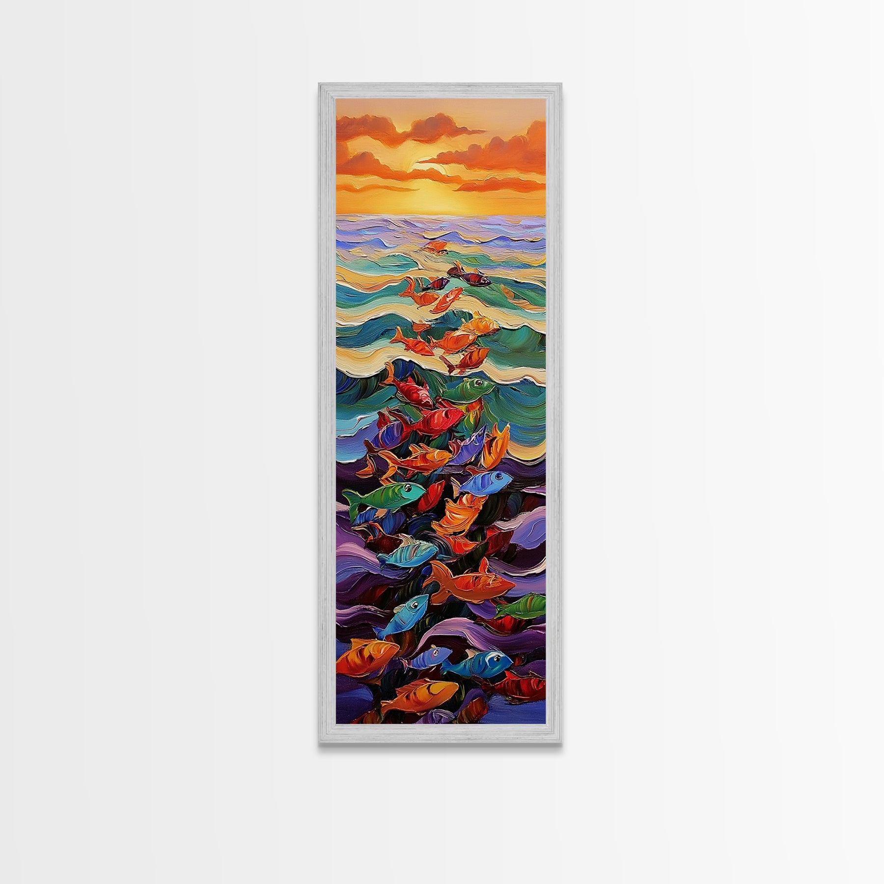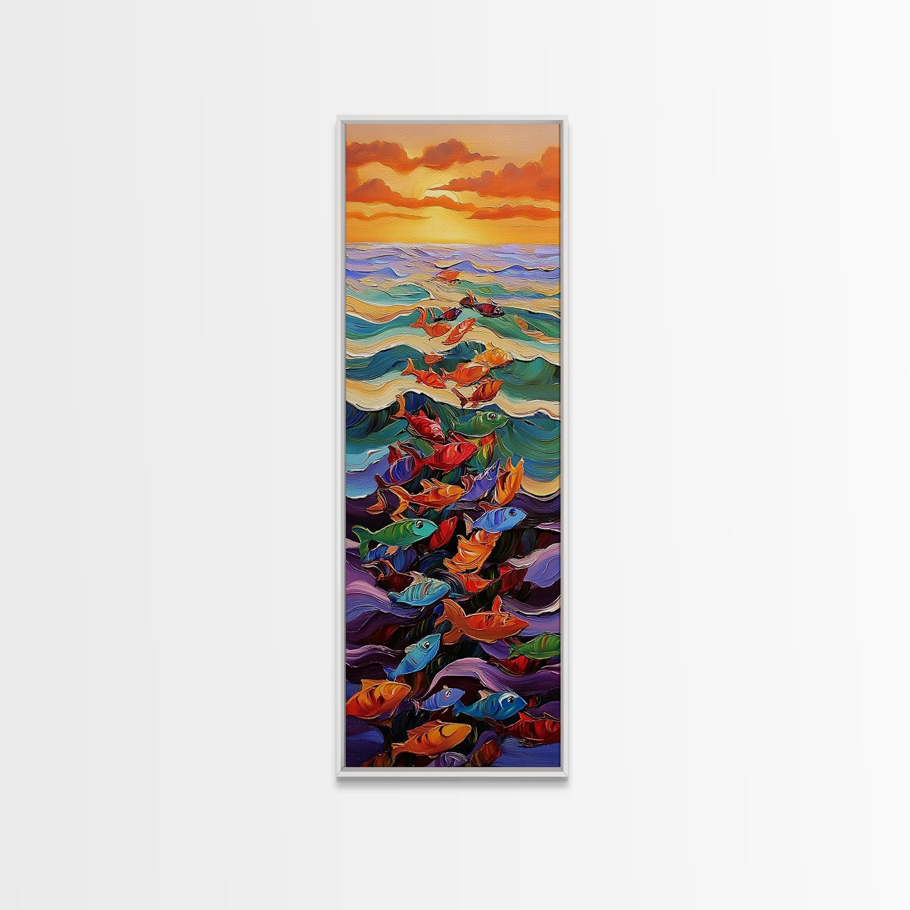 Ocean Journey, Colorful Fish, Sunrise Waves, Framed Canvas Print, vibrant coastal fish painting, kids room or nautical beach house art