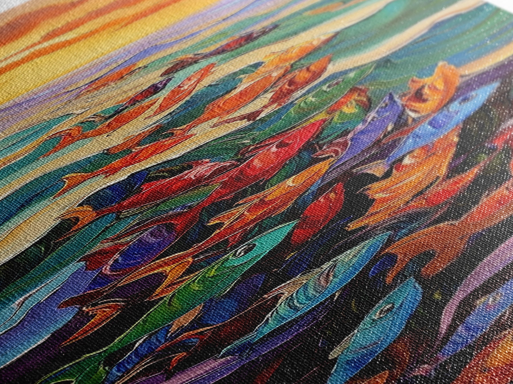 Most of our canvases are made in the USA, with the exception of canvases ordered with the light oak unstained frames, and any large canvases (24x48, 30x60, 16x48 and 20x60) ordered WITH a frame. These are temporarily made in and shipped from Europe, while we try to find a more consistent supplier in the USA.