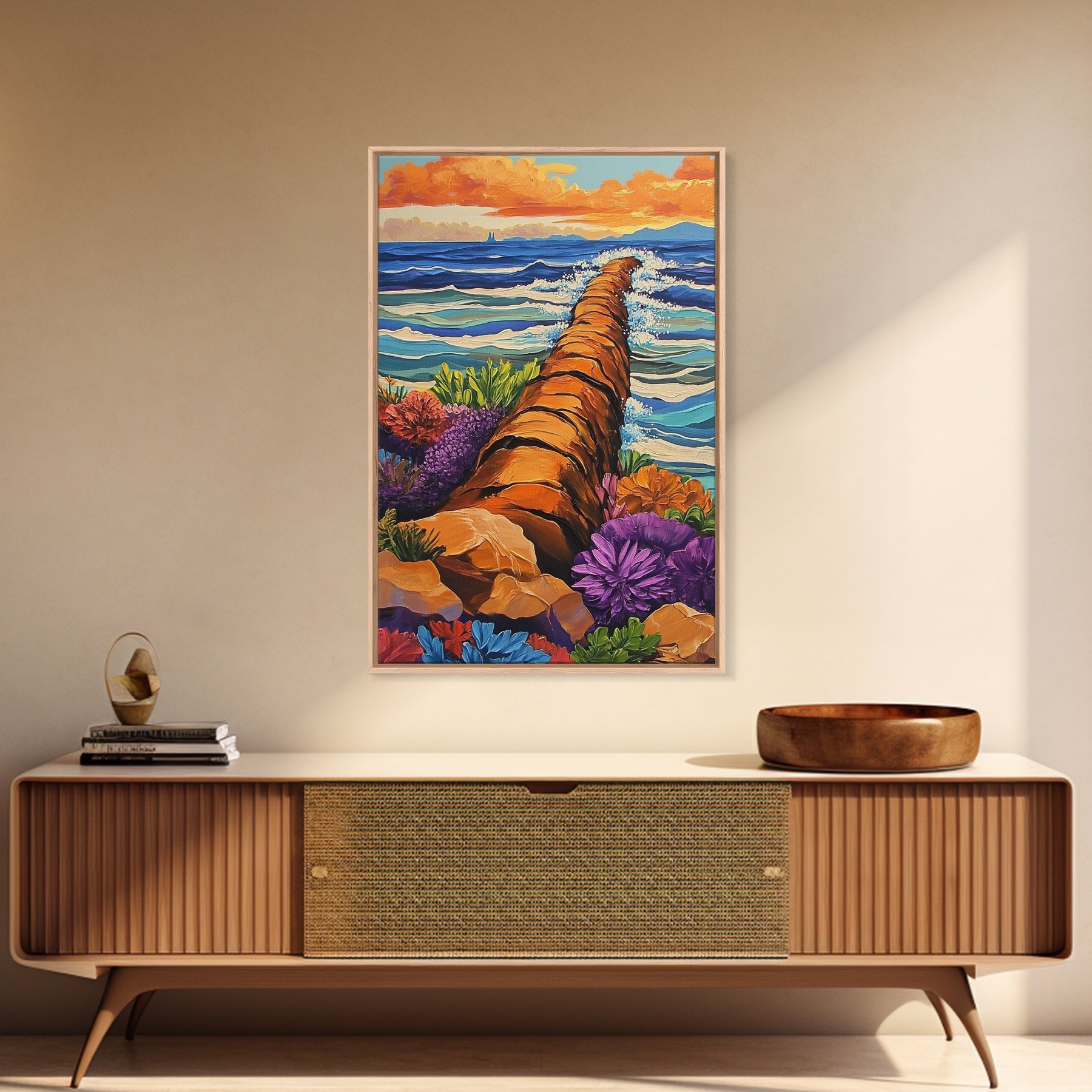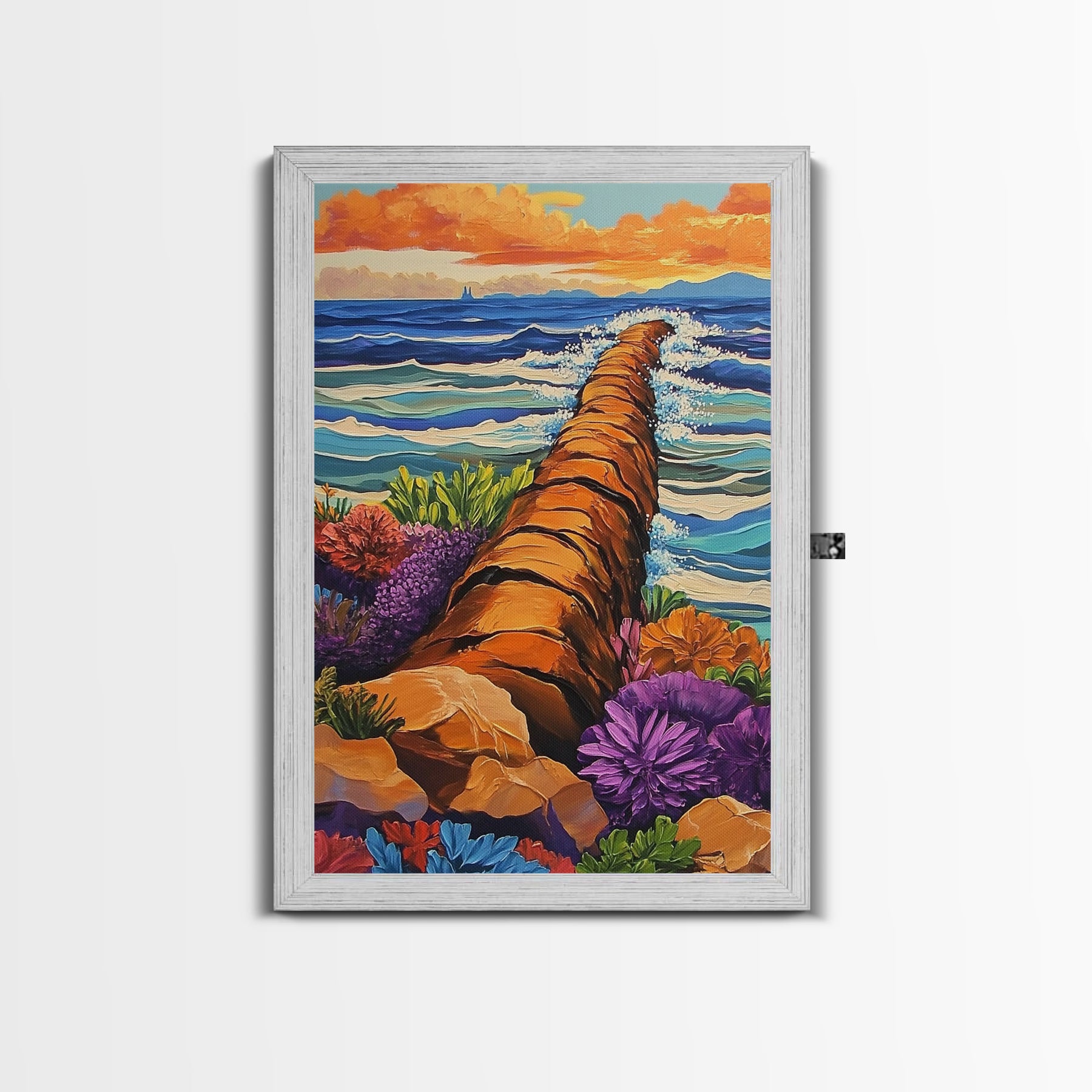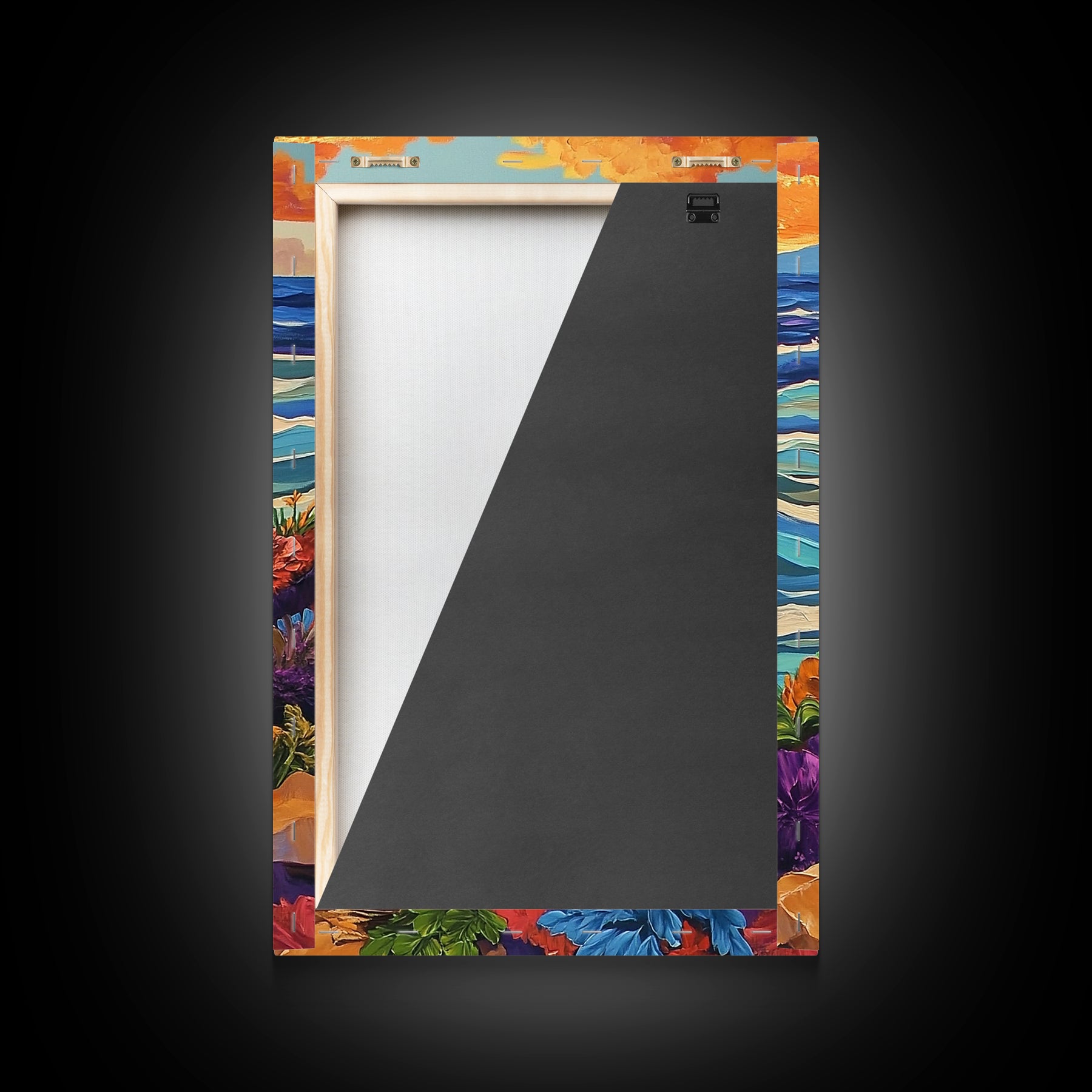 Ocean Path, Wildflowers, Shoreline, Framed Canvas Print coastal path wall art, ocean wildflower painting, beach garden style, hallway decor