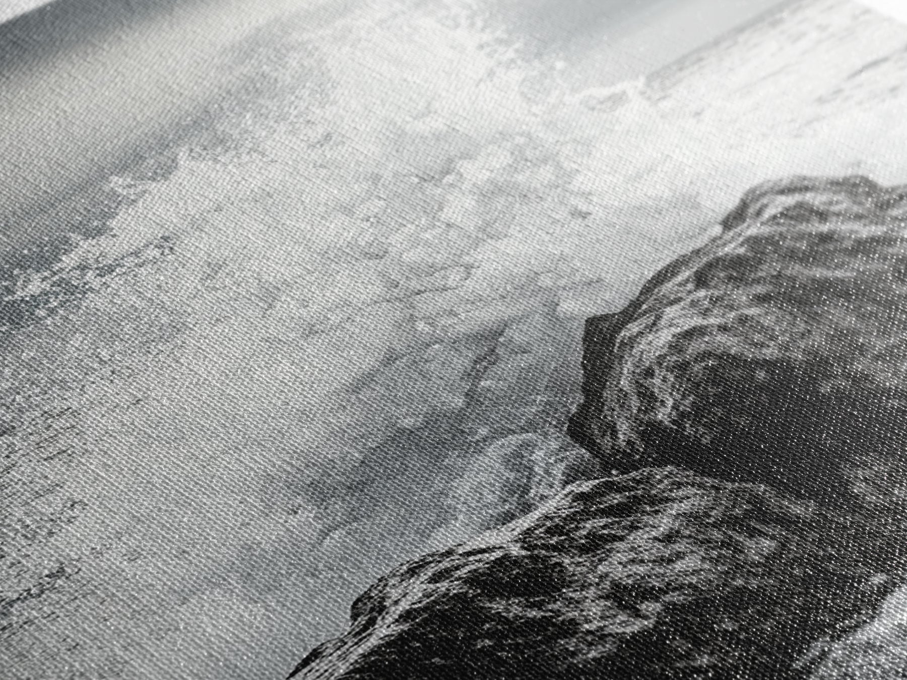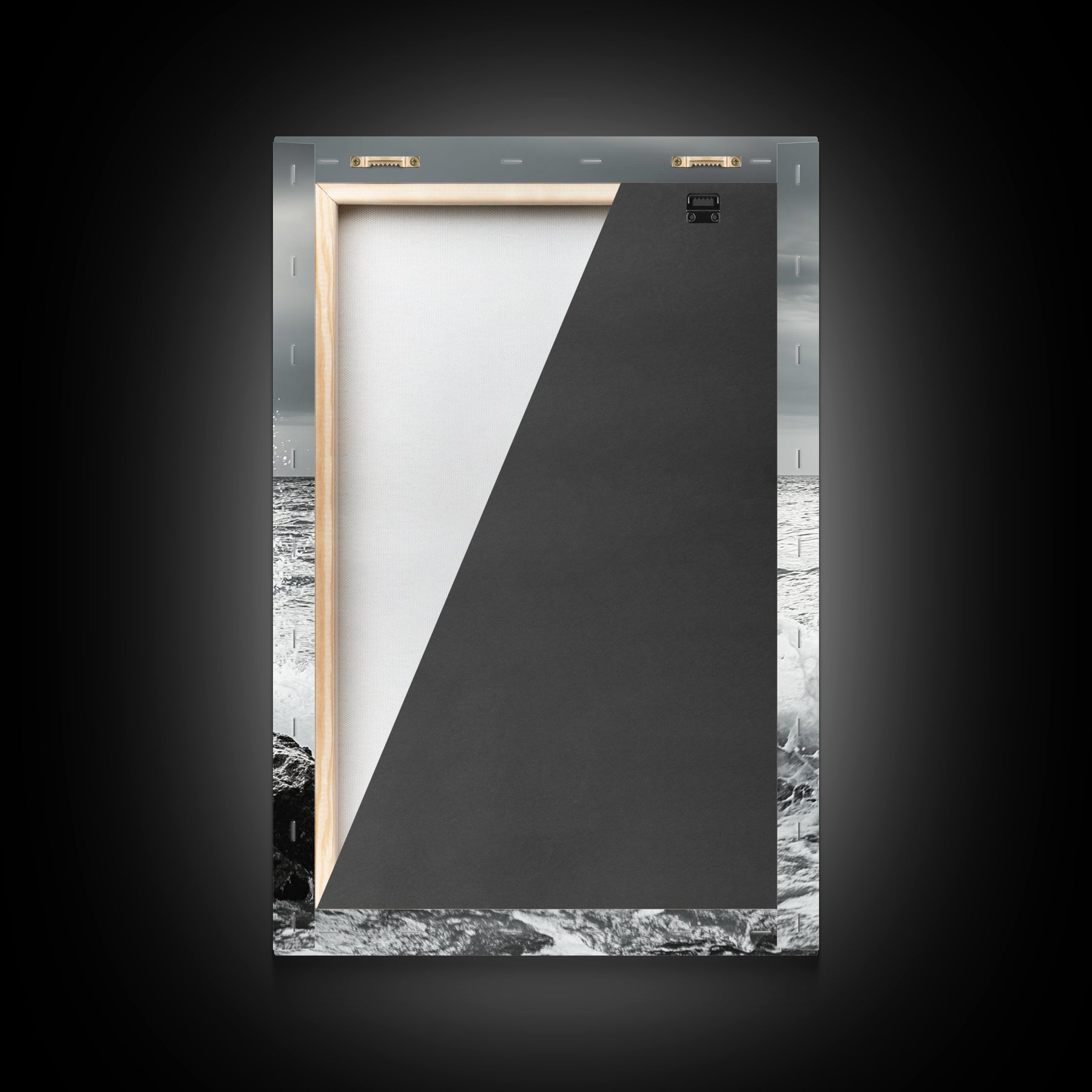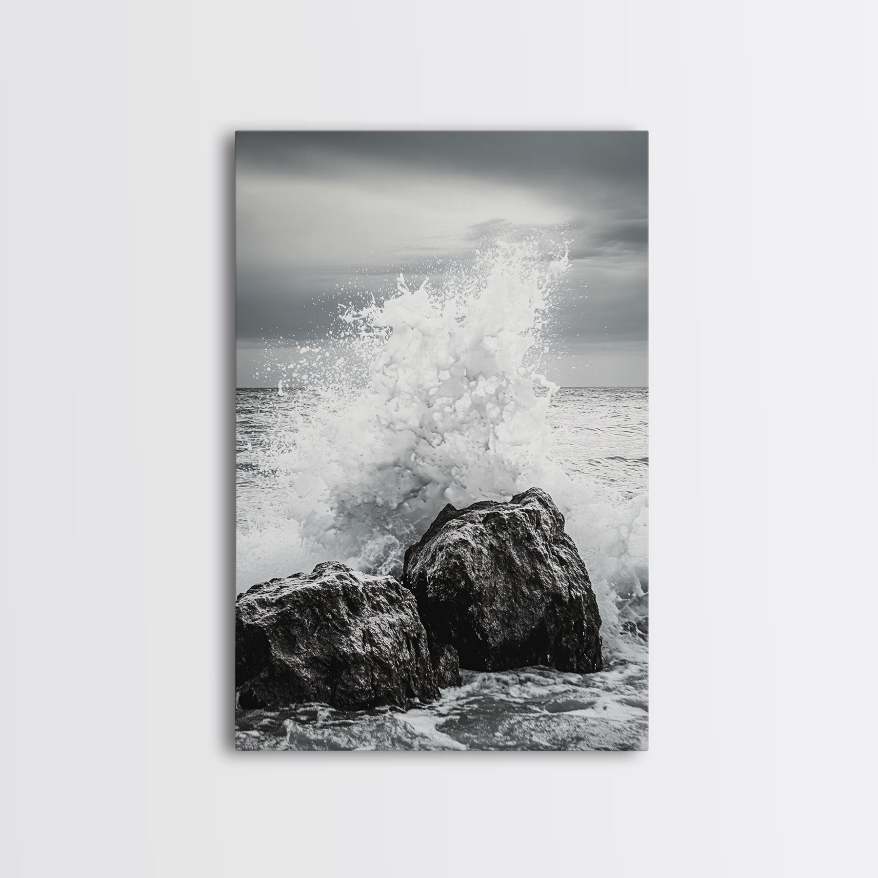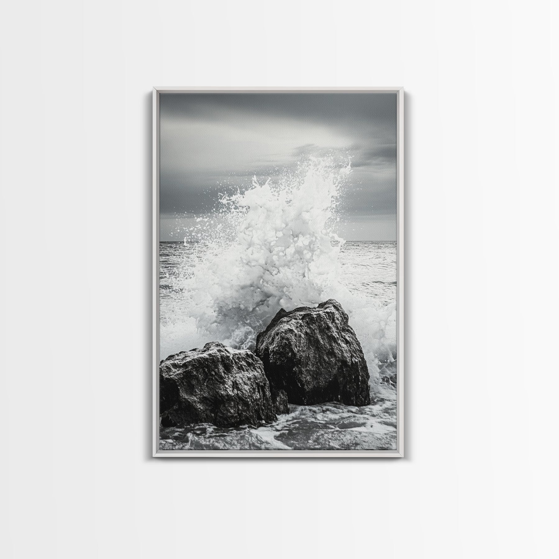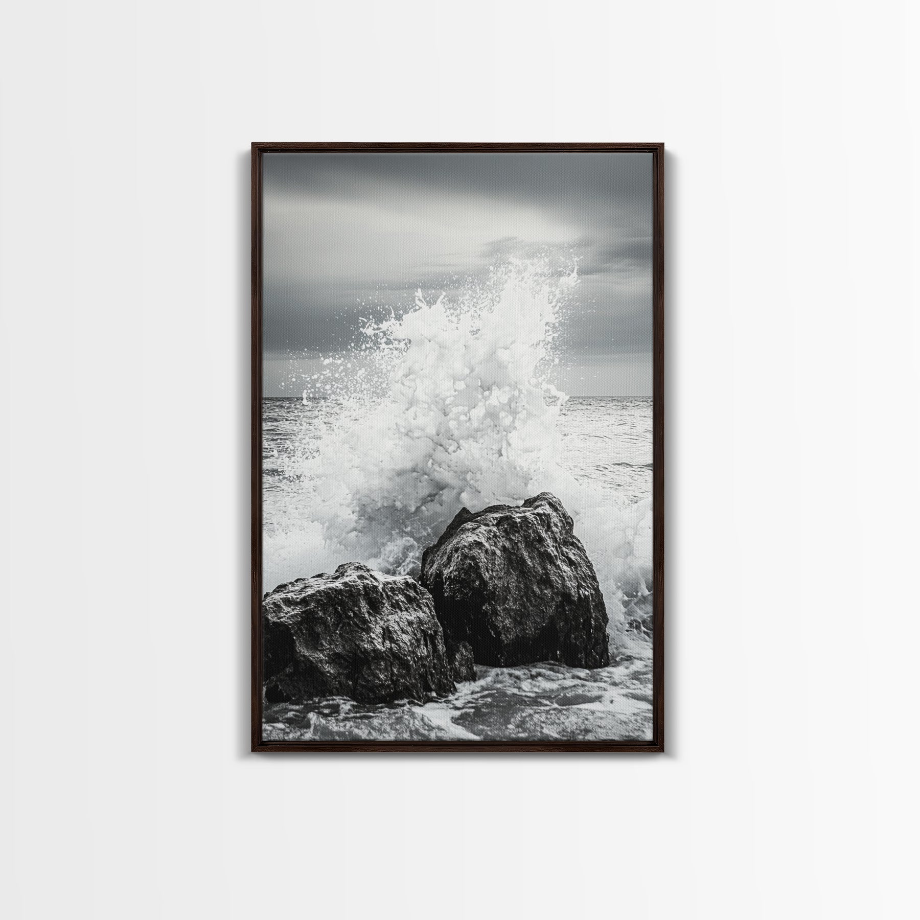 Ocean Splash, Rocky Coast, Dramatic Seascape, Monochrome Power, Framed Canvas Print, Coastal Wall Art, Entryway or Office Decor