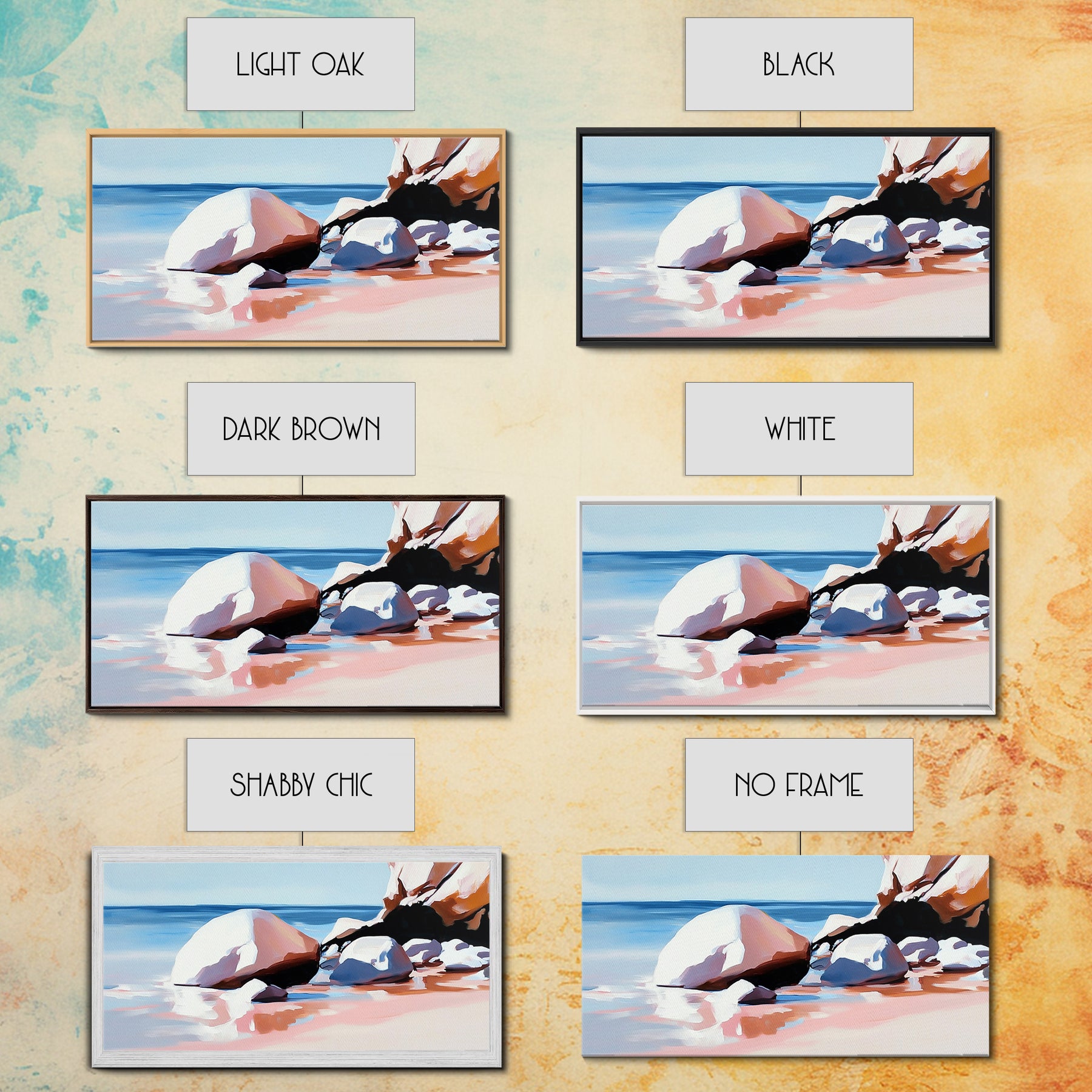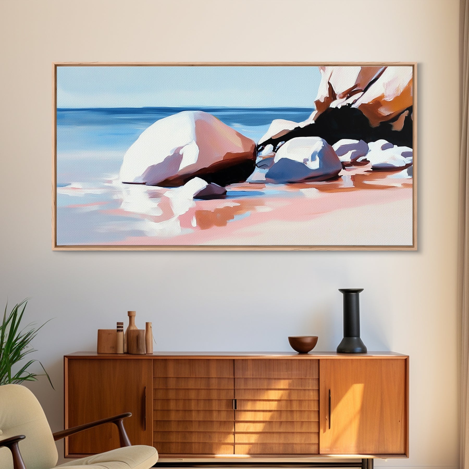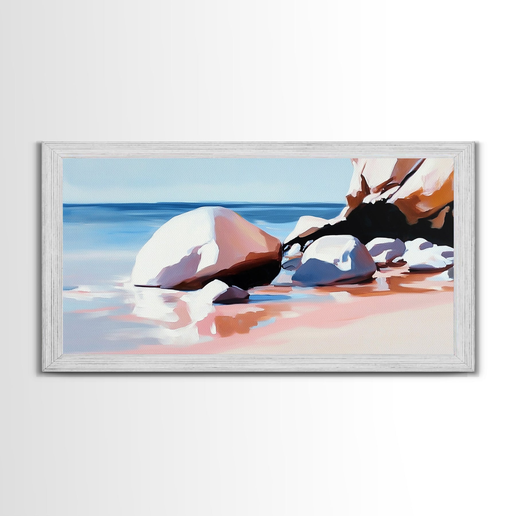 Ocean Stones, Beach Scene, Framed Canvas Print, Coastal Wall Art, Pastel Seascape, Nautical Decor, Serene Artwork, Bedroom Wall Art