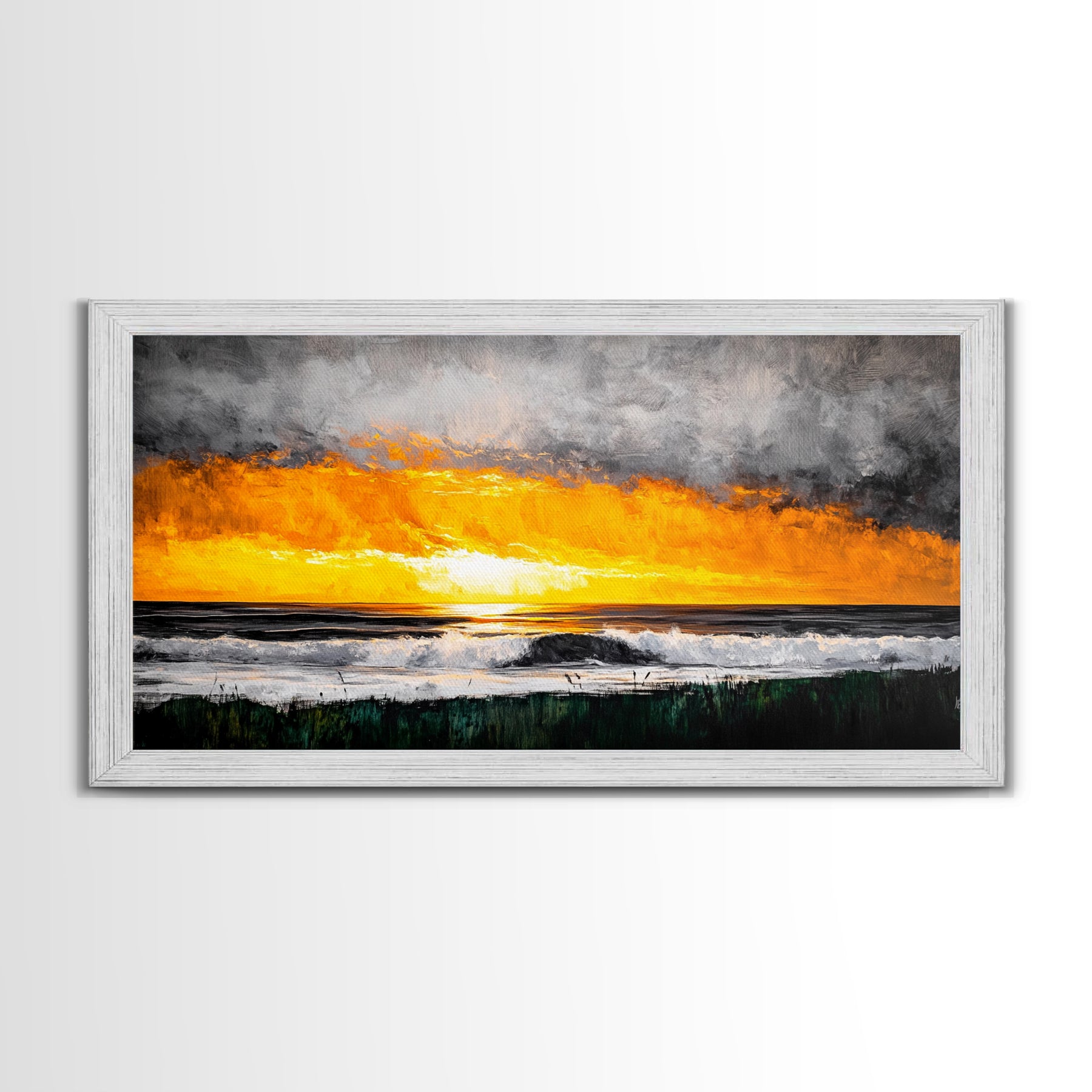 Ocean Sunset, Dramatic Clouds, Beach Waves, Framed Canvas Print, Coastal Wall Art, Living Room Art, Large Wall Decor