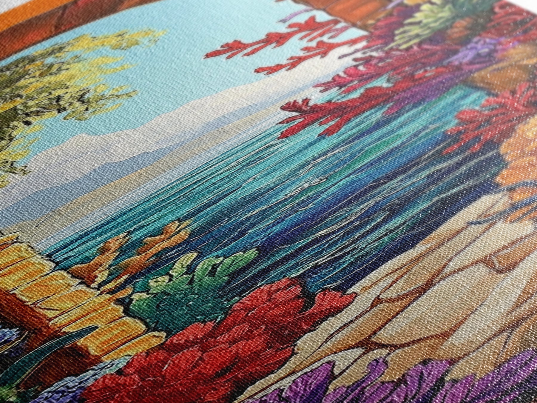 Most of our canvases are made in the USA, with the exception of canvases ordered with the light oak unstained frames, and any large canvases (24x48, 30x60, 16x48 and 20x60) ordered WITH a frame. These are temporarily made in and shipped from Europe, while we try to find a more consistent supplier in the USA.