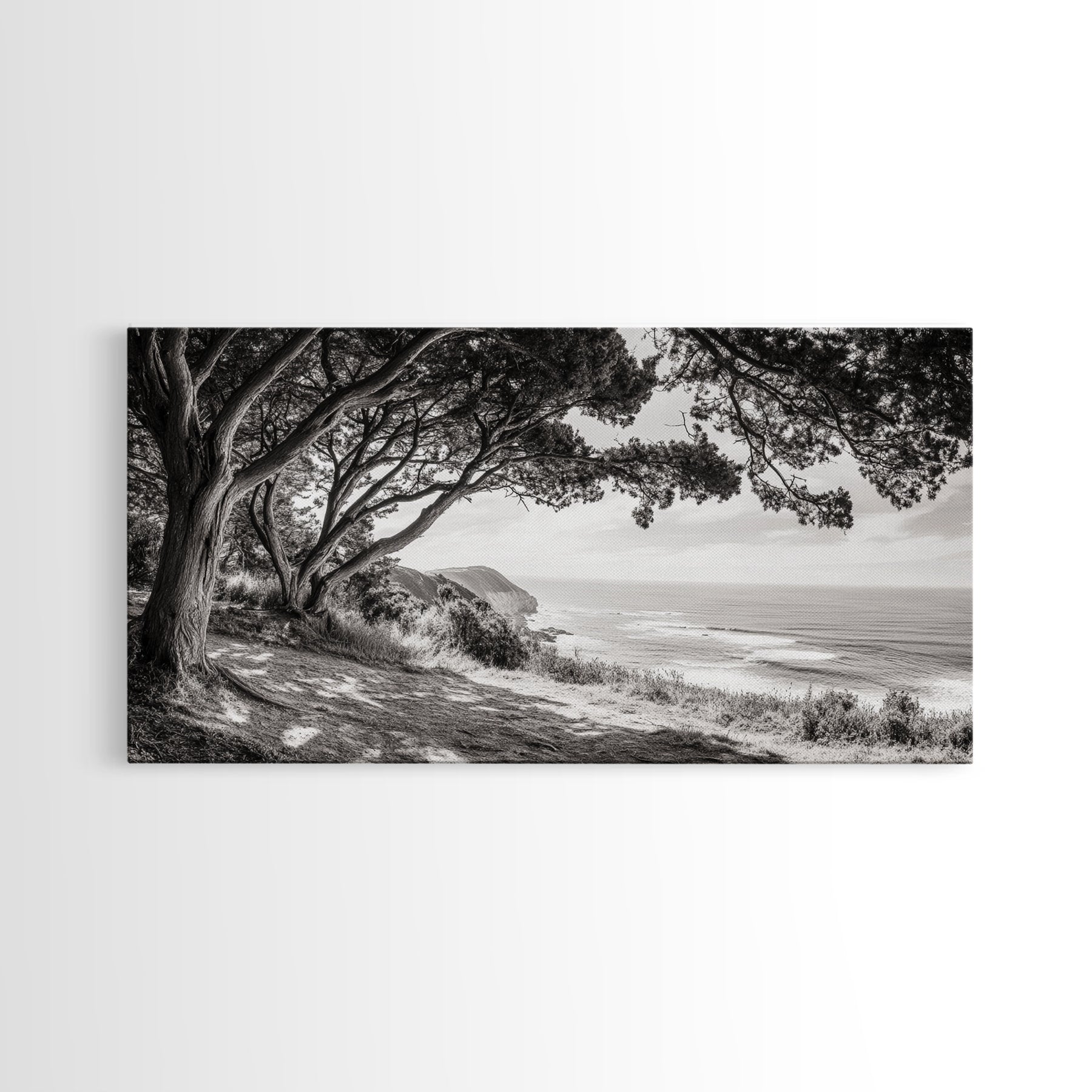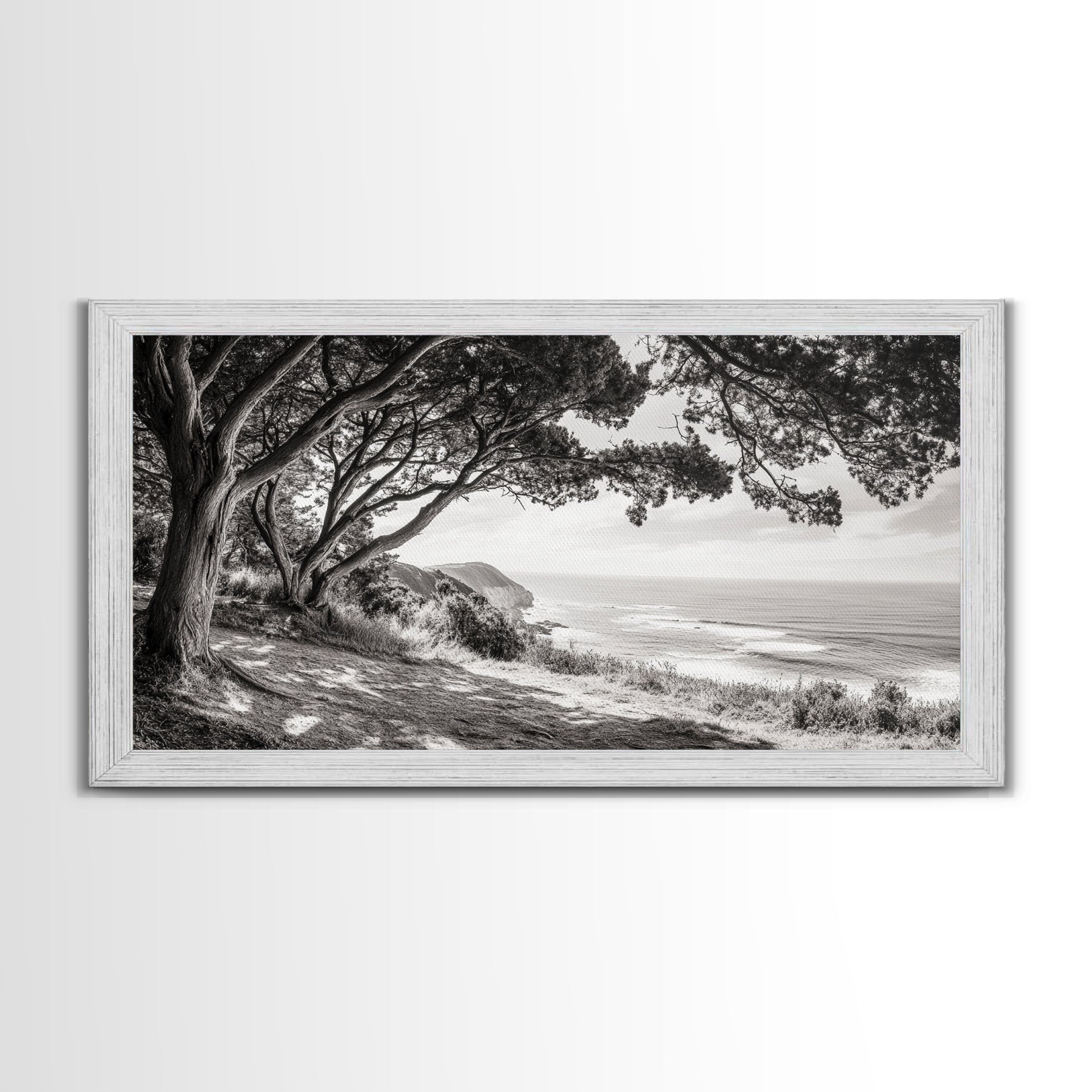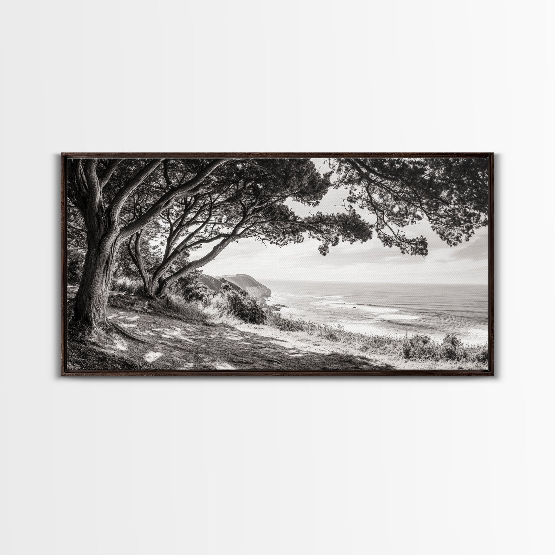 Ocean View, Coastal Trees, Cliffside Vista, Light and Shadows, Framed Canvas Print, landscape wall art, modern beach decor, boho living room