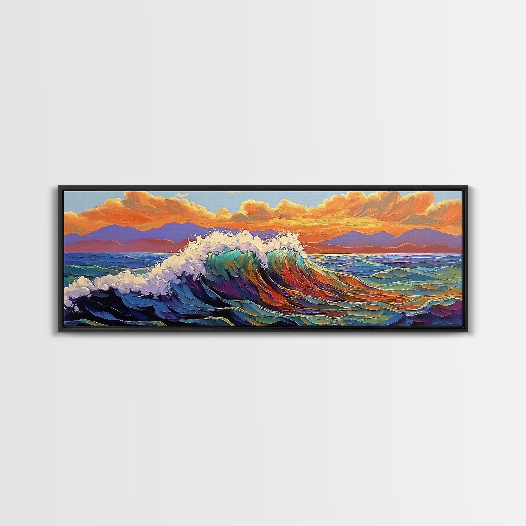 Ocean Wave Sunset, Vibrant Seascape Painting, Tropical Horizon Scene, Framed Canvas Print, Coastal Wall Art, Nautical Decor