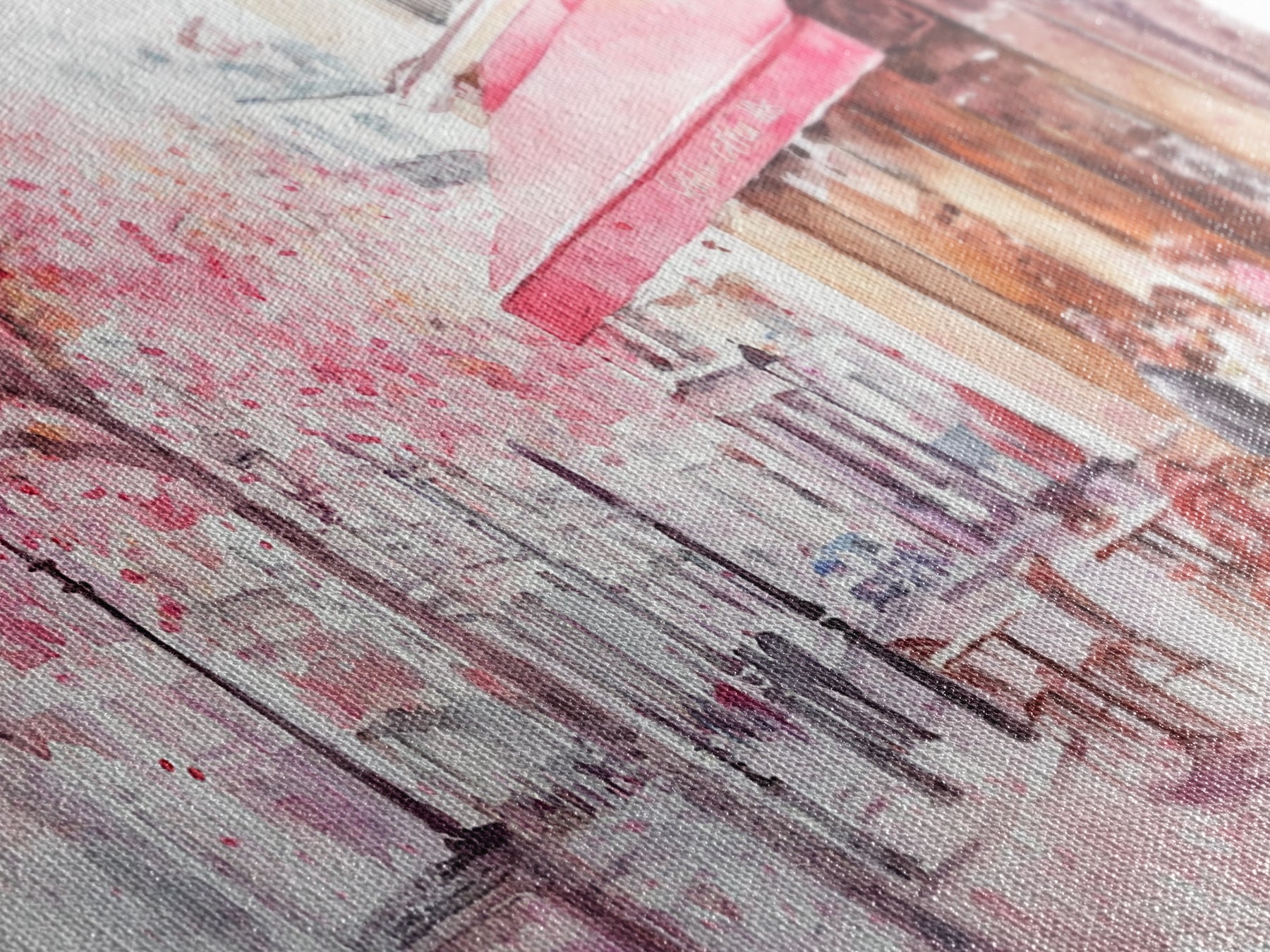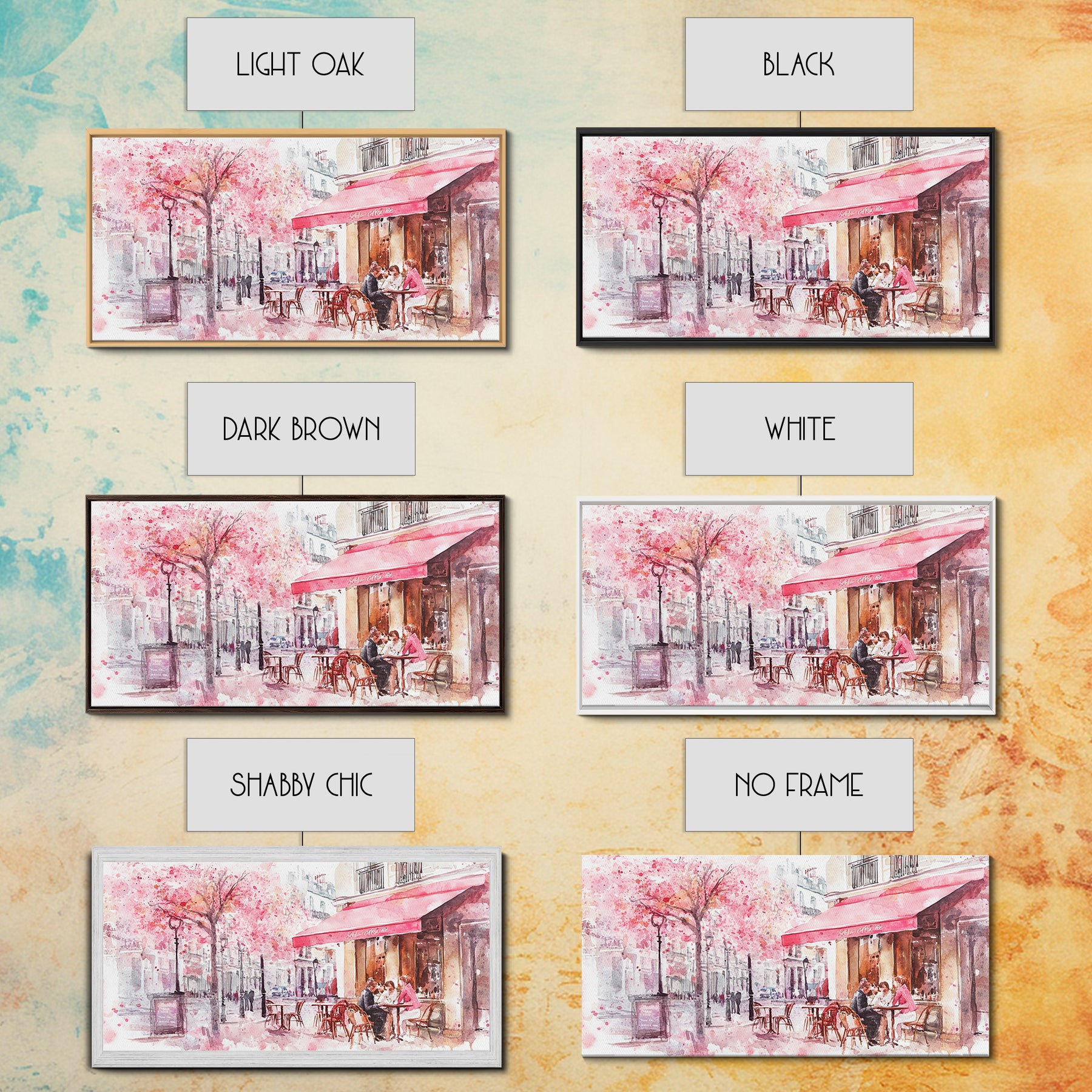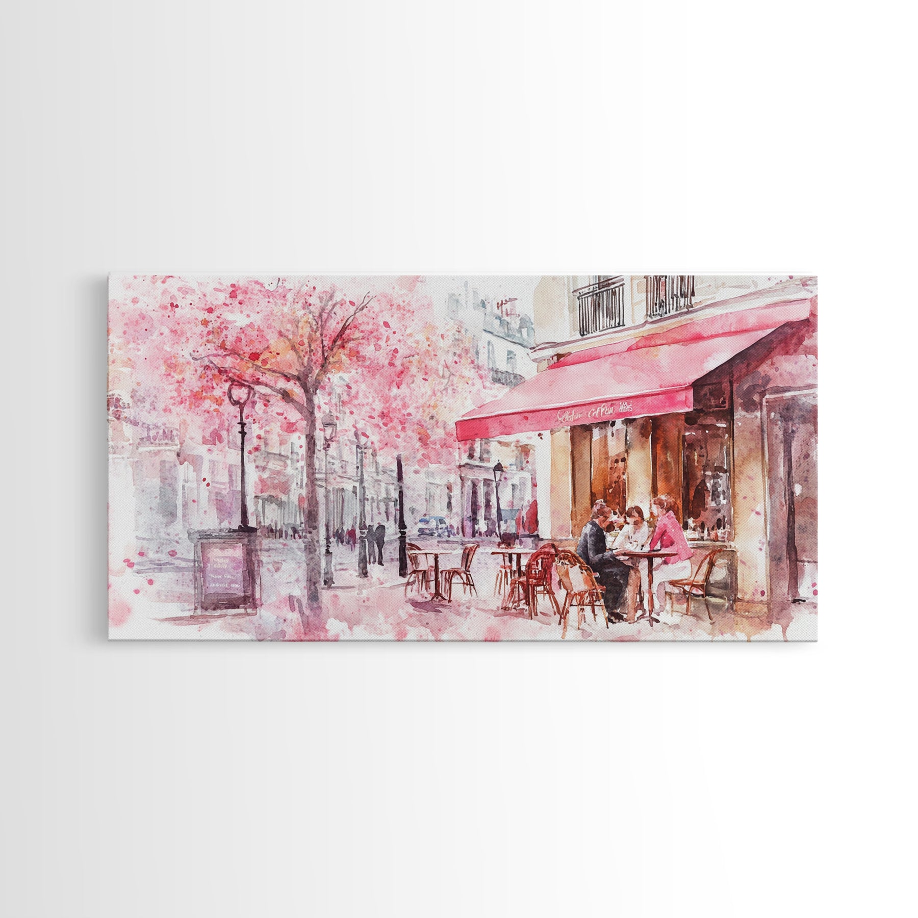 Parisian Café Scene Framed Canvas Print, Cherry Blossom Painting, European Street Art, Romantic Wall Art, Living Room Decor