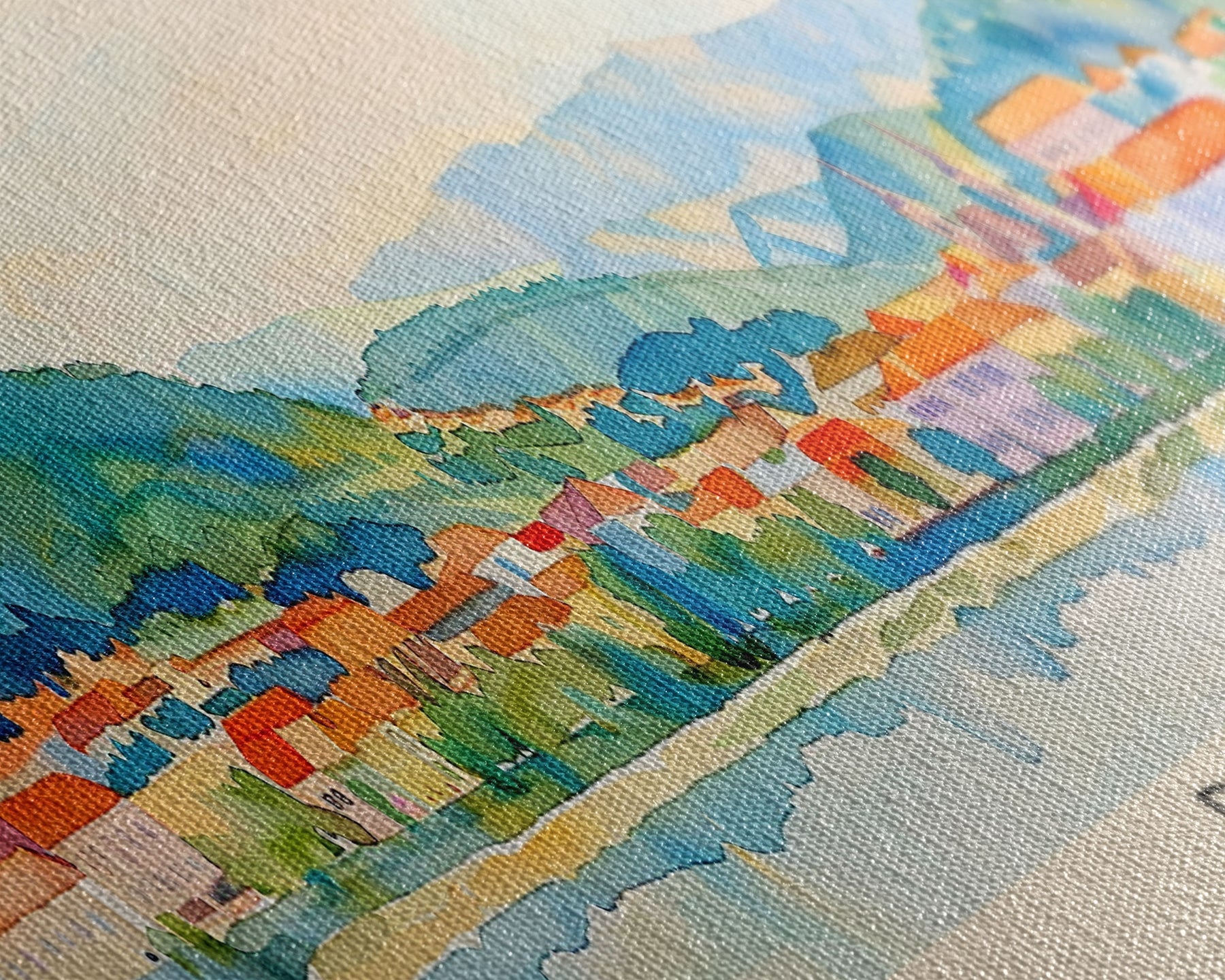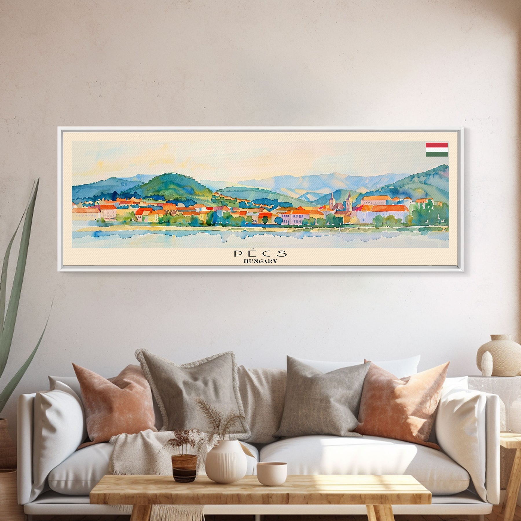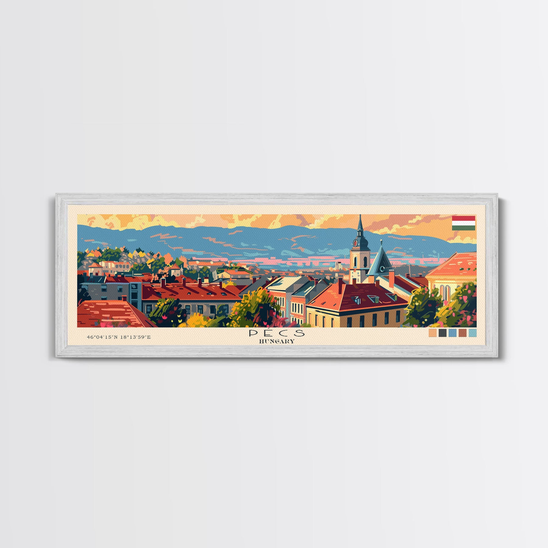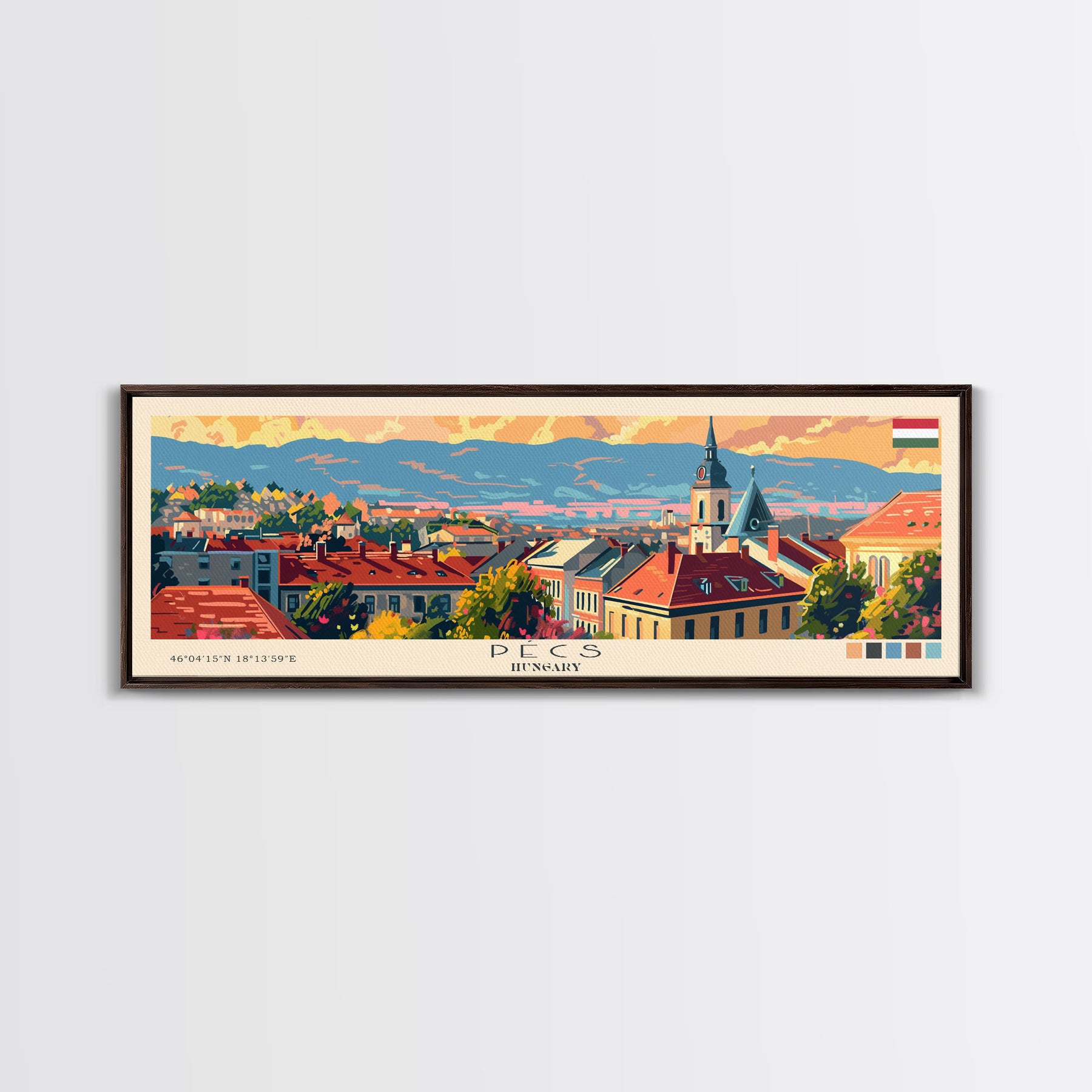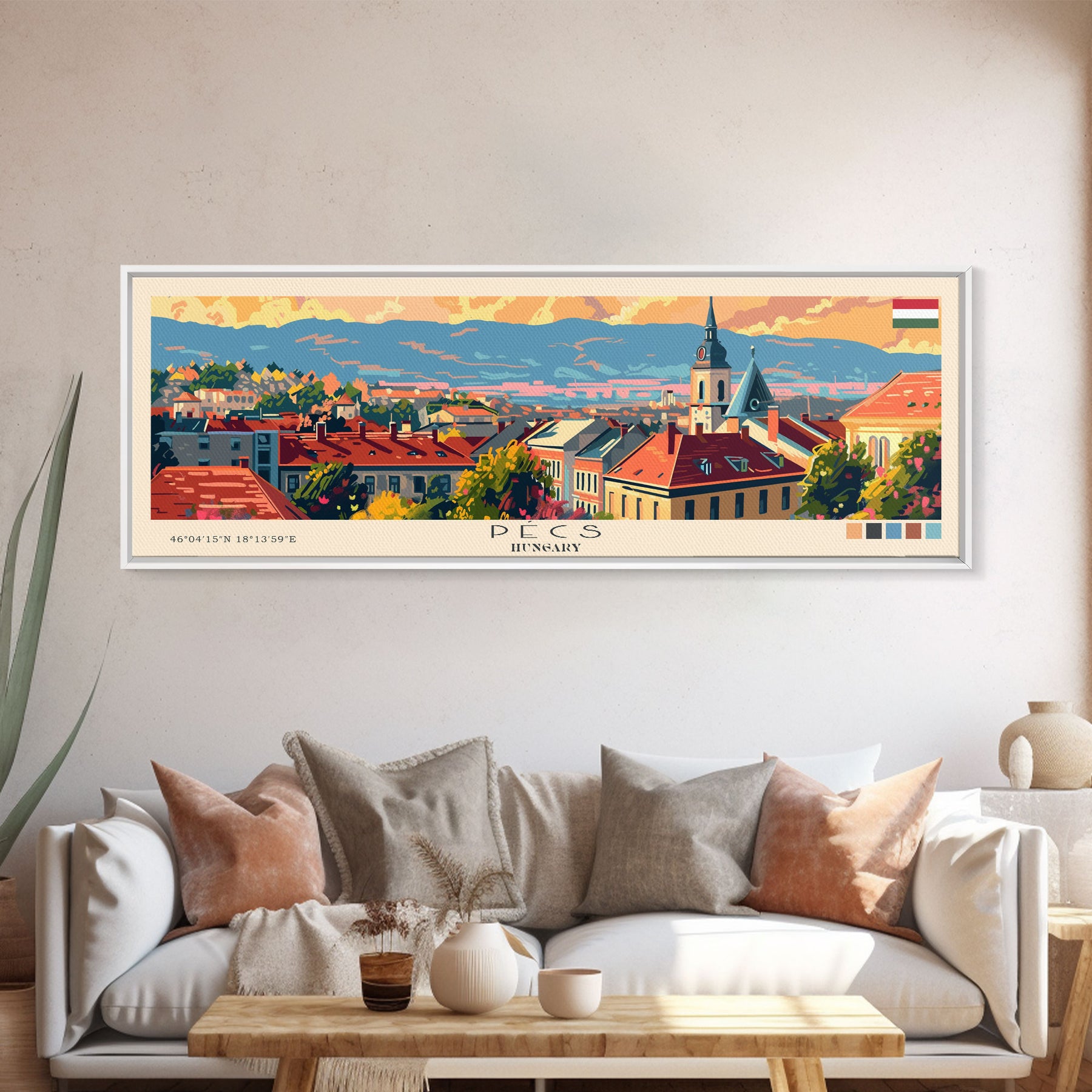 Pécs Hungary Panoramic Travel Poster, Framed Canvas Print or Metal Wall Art, Travel Art, Home Decor, Panoramic Painting, Midcentury Art