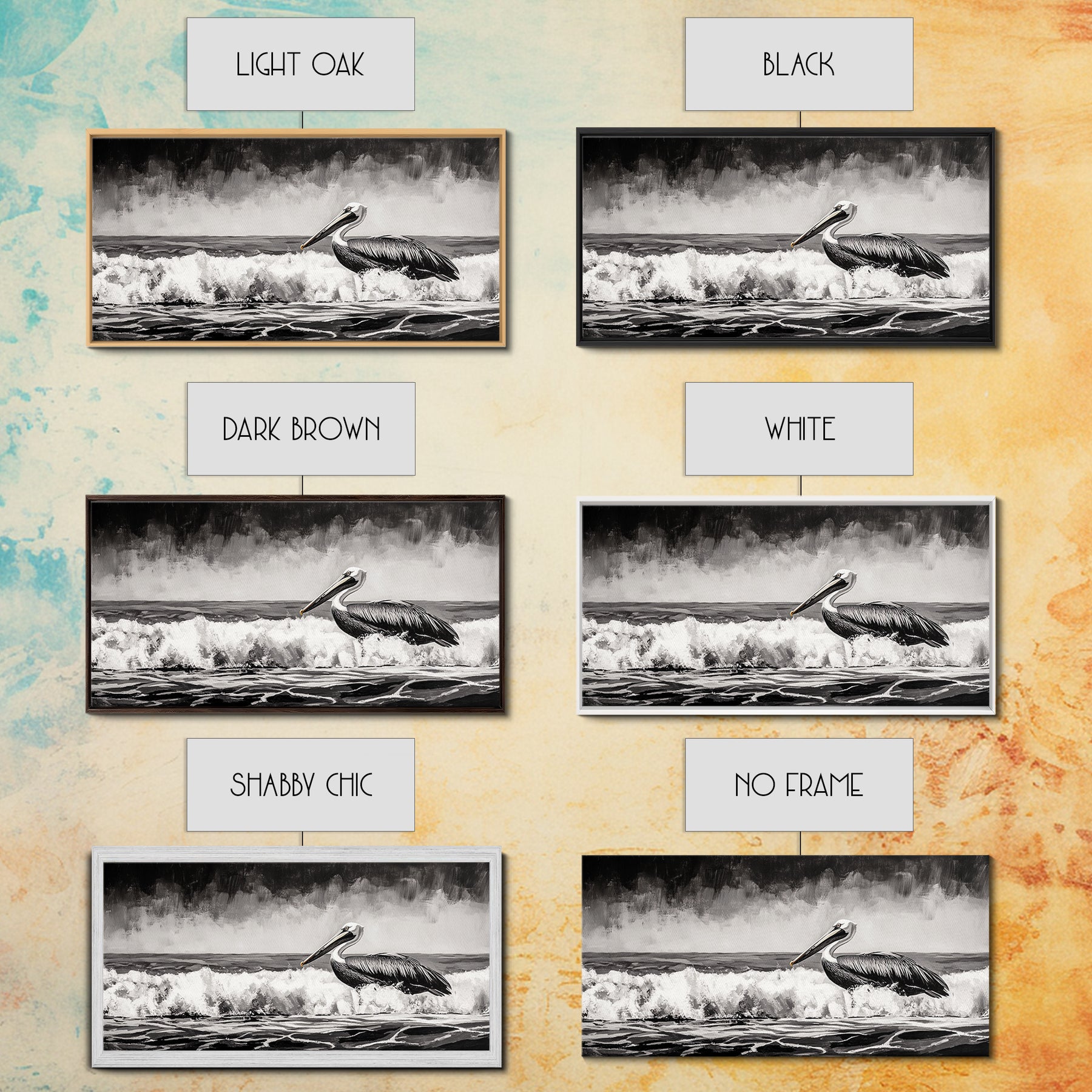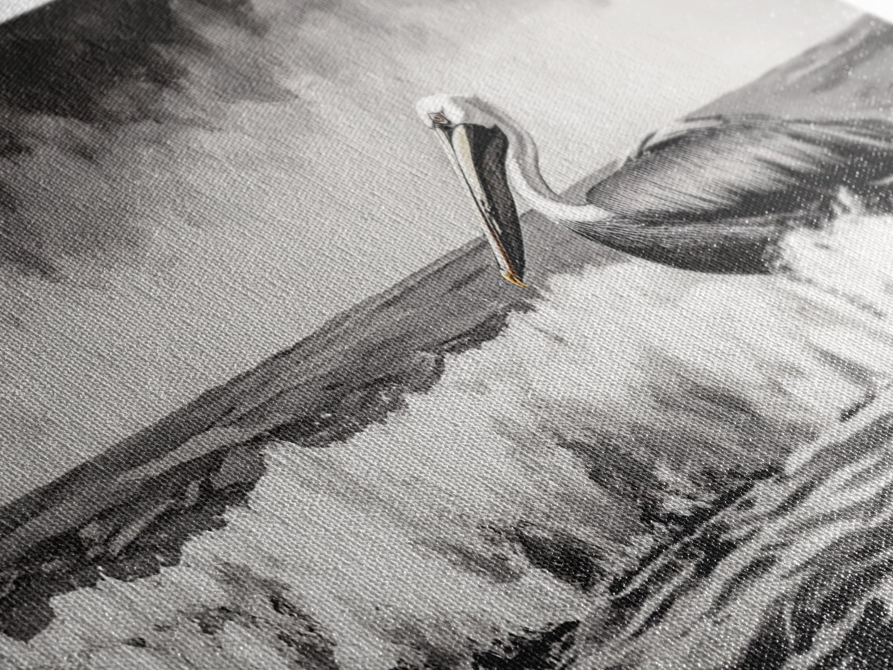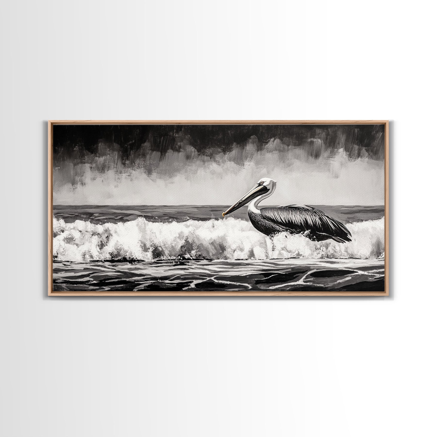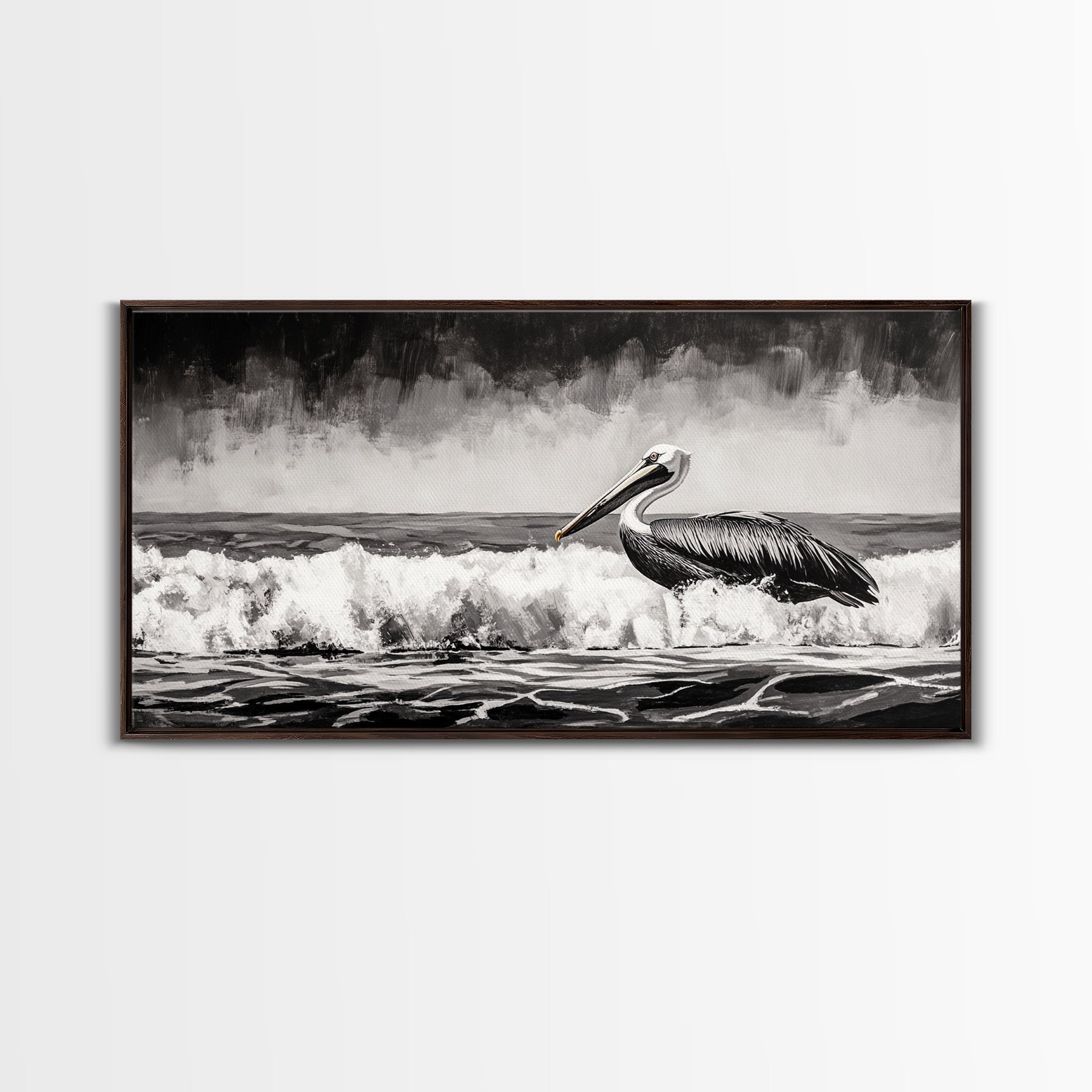 Pelican, coastal wall art, nautical painting, black and white art, seascape painting, ocean bird, Framed Canvas Print, beach decor