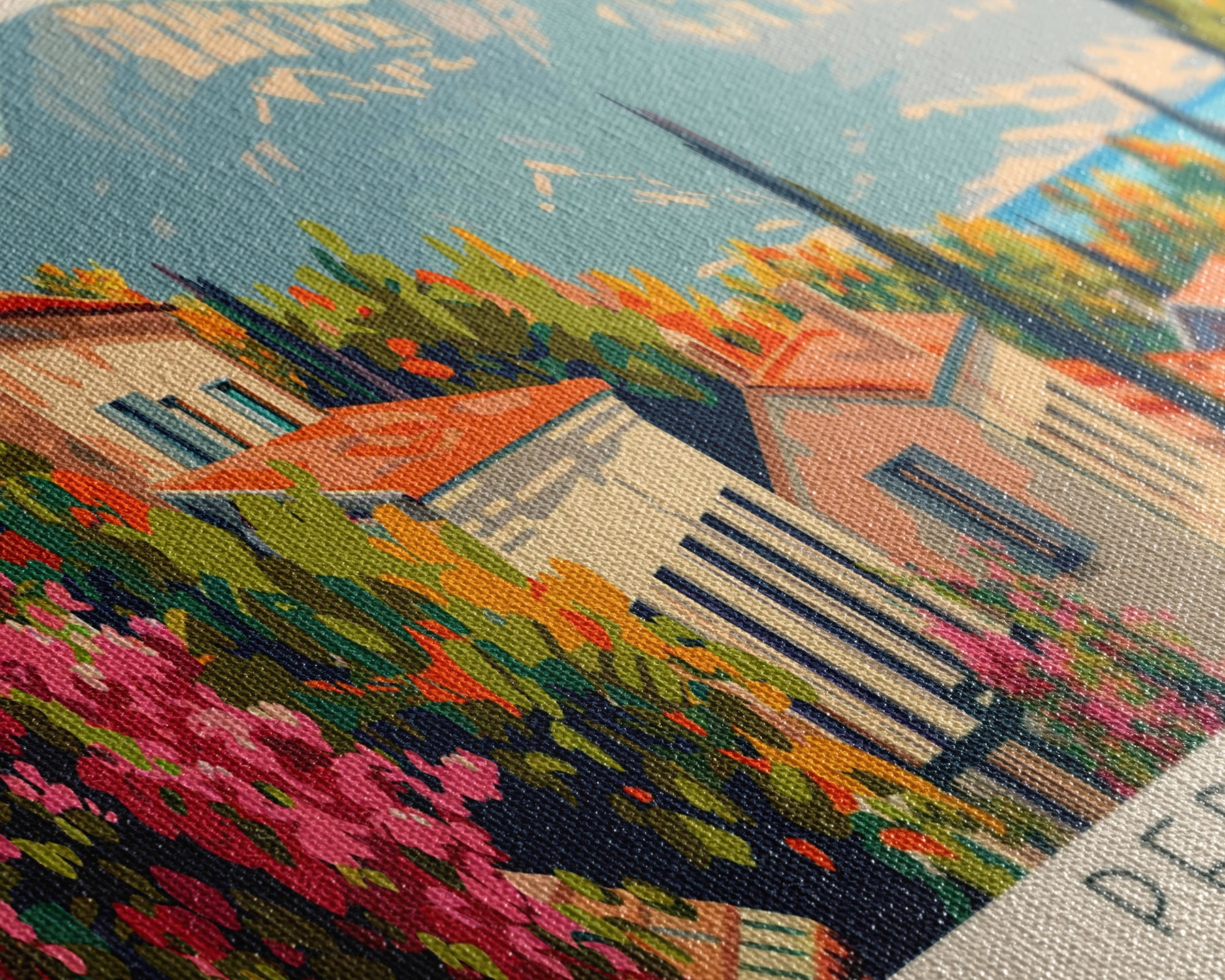 Most of our canvases are made in the USA, with the exception of canvases ordered with the light oak unstained frames, and any large canvases (24x48, 30x60, 16x48 and 20x60) ordered WITH a frame. These are temporarily made in and shipped from Europe, while we try to find a more consistent supplier in the USA.