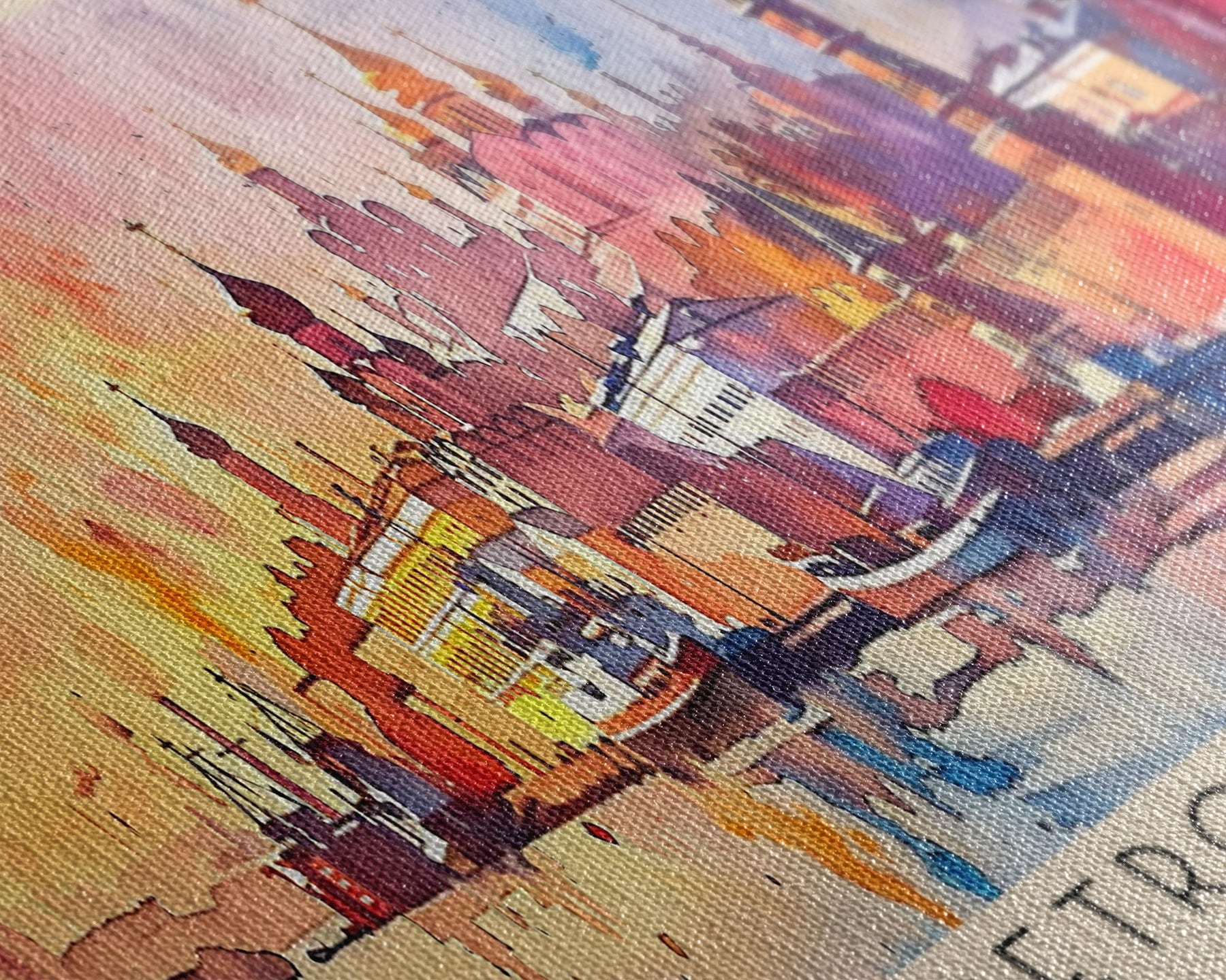 Most of our canvases are made in the USA, with the exception of canvases ordered with the light oak unstained frames, and any large canvases (24x48, 30x60, 16x48 and 20x60) ordered WITH a frame. These are temporarily made in and shipped from Europe, while we try to find a more consistent supplier in the USA.