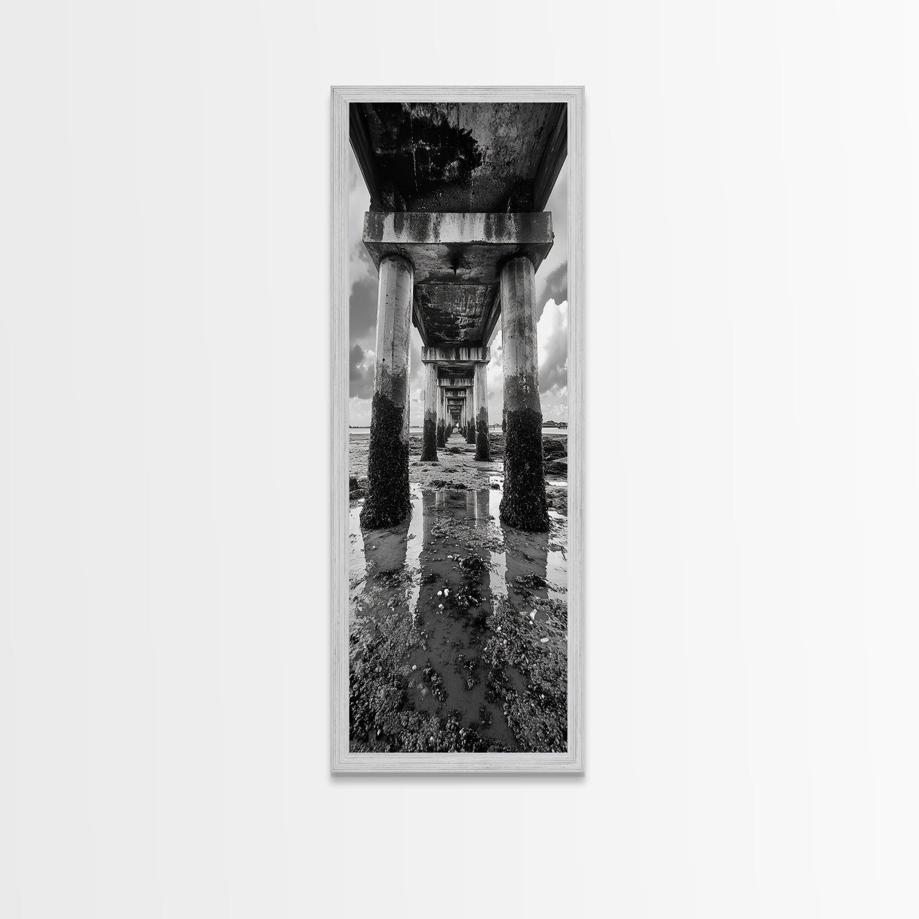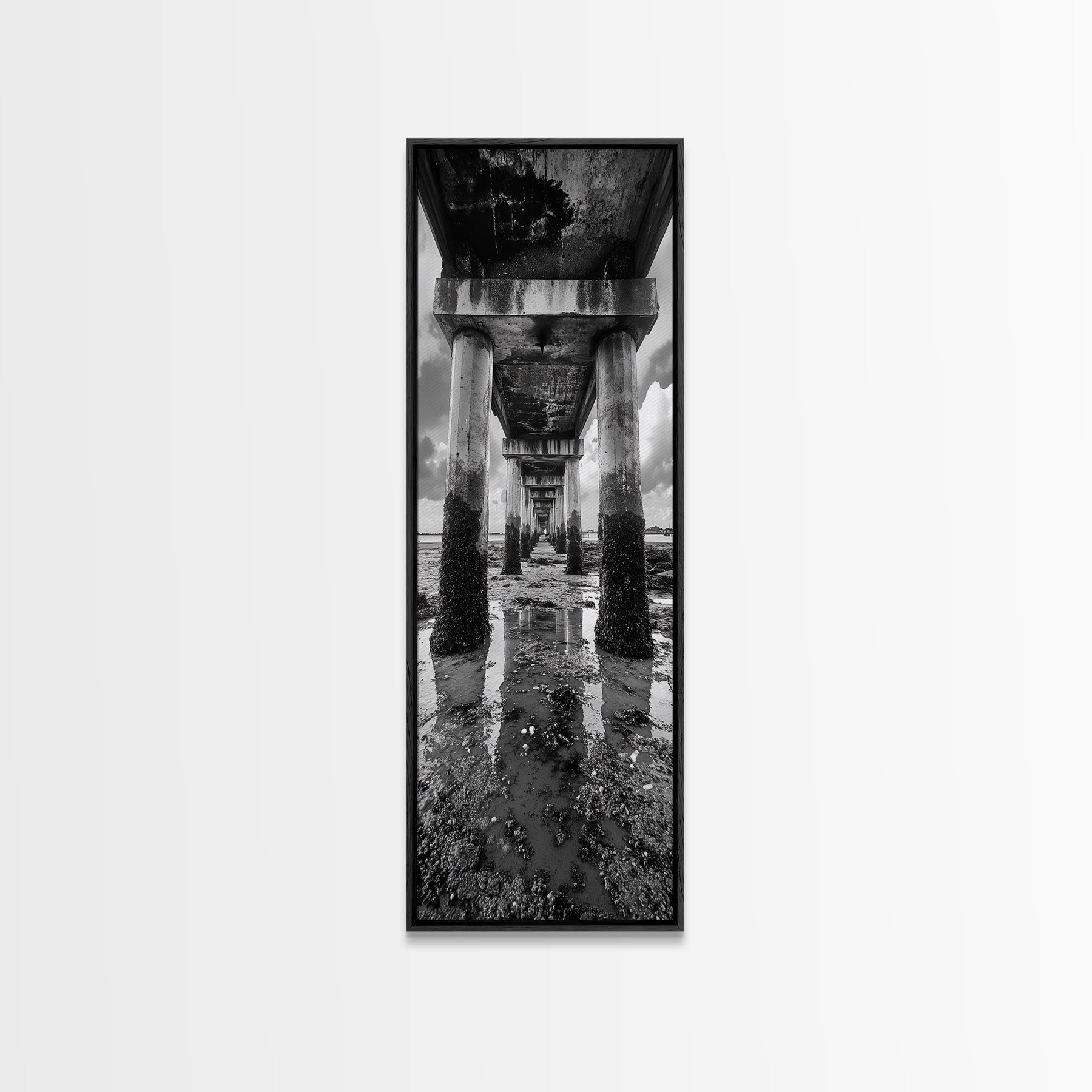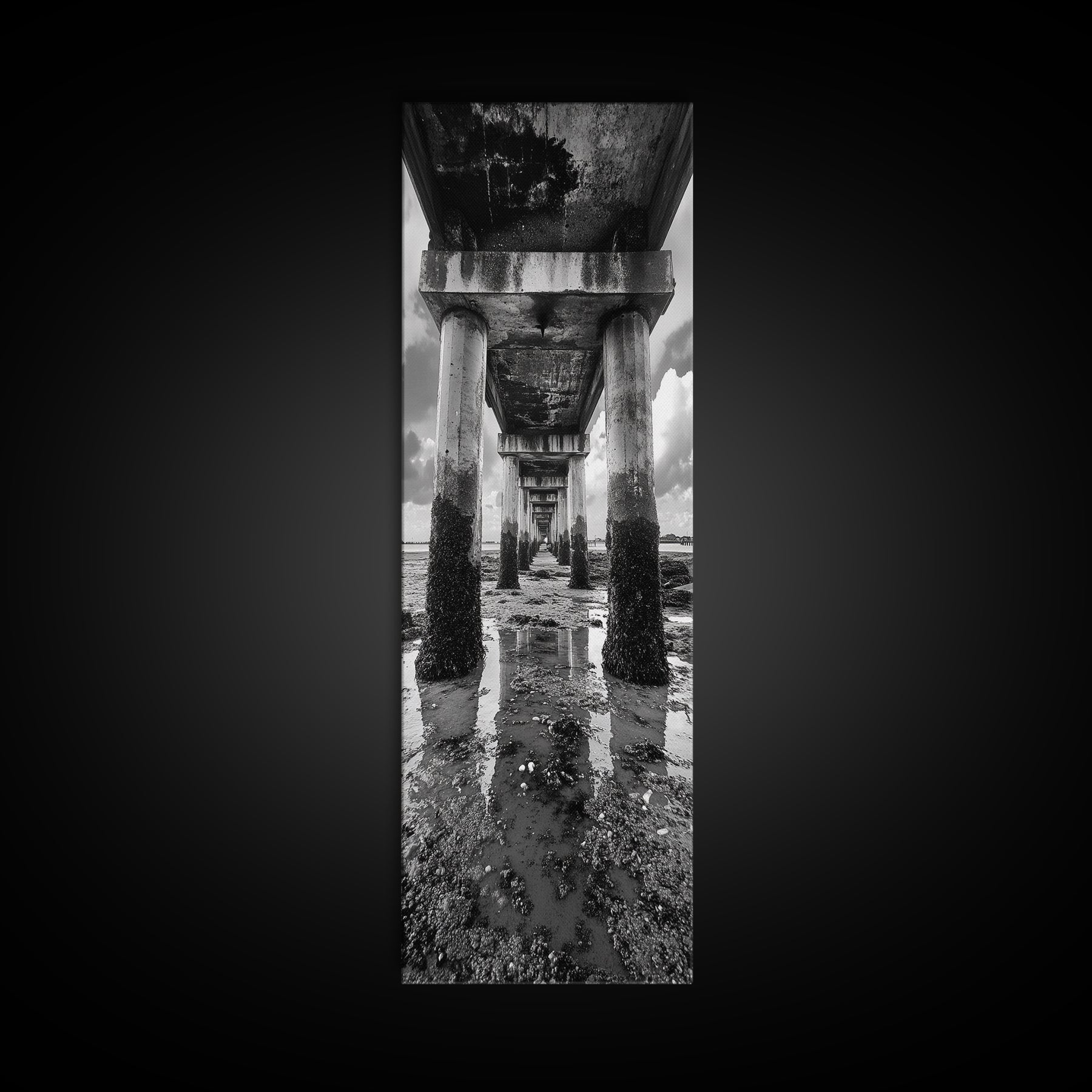 Pier Perspective, Symmetrical Architecture Art, Coastal Concrete Structure, Industrial Minimalist Decor, Framed Canvas Print