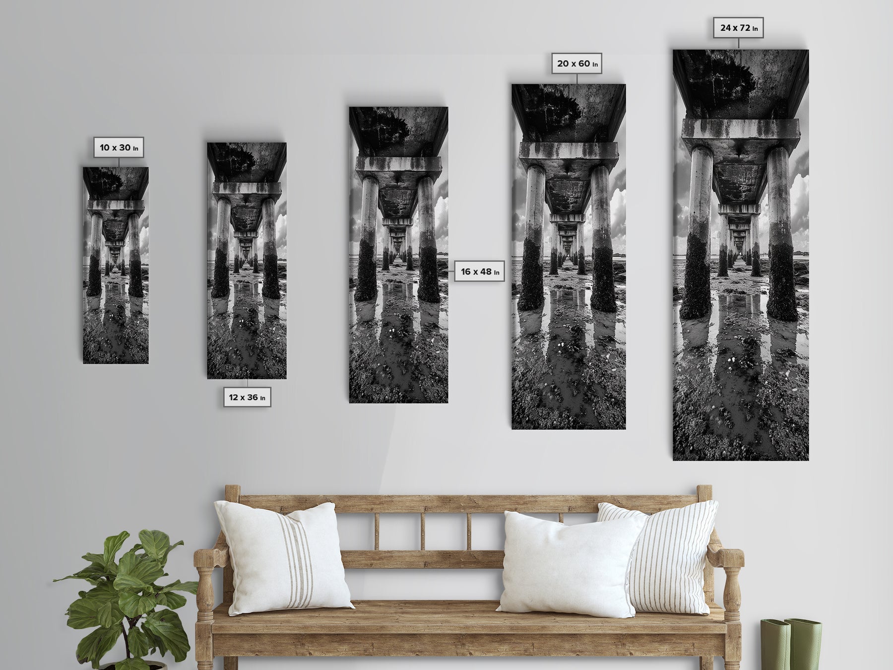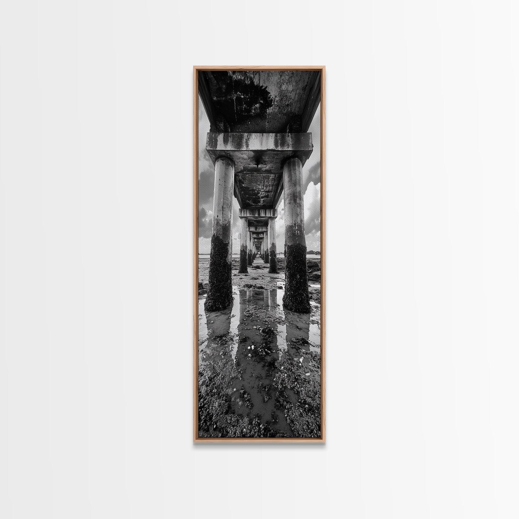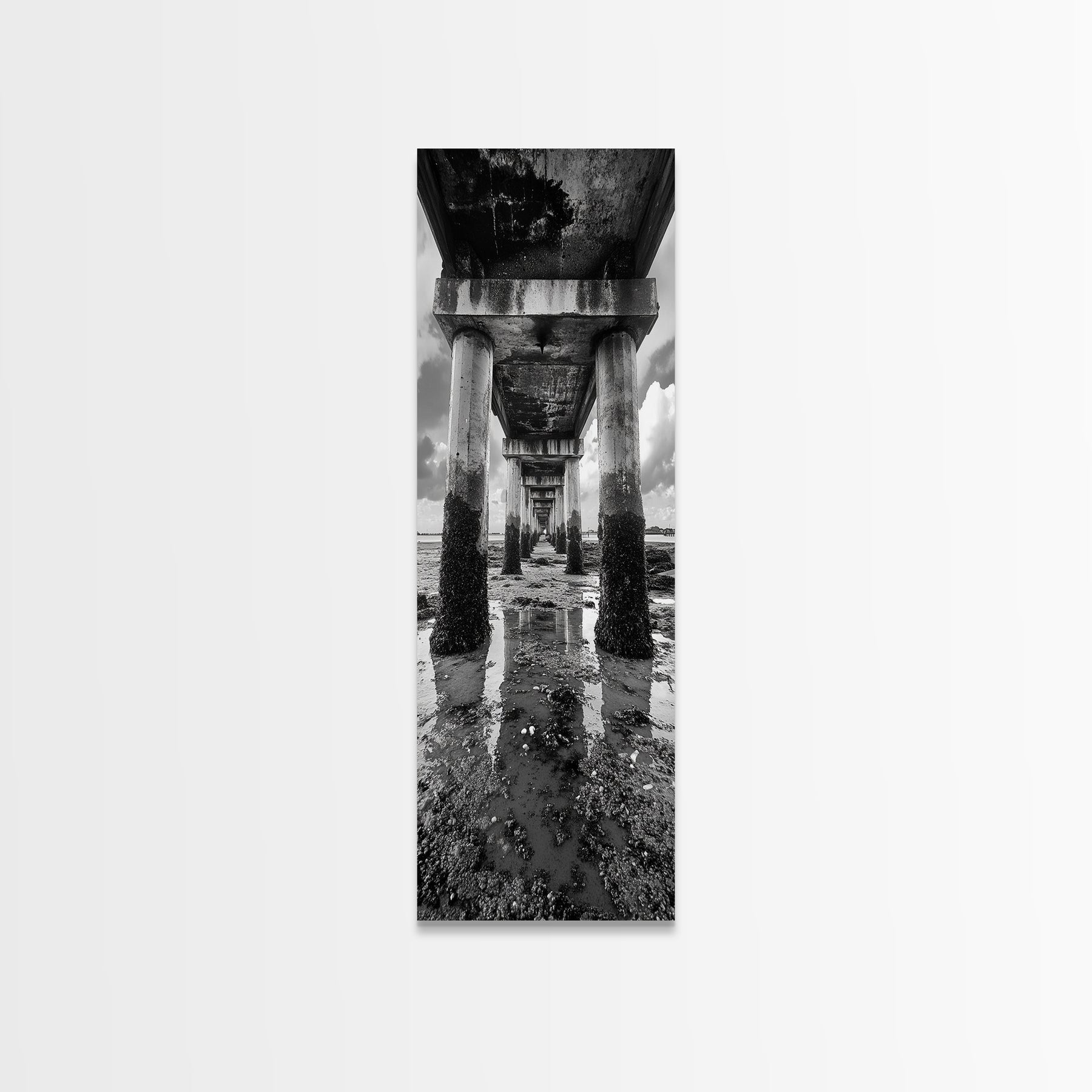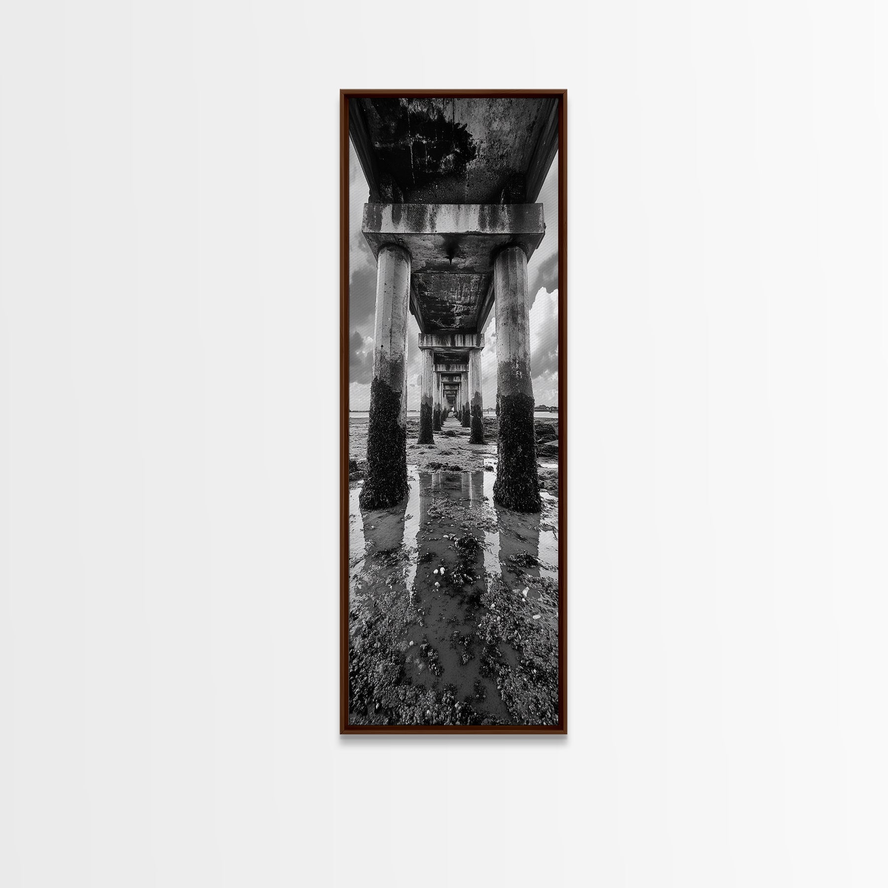 Pier Perspective, Symmetrical Architecture Art, Coastal Concrete Structure, Industrial Minimalist Decor, Framed Canvas Print