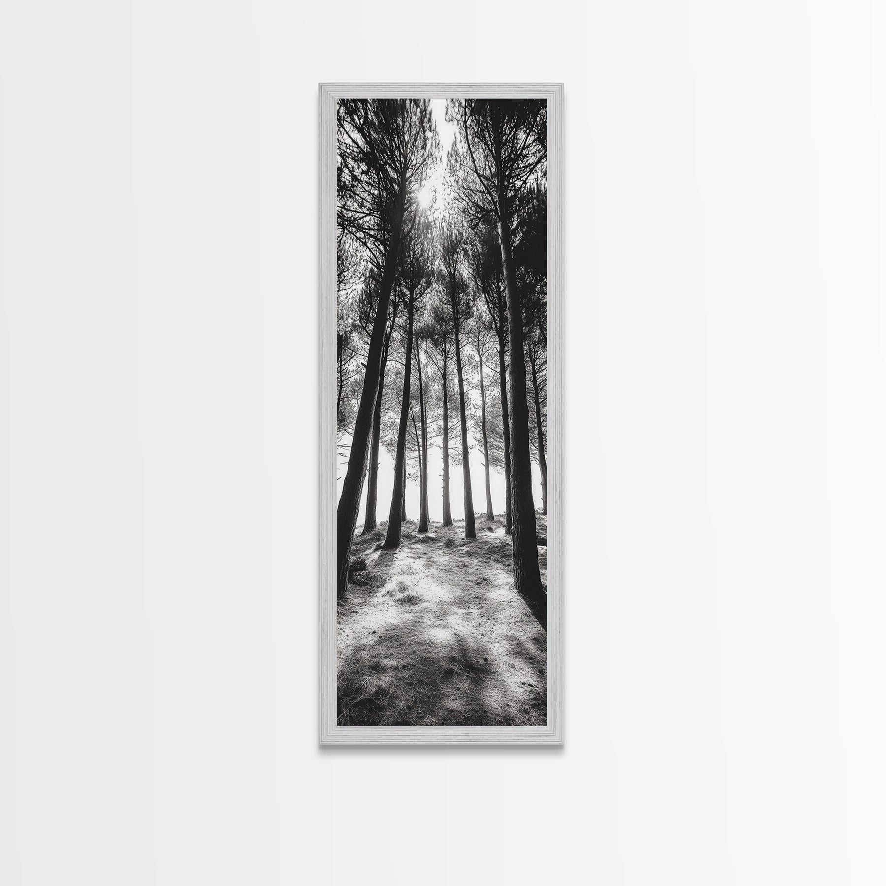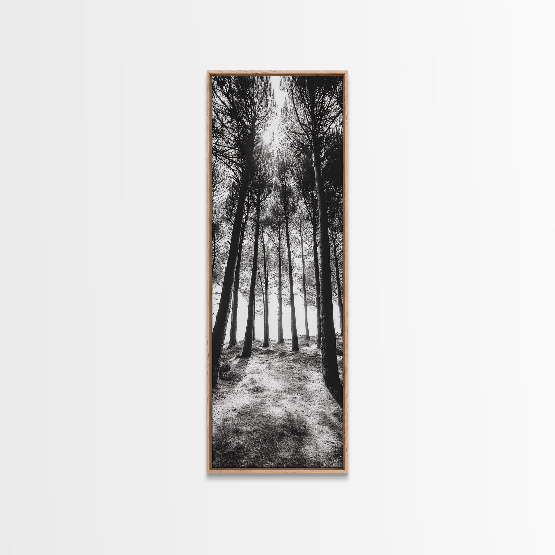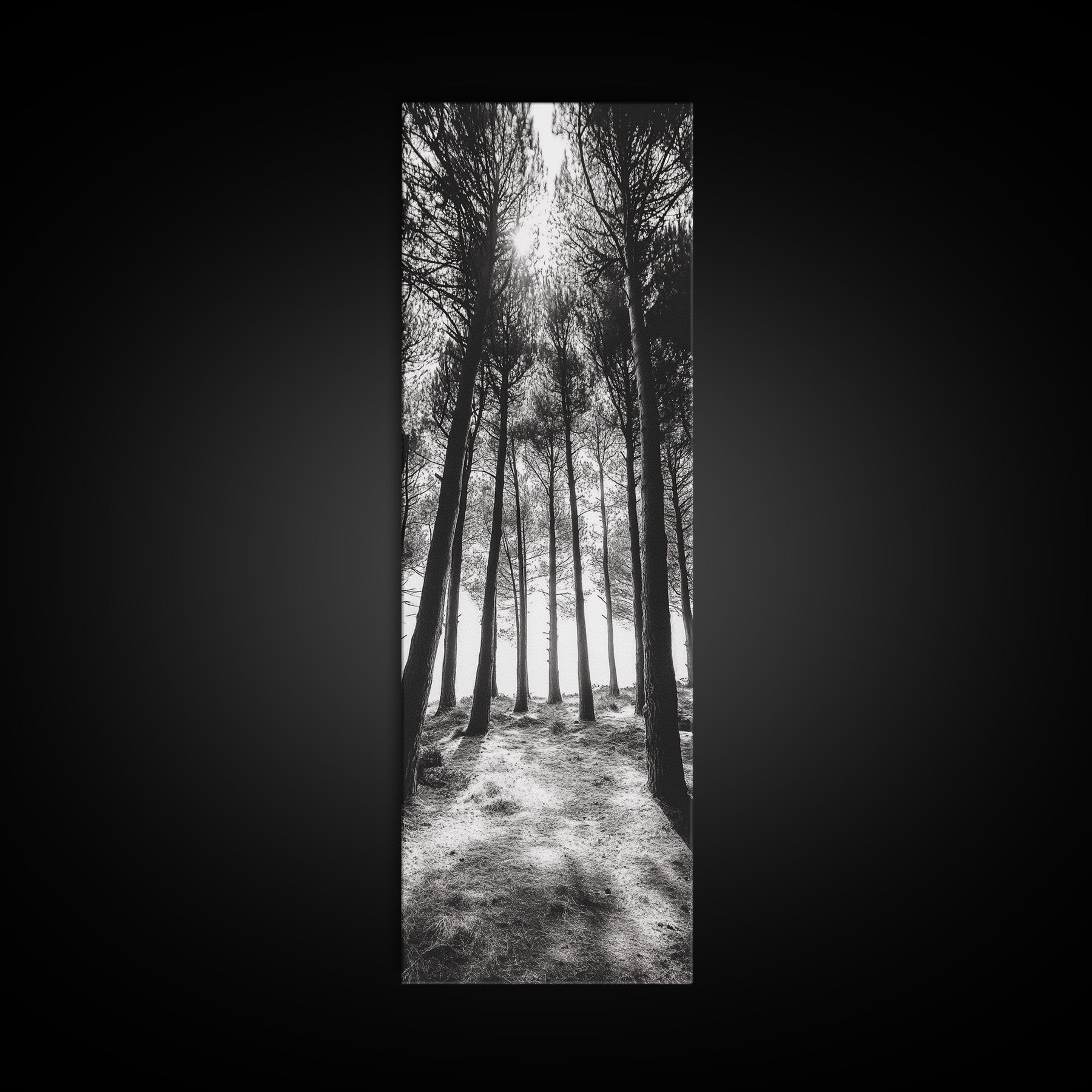 Pine Forest Glow, Woodland Landscape, Monochrome Nature, Boho Style, Framed Canvas Print, Entryway Print, Living Room Wall Art, Game Room Art