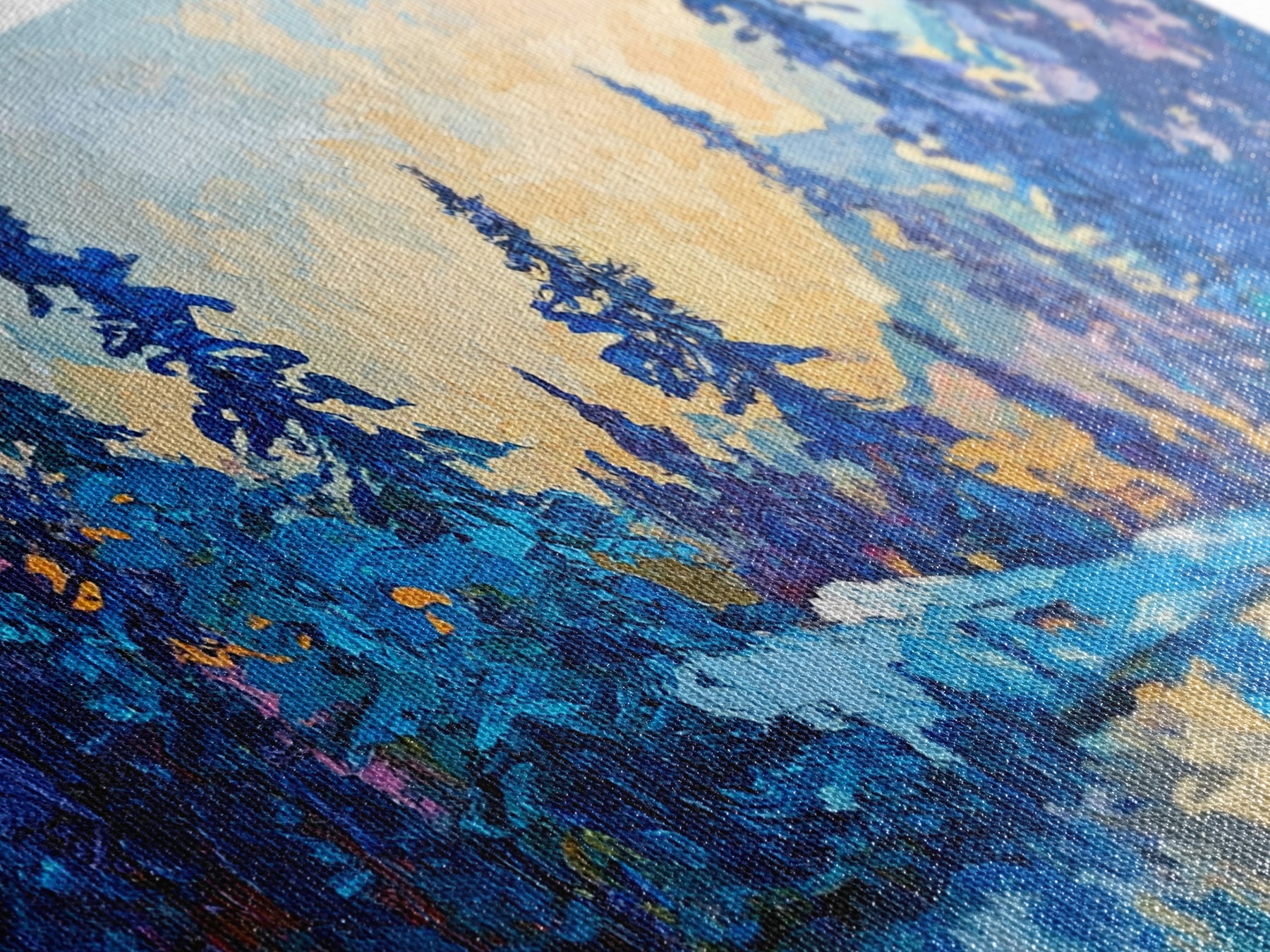 Most of our canvases are made in the USA, with the exception of canvases ordered with the light oak unstained frames, and any large canvases (24x48, 30x60, 16x48 and 20x60) ordered WITH a frame. These are temporarily made in and shipped from Europe, while we try to find a more consistent supplier in the USA.