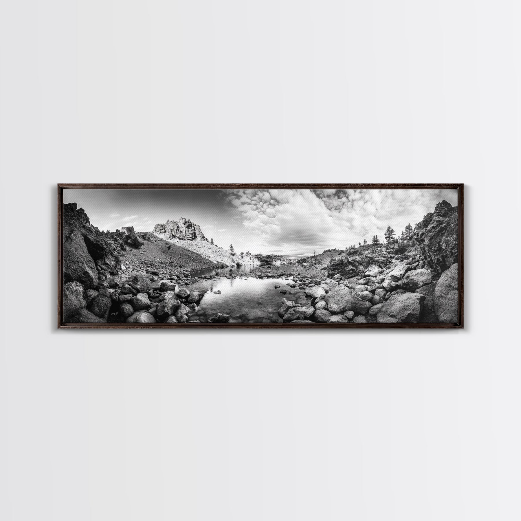 Rocky Lake, Wilderness Reflection, Mountain Calm, Framed Canvas Print, Cabin Nature Wall Art, Rustic Home Decor, Adventure Photography