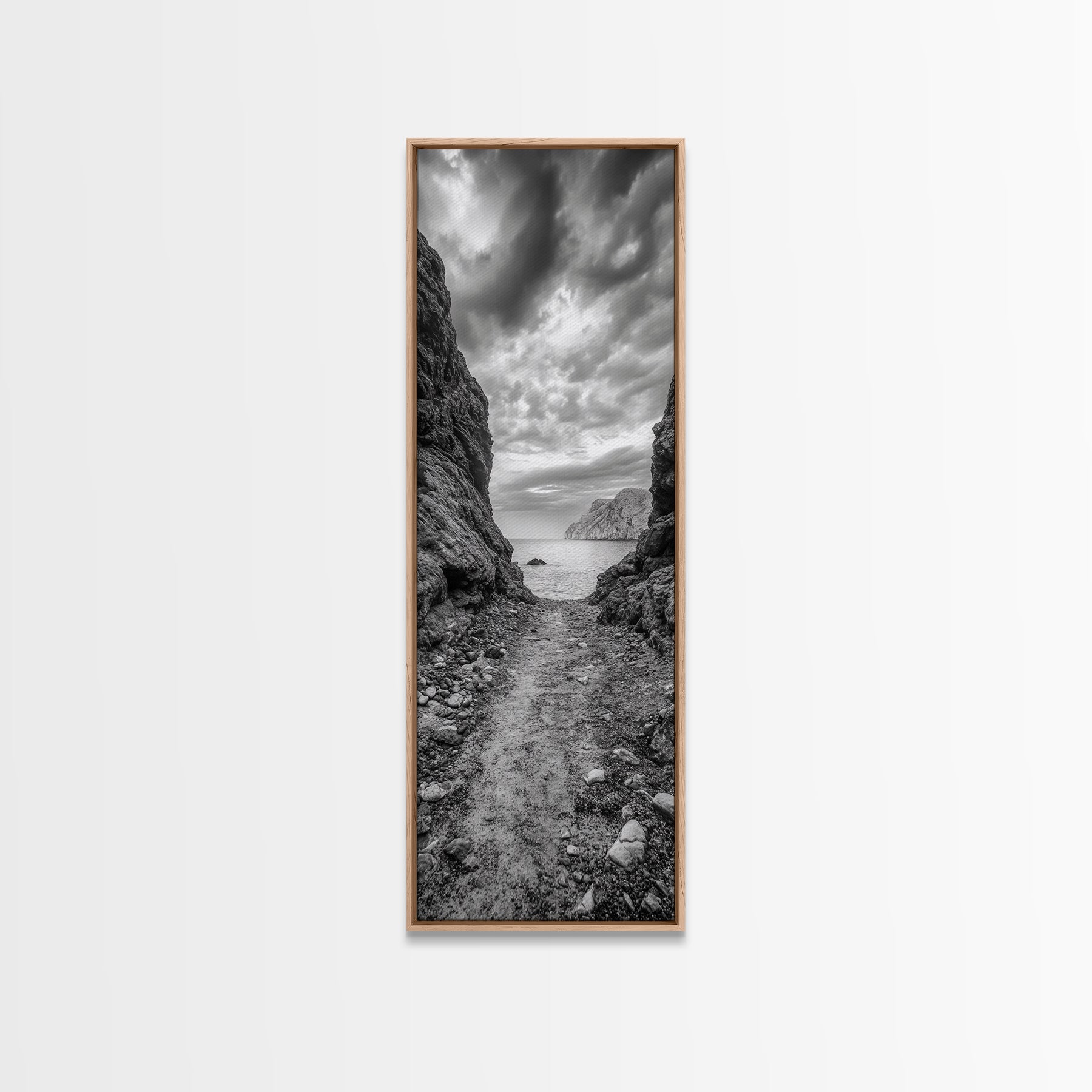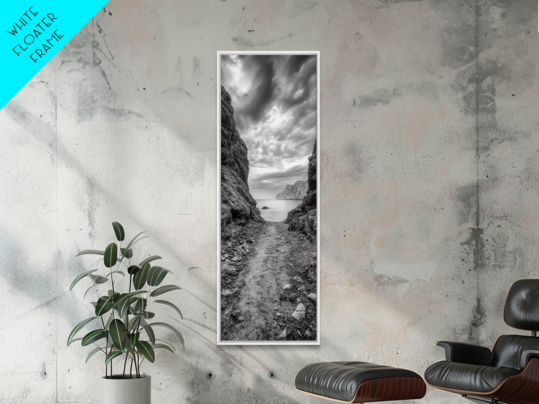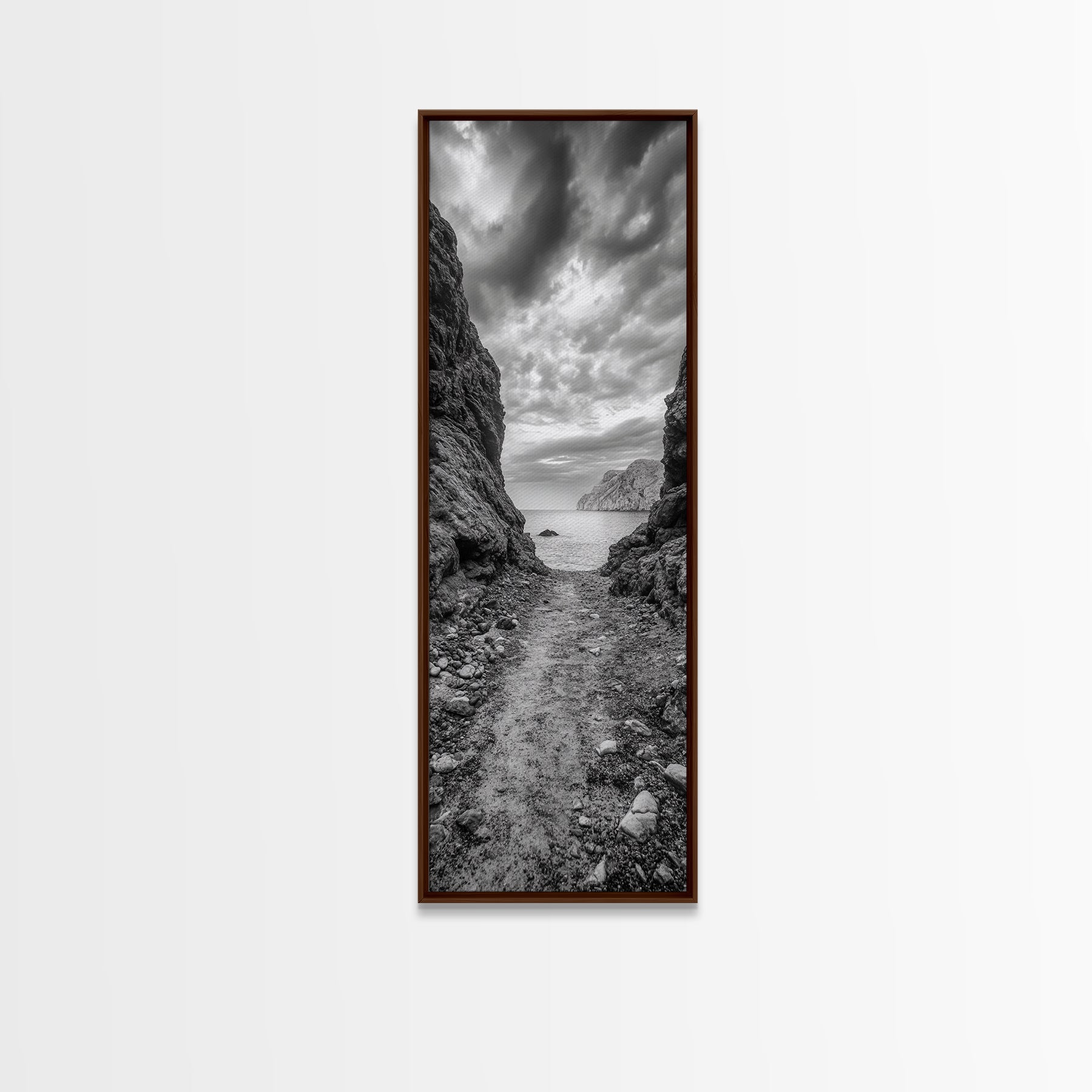 Rocky Pathway, Seaside Trail, Cloudy Horizon, Framed Canvas Print, Moody Coastal Wall Art, Nature Inspired, Monochrome Travel Decor