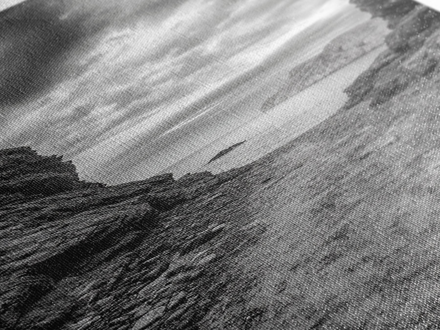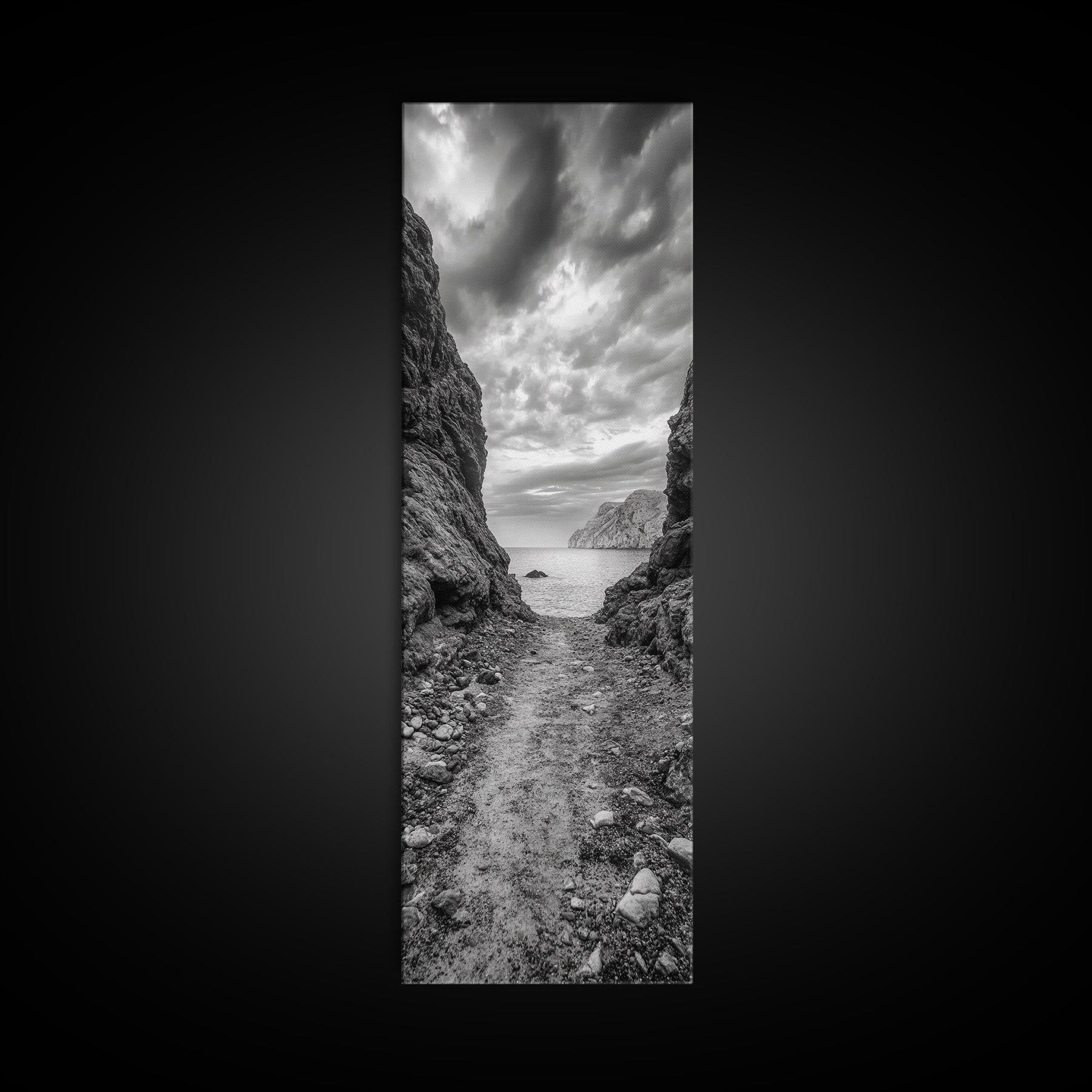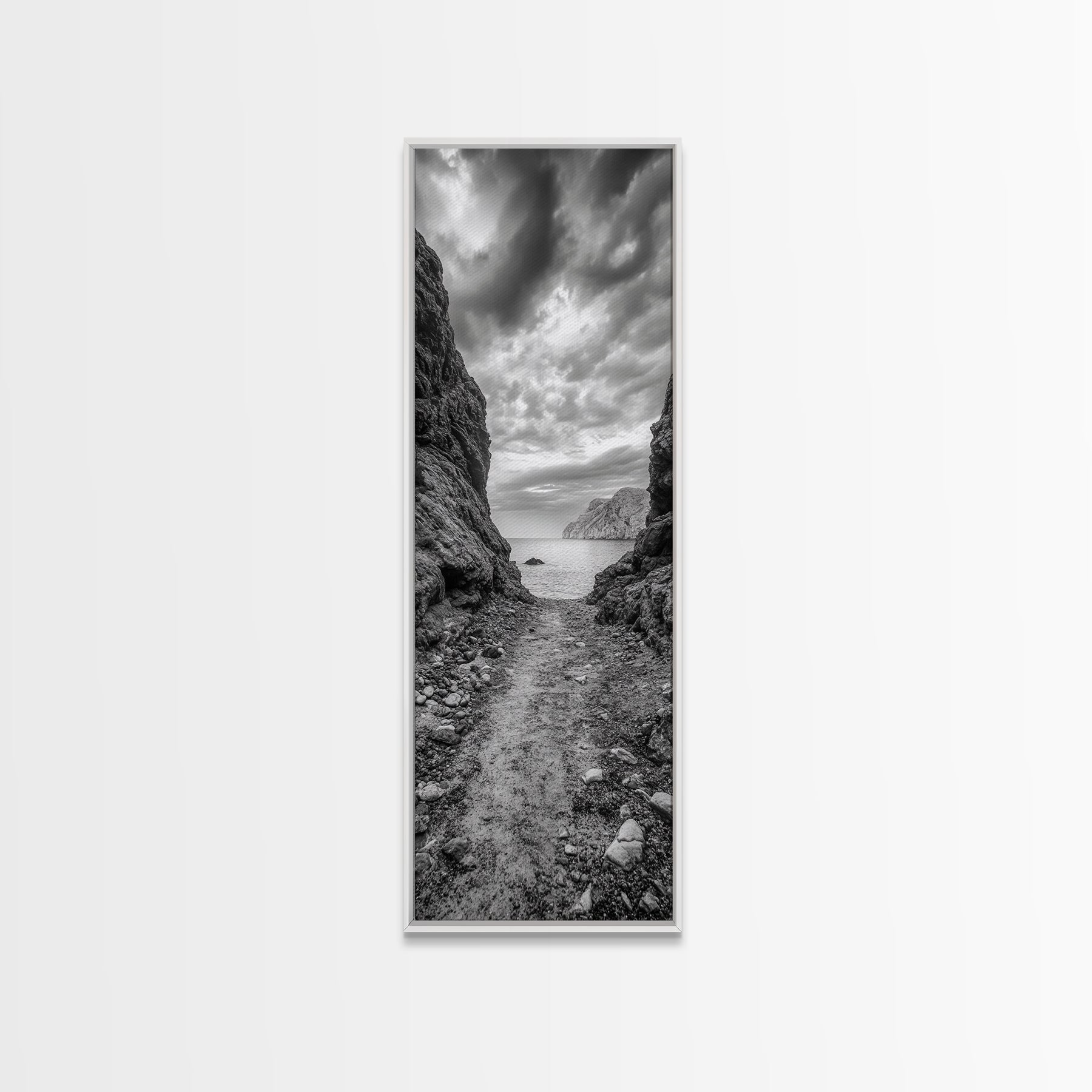 Rocky Pathway, Seaside Trail, Cloudy Horizon, Framed Canvas Print, Moody Coastal Wall Art, Nature Inspired, Monochrome Travel Decor