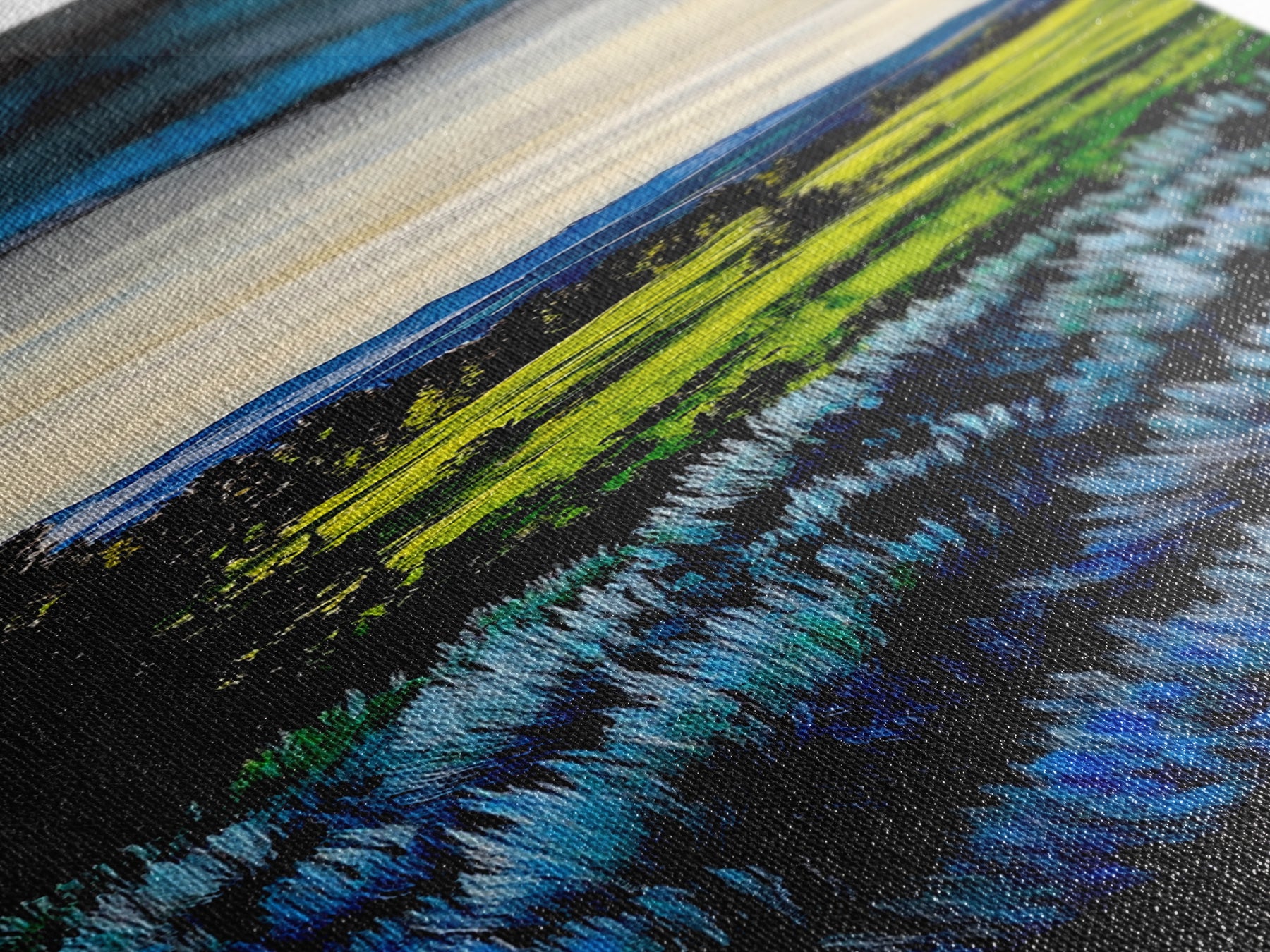 Most of our canvases are made in the USA, with the exception of canvases ordered with the light oak unstained frames, and any large canvases (24x48, 30x60, 16x48 and 20x60) ordered WITH a frame. These are temporarily made in and shipped from Europe, while we try to find a more consistent supplier in the USA.