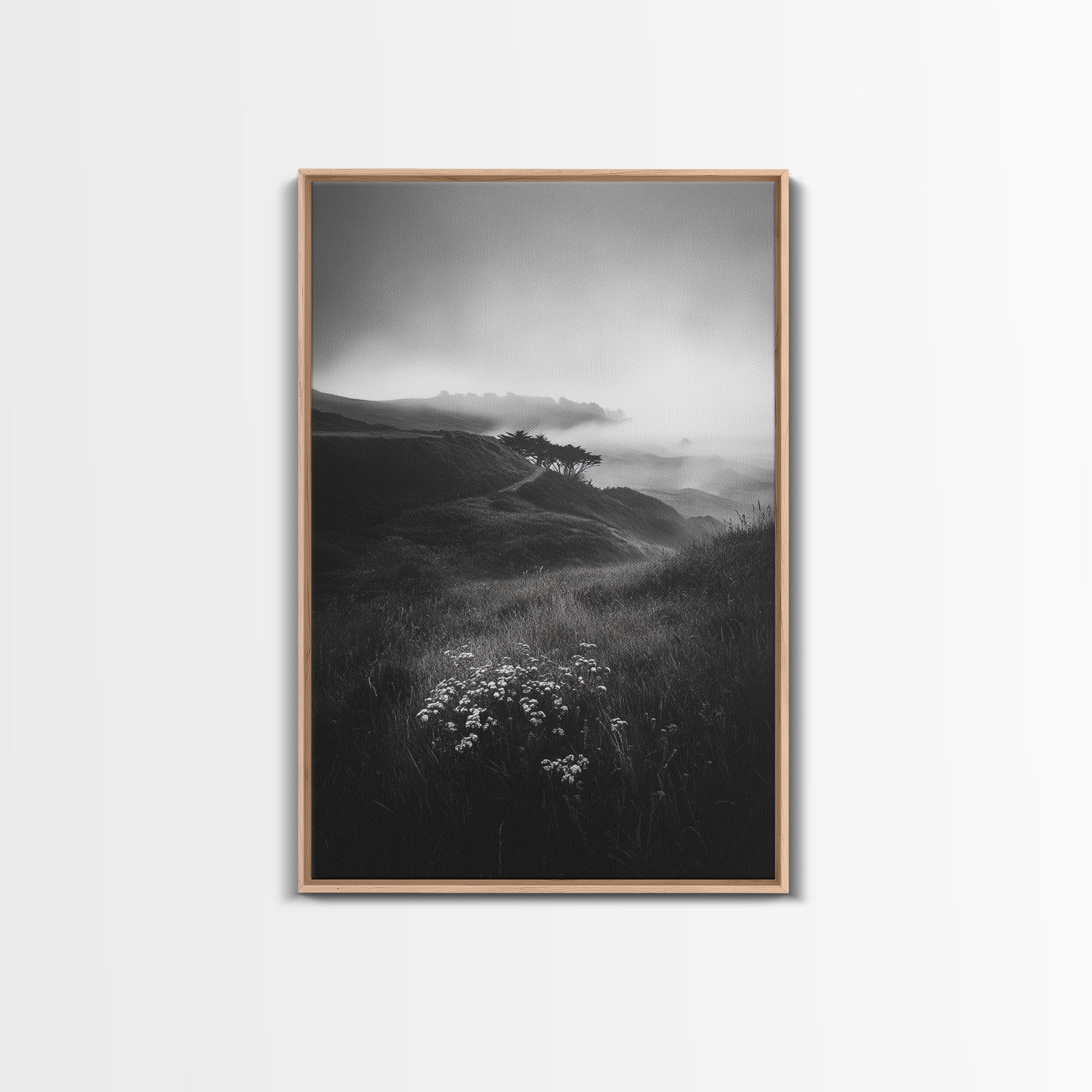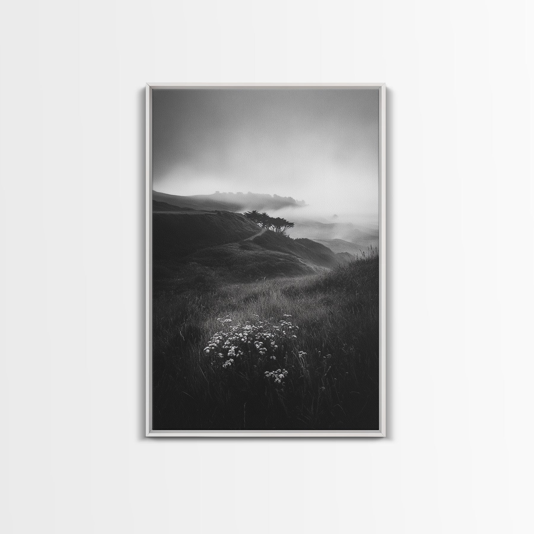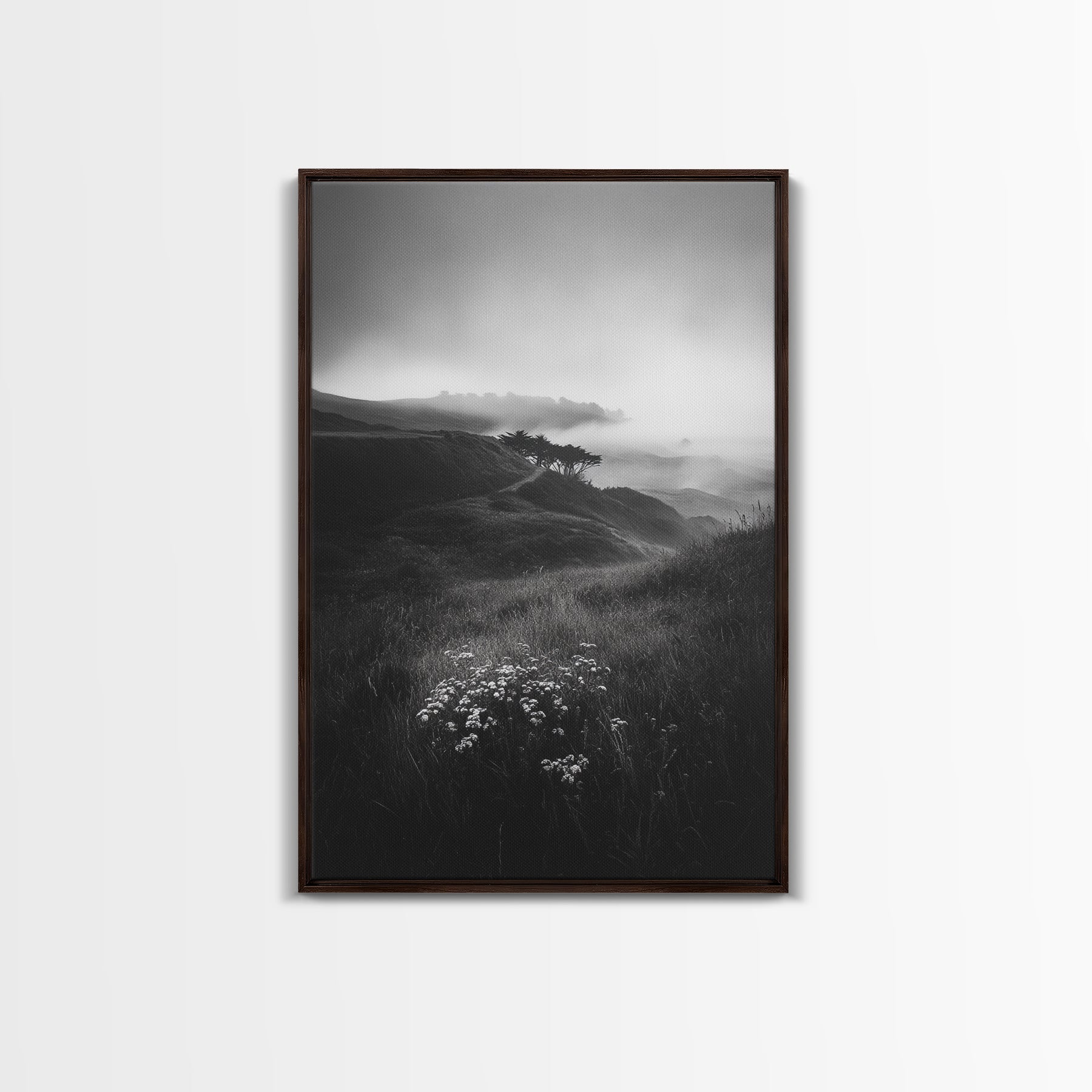 Rolling Mist Hills, Dreamy Countryside, Framed Canvas Print, Black and White Wall Art, Bedroom Calm Decor, Nature Landscape
