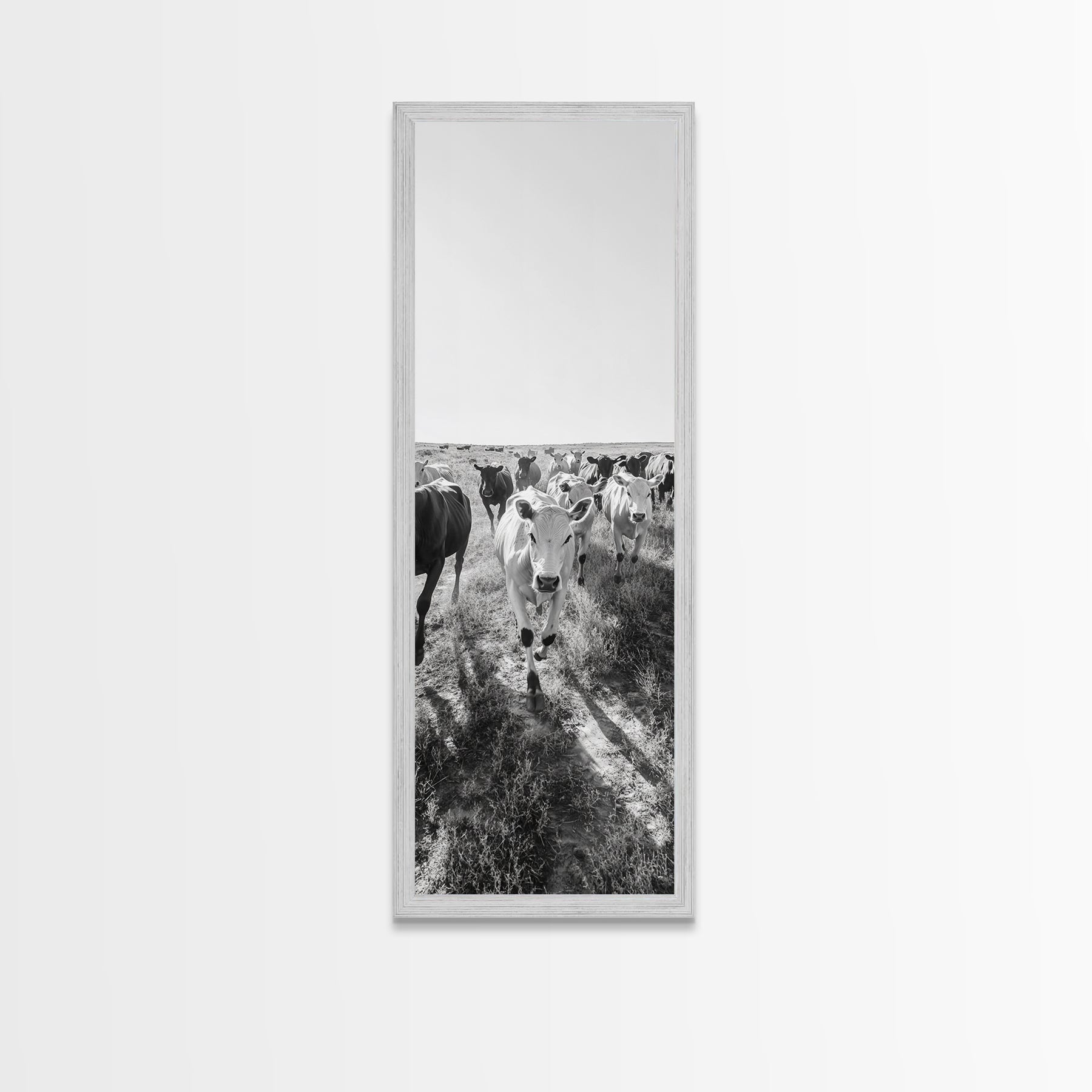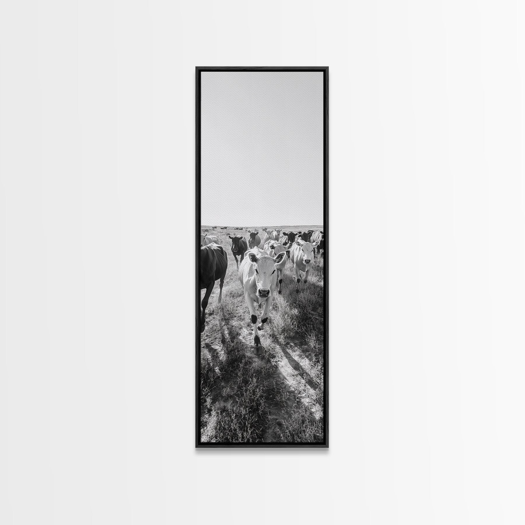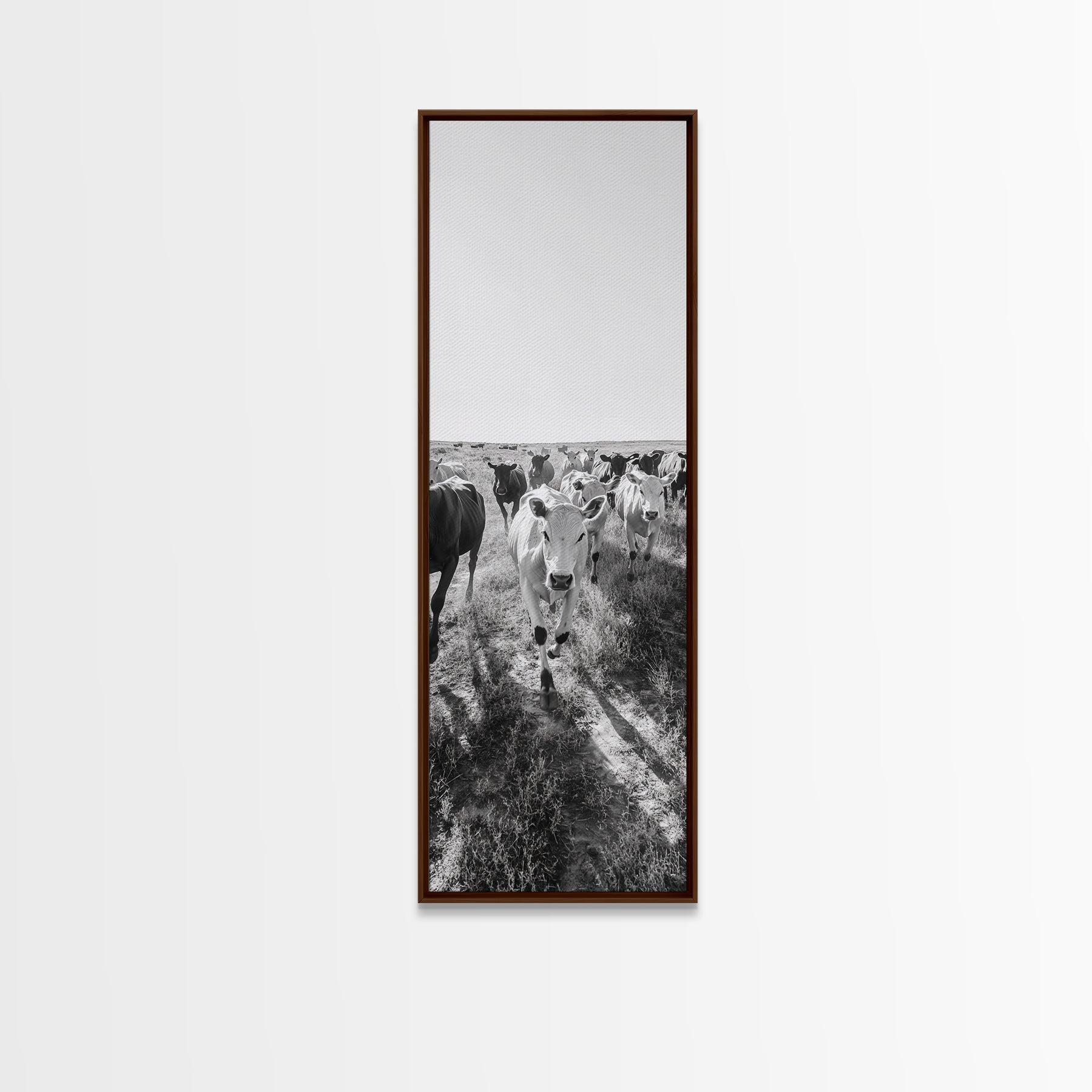 Running Cattle, Framed Canvas Print, rustic western wall art, cowboy décor, farmhouse art, above sofa art, panoramic painting, country home decor