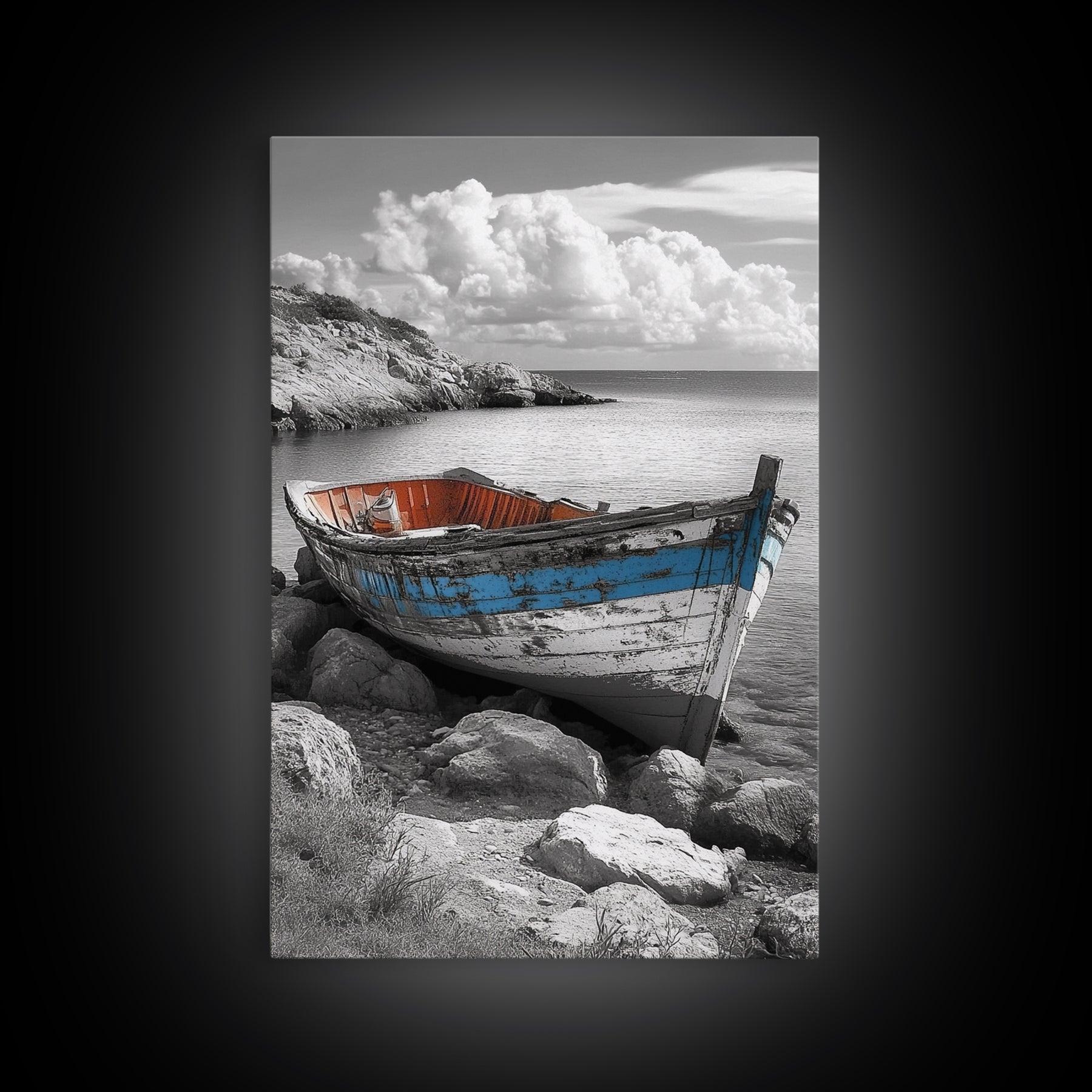 Rustic Boat Painting, Coastal Decor, Nautical Wall Art, Seascape Painting, Beach House Art, Gift Idea, Canvas Print, Wabi Sabi Art