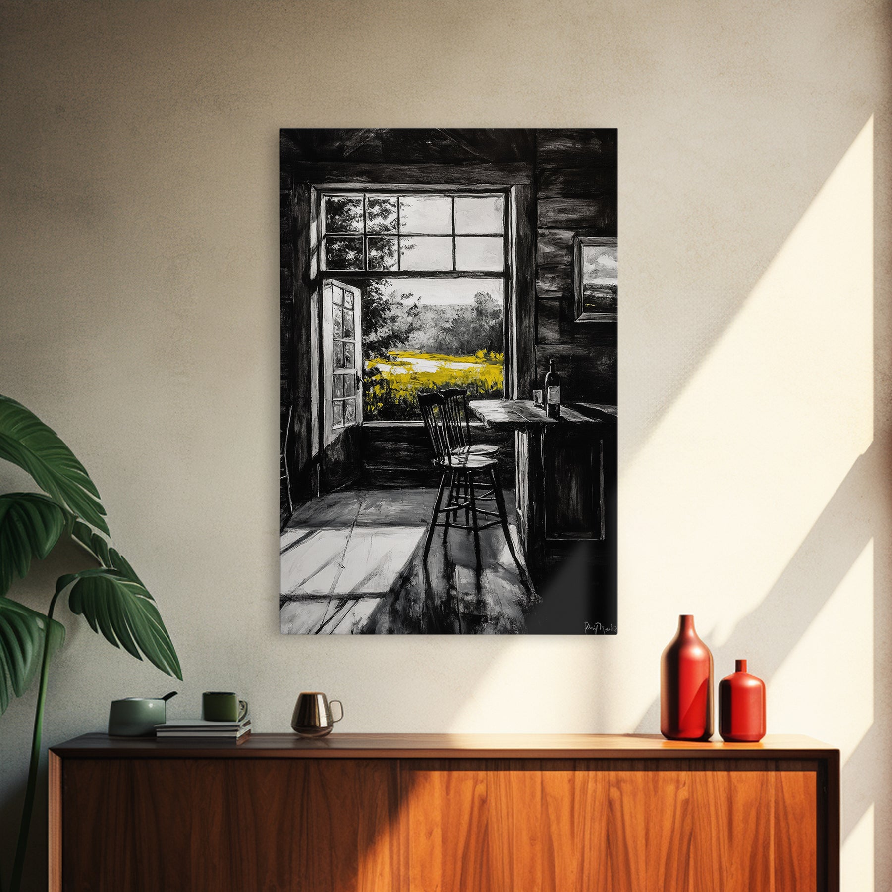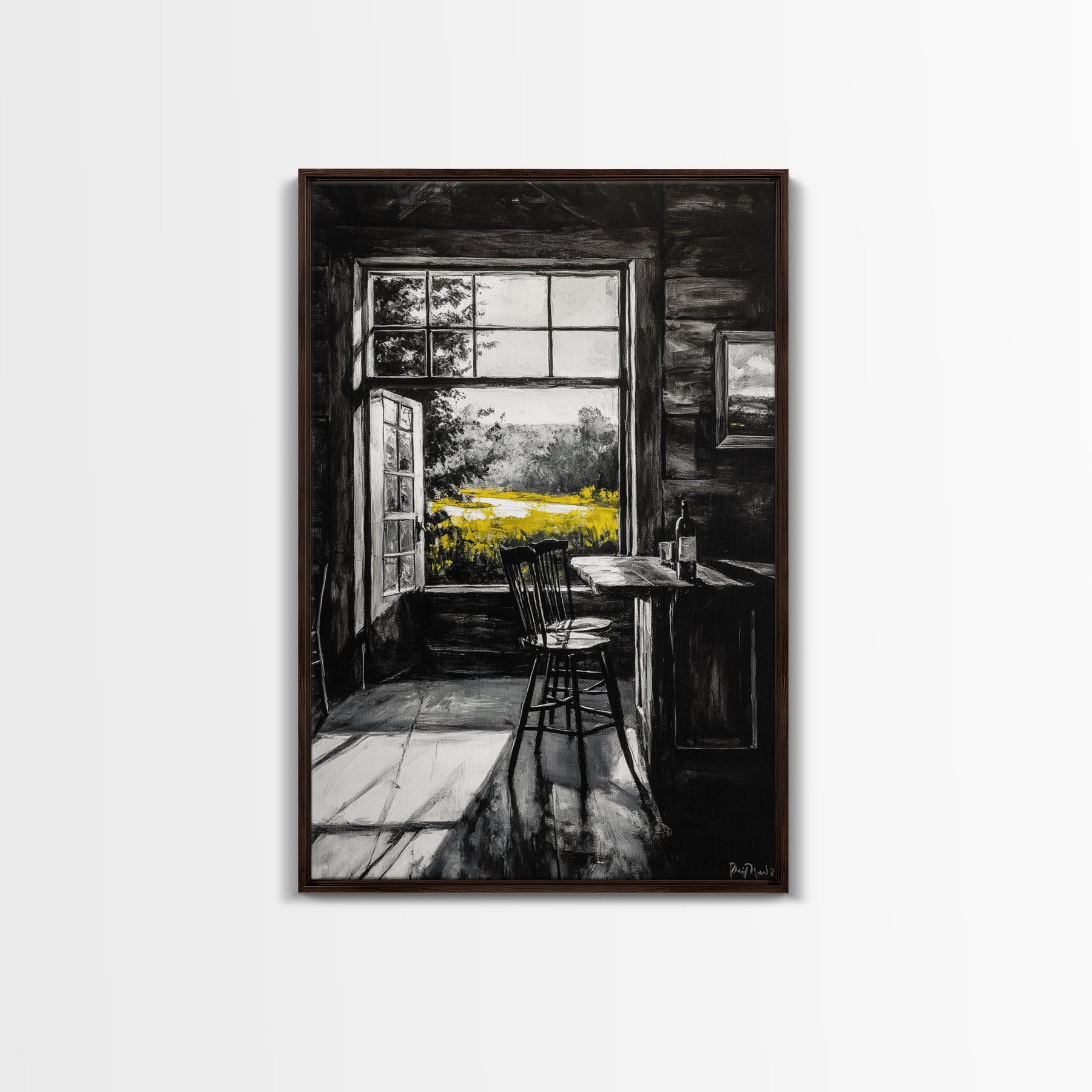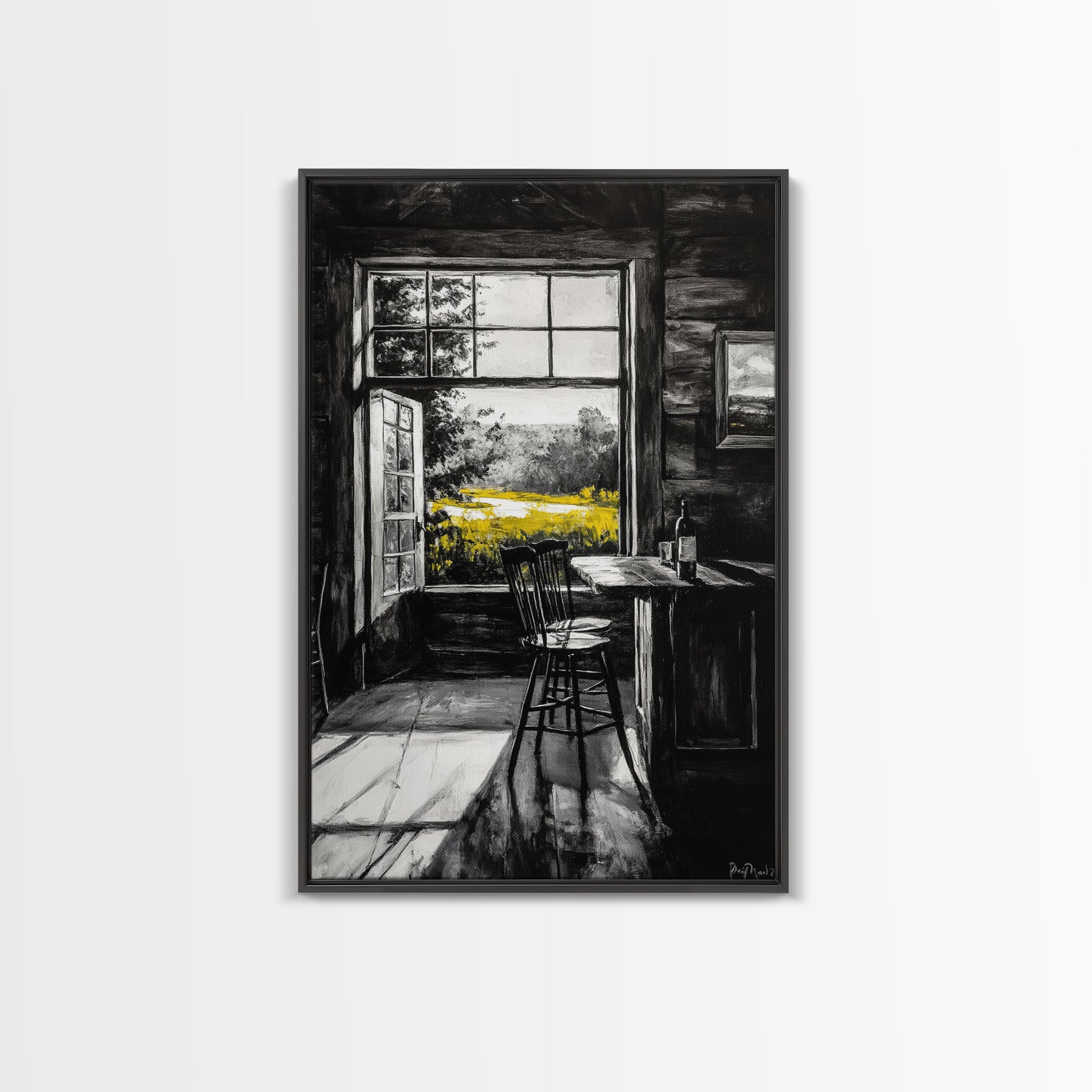 Rustic Cabin View, Black and White with Yellow Accents, Cozy Country Home Art, Framed Canvas Print, Living Room or Dining Room Decor