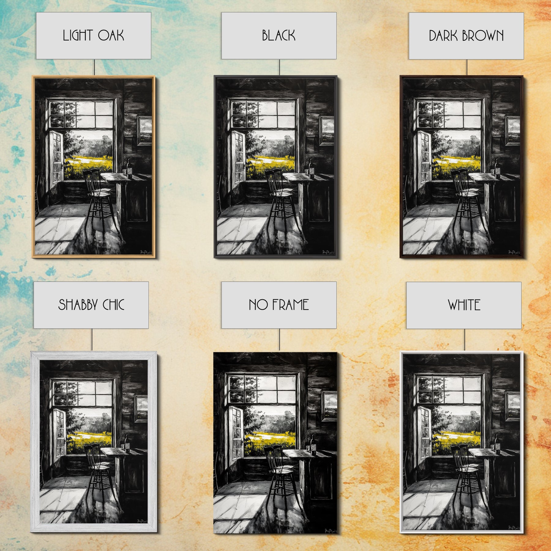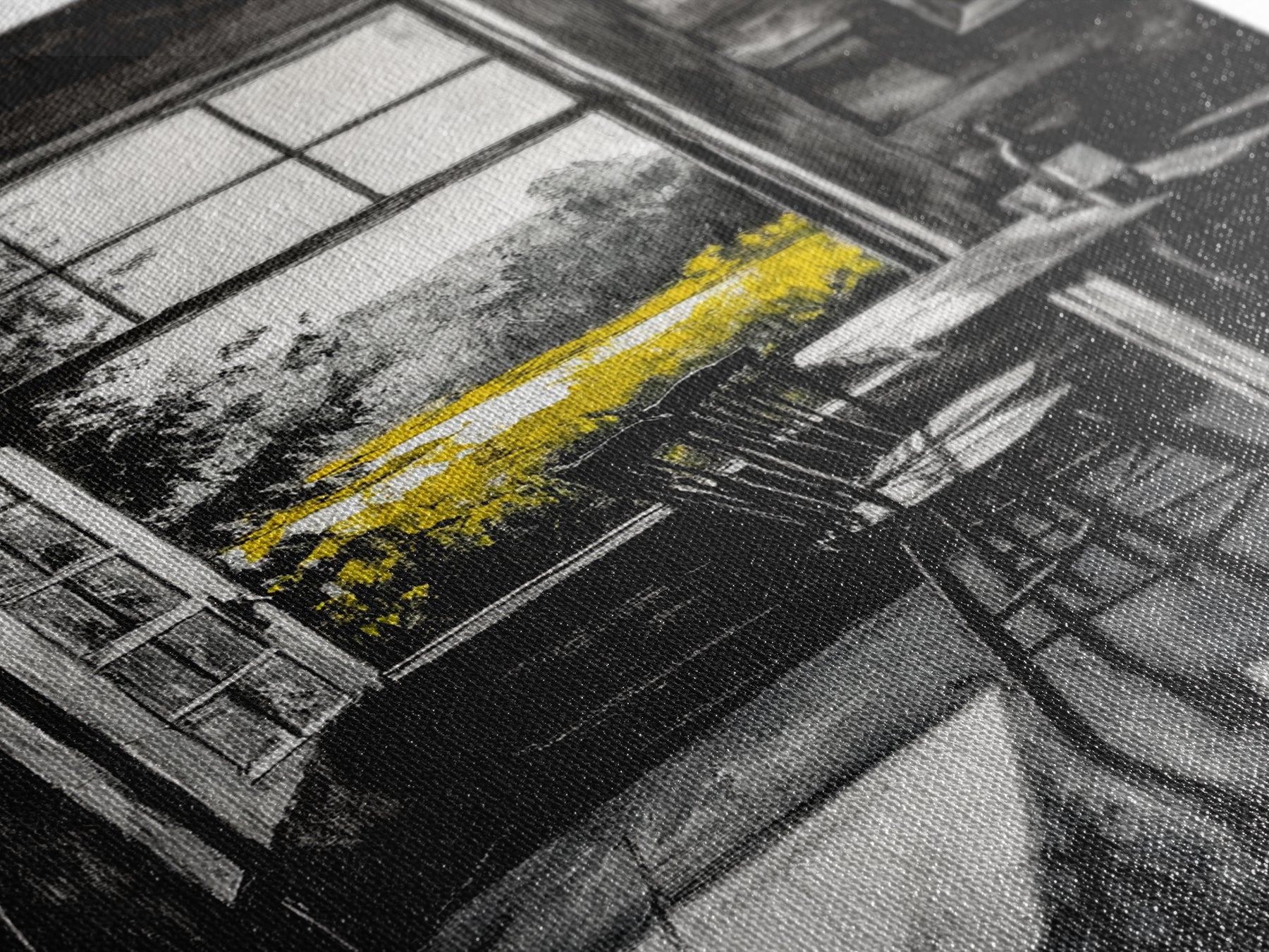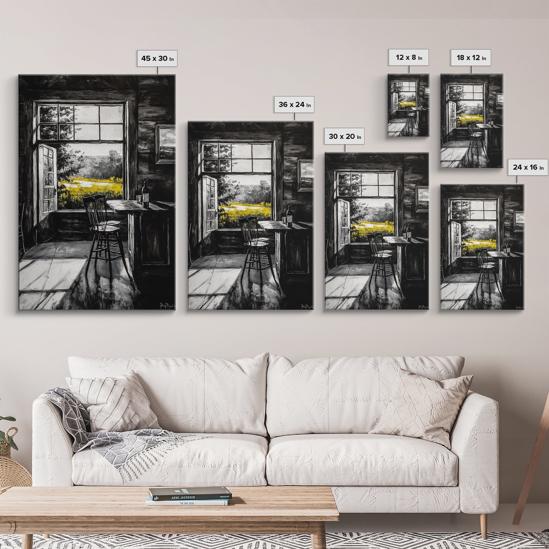 Rustic Cabin View, Black and White with Yellow Accents, Cozy Country Home Art, Framed Canvas Print, Living Room or Dining Room Decor