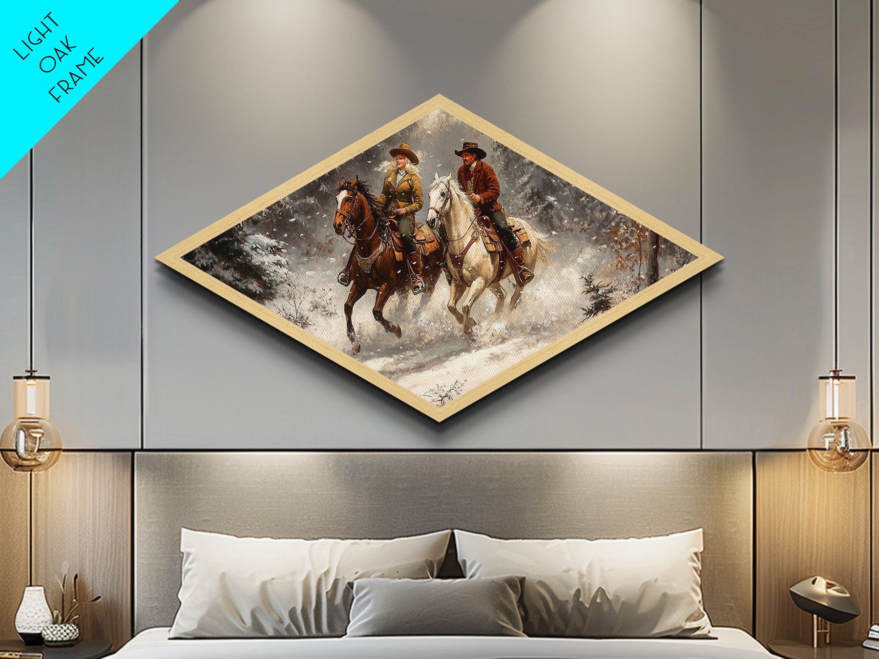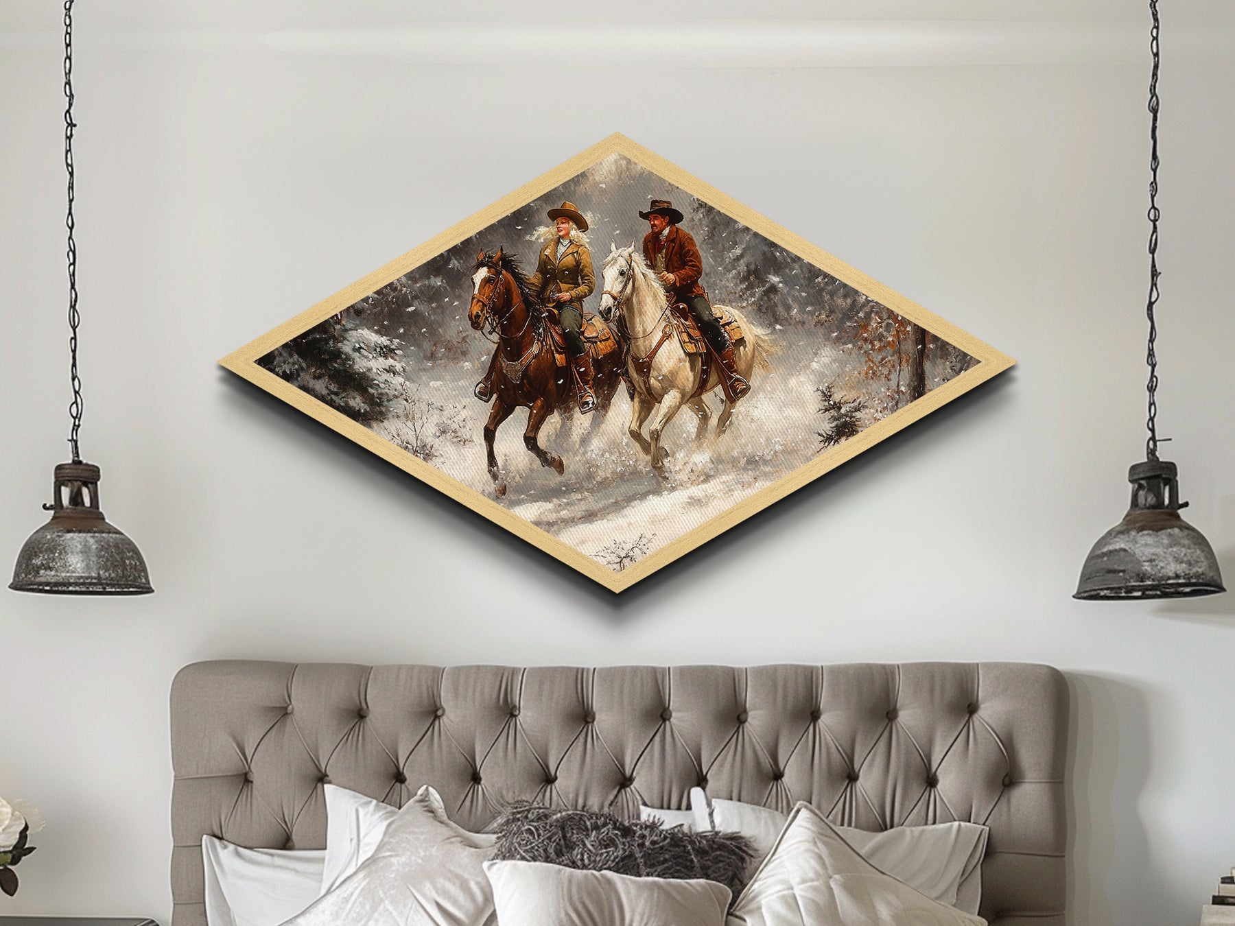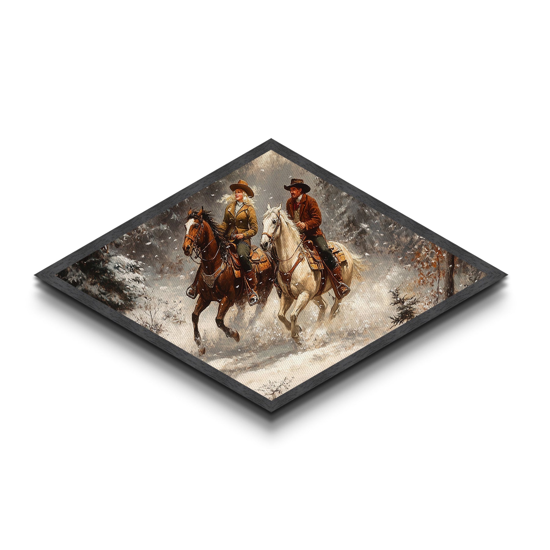 Snowy Ride Together Diamond Shaped Canvas Textured Print rustic winter cowboy wall art lodge decor western cabin Christmas gift