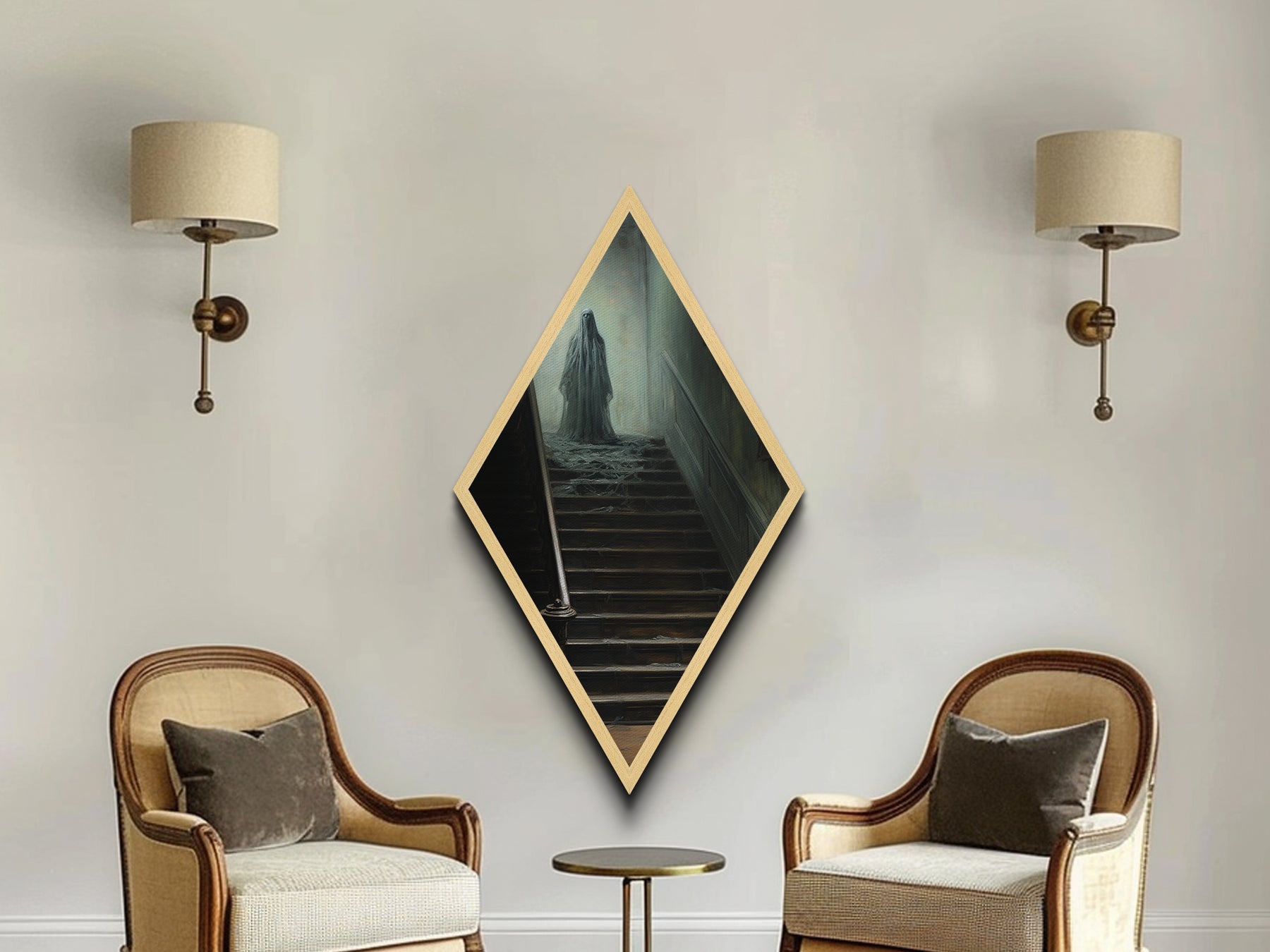 "The Waiting Cold" Haunted Stairwell Ghost Canvas Embossed Print, Diamond Shaped Art for Dark Academia Halloween or Gothic Paranormal Decor