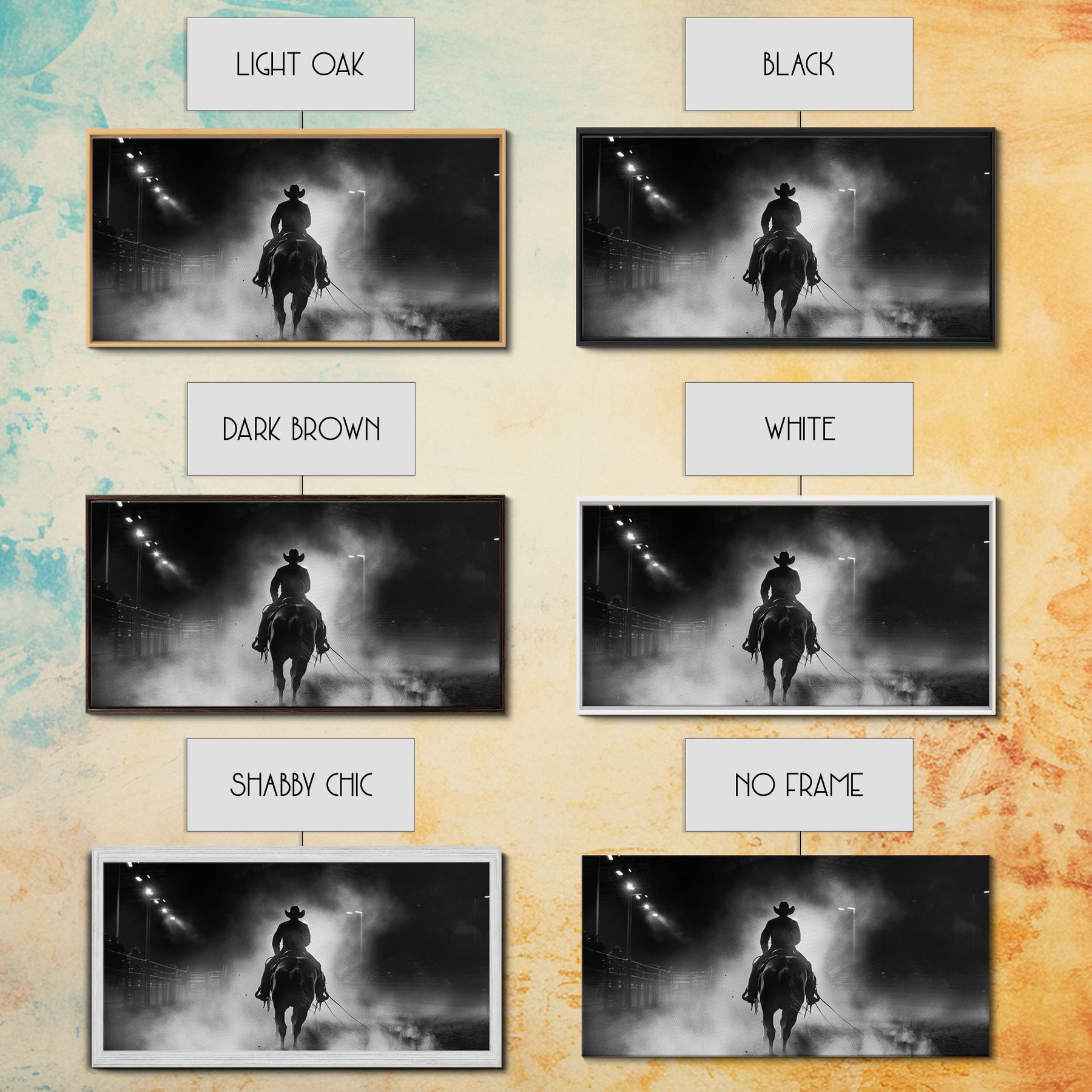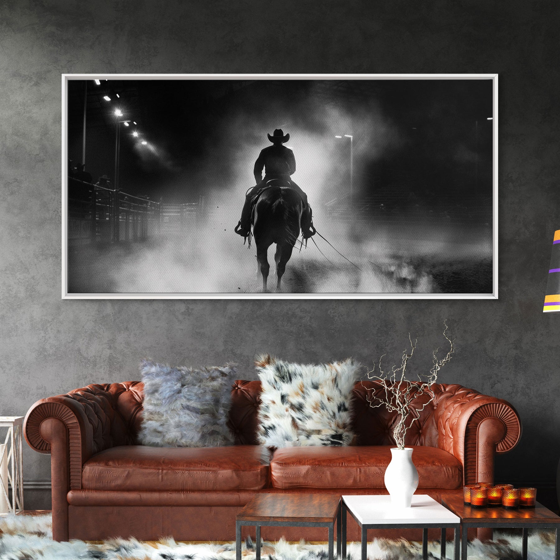 Mysterious Cowboy Riding Through Smoke at Night, Framed Canvas Print for Living Room, Ideal Western Bedroom Decor, Wall Art