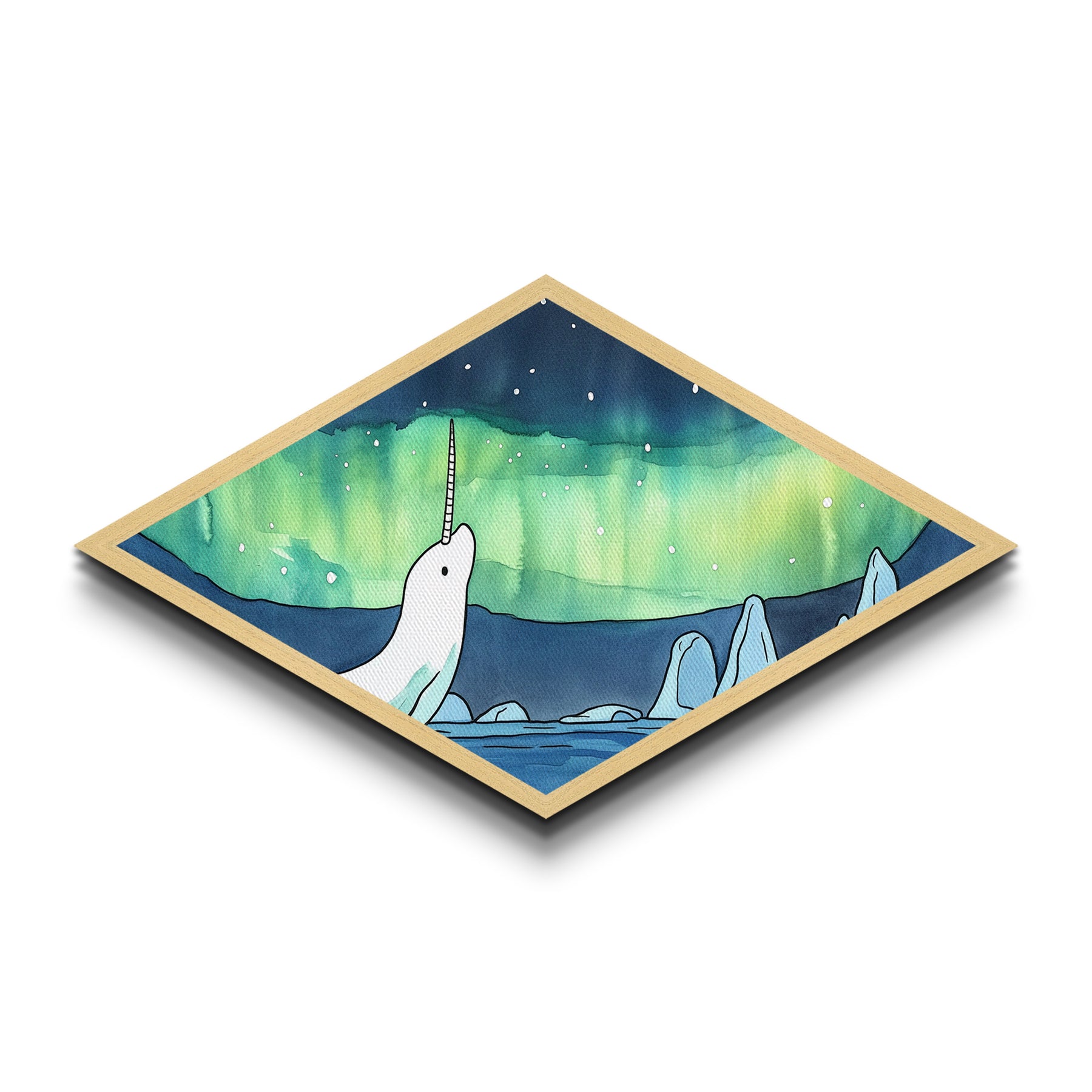 Whimsical Narwhal In The Arctic Canvas Textured Art Print, Diamond Shaped Wall Art, Aurora Borealis Wall Art, Cute Art